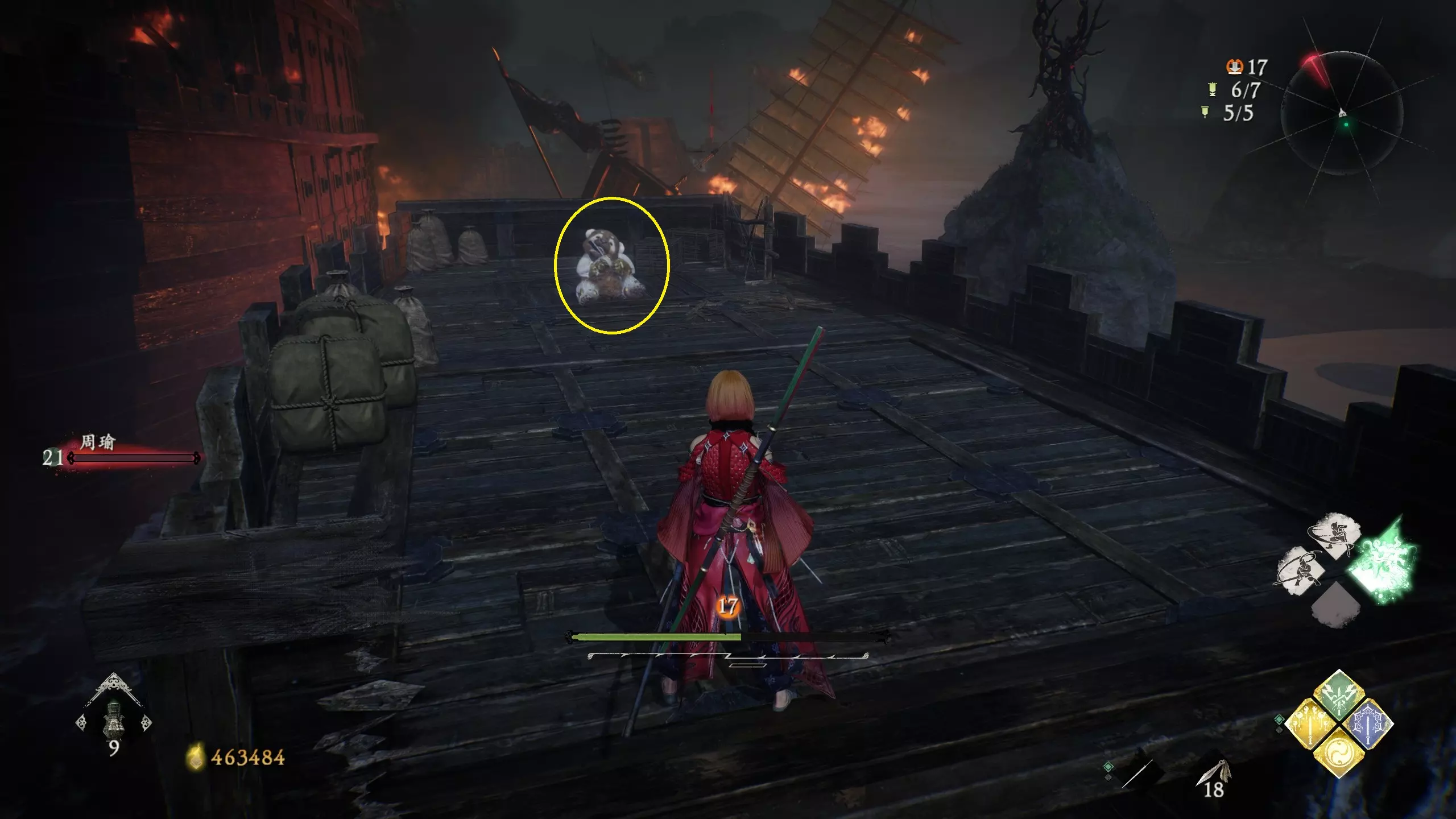 外章二 碧波卷暗潮 从第六个牙旗下到一片开阔区域,正对着一艘着火的大船。从左侧过去,上船到顶层,可以看到一只大号啮铁,扔一次可换两件道具。