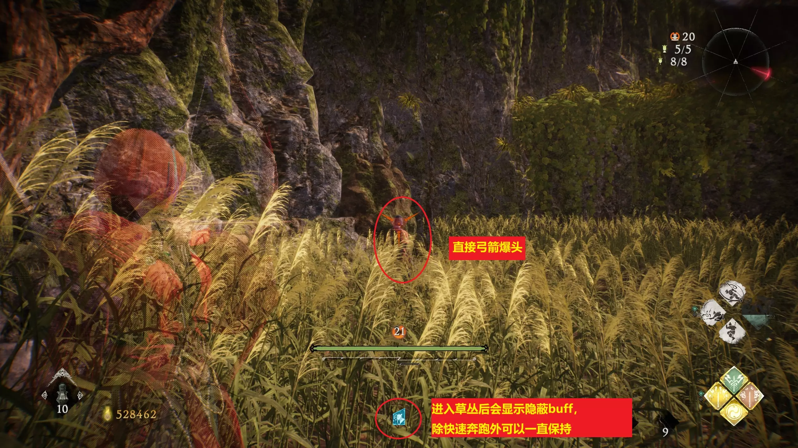 虎视眈眈 在【神亭岭】隐蔽于草丛中击败了5名敌人。 【外章2主线-东莱有义士】中开局前半段部分在草丛使用弓箭等远程武器击杀5次敌人,可通过坐牙旗篝火刷新反复击杀,或直接一次性击杀五名敌人(开局过桥近处有一个,远处有个蹲下的)。因为要求一击必杀,不然则会暴露,所以请提前把远程武器强化到最高。尽量不要去找那种穿盔甲的兵,普通兵爆头击杀即可。