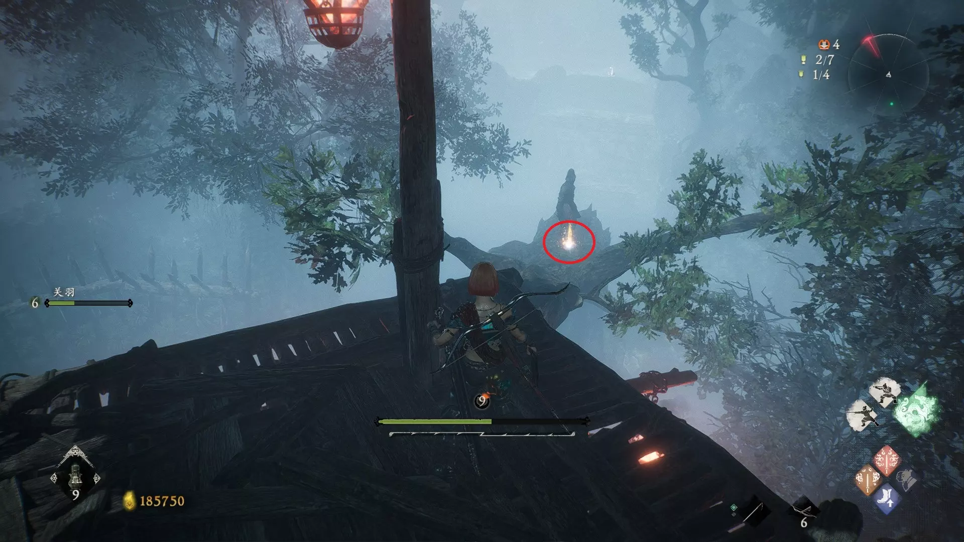 16 第六章 横刀望白马 进入雾区后沿着左侧走,可到达第二个牙旗的背面,然后顺着梯子过桥并右转。路过第一个塔楼后,爬到第二个塔楼上面,即可在树干上看到。