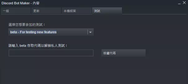 Discord Bot Maker 繁体中文翻译(包含UI、bot.js、Actions) 介绍 这是DBM的繁体中文翻译,本体、bot.js以及动作(actions)均已翻译完成 请注意:在执行任何覆盖档案的动作前,请先备份。 翻译进度 本体界面:完成! 动作(Actions):完成! bot.js:完成! 注意:Actions会更新,部分翻译的Actions为旧版,覆盖前请注意版本。 DBM Mods不在翻译范围内。 如何安装 1.首先,请确保你现在使用的是Old_1.5,只有Old_1.5版本才能使用翻译档案,开启Old_1.5版方式如下(下方的bata请自行代换Old_1.5) 按右方的齿轮,然后点选内容,然后点进测试,开启测试版本。