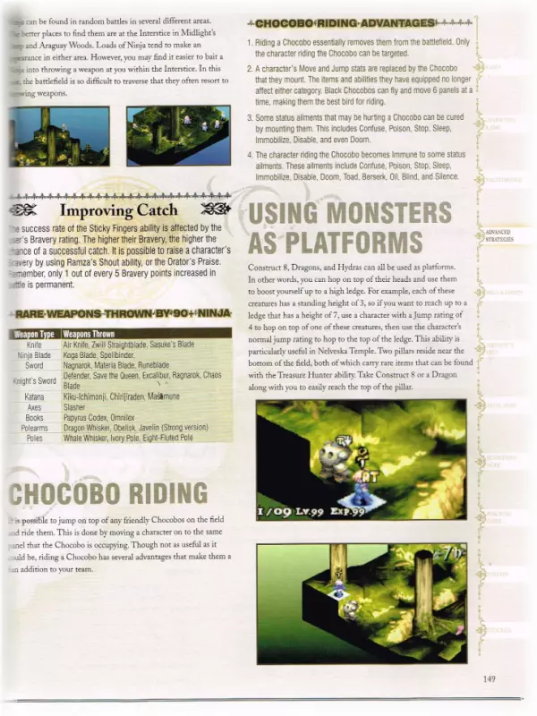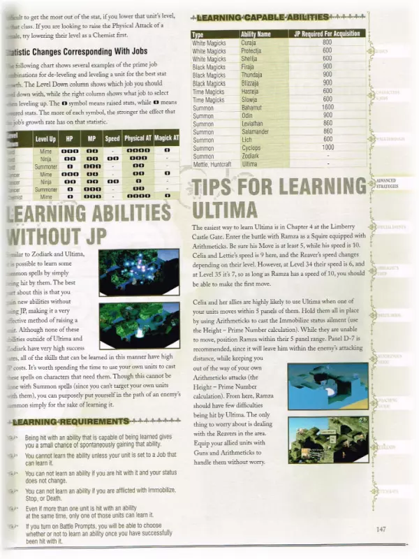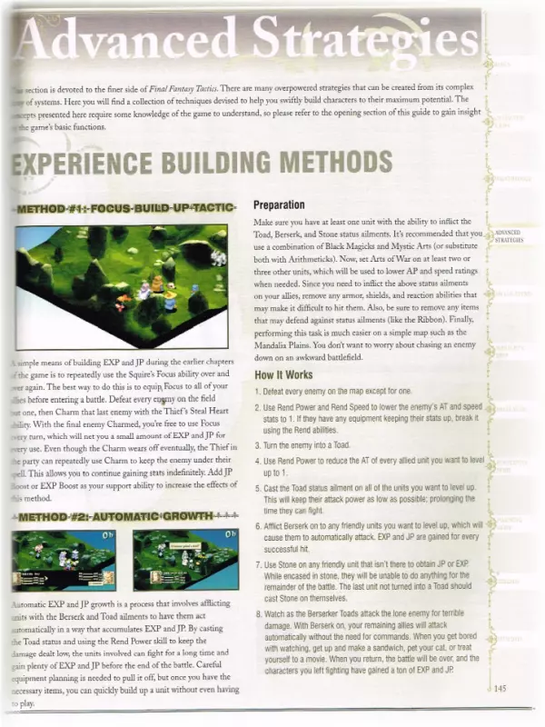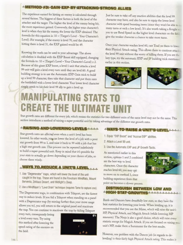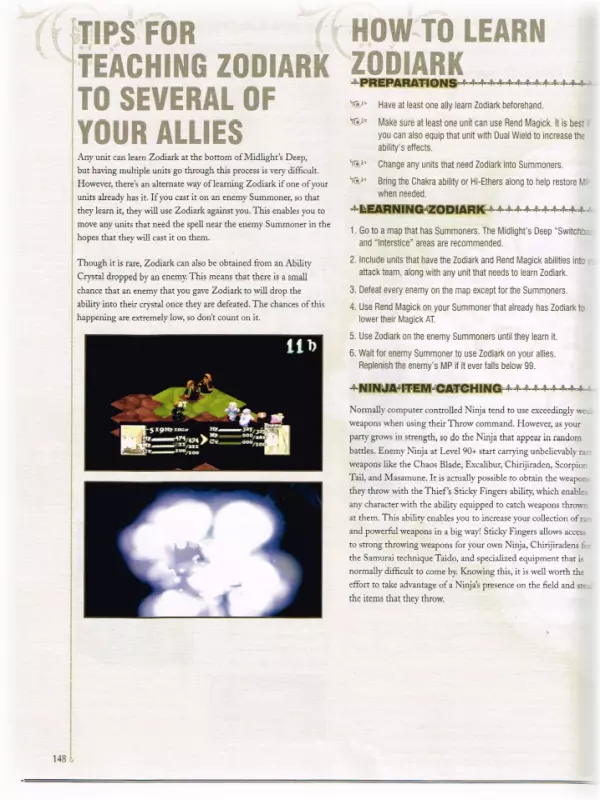 “你的反抗只会让你拥抱死亡!” 在这个【秘密】板块中,你可以找到针对PSX/PSP版本的游戏漏洞/支线任务。 (因此,这些参考信息可能无法在当前版本中正常使用,但出于历史记录目的将予以保留。) γ - () 【漏洞】(以下内容可能不适用于《最终幻想战略版 - 伊瓦利斯编年史》版本) 【复制武器】需要复制的武器必须比任何可购买的武器都弱。 首先,将角色职业改为骑士,并为其装备两把武器。 然后,将待复制的武器装备在角色的副手,主手装备盾牌。进入商店,选择“最佳装备”并购买。你的角色现在应该拥有两把你想要的剑了。 复制武士刀和忍者刀(注意:队伍中必须有奥兰多才能执行此技巧。) 要复制的剑必须比任何可购买的其他剑都弱。将奥兰多切换到他的初始职业,并为他装备两把剑。然后,在他的副手装备要复制的剑,主手装备盾牌。前往商店,选择【最佳装备】并购买。你的角色现在应该拥有两把你想要的剑了。 复制武器 为任意角色设置忍者的【二刀流】技能。在他们的右手装备盾牌,左手装备你想要复制的物品。现在前往出售你想要复制物品的商店,选择【最佳装备】并购买它们。接下来,进入编队界面并卸下这些物品。### 支线任务(狮子战争) (游戏的首批支线任务在第四章开始时解锁) 阿格莉亚斯的生日 解锁条件:完成第32场战斗 - 里奥瓦内斯城城门之后 需求:500,000吉尔 需求(角色):队伍中需有艾丽西亚、拉维安、穆斯塔迪奥·布南萨和阿格莉亚斯·奥克斯女士 奖励:蒂娜 Rouge 奖励(角色):无 盗窃频发 解锁条件:完成第34场战斗 - 里奥瓦内斯城屋顶之后 需求:无 需求(角色):无 奖励:幻影背心、天津四 奖励(角色):巴尔弗雷(空贼) 教会的混乱 解锁条件:完成第49场战斗 - 伊格罗斯城城堡主楼之后 需求:无 需求(角色):队伍中需有阿格莉亚斯·奥克斯女士 奖励:发带、忍者装备、帝王盾牌、威尼斯盾牌、烈焰枪、寒冰枪、佐助的刀 奖励(角色):【莱昂内尔的新领主】 解锁条件:完成第49场战斗 - 伊格罗斯城塞之后 需求:完成支线任务【被诅咒的内尔维斯卡岛】 角色需求:队伍中拥有贝奥武夫·卡德姆斯和 Reis Duelar 奖励:卡楚莎发饰、贝雷帽、源氏铠甲、诱惑香水、魔法护符(2个)、正宗刀、宙斯之锤 角色奖励:无现在你应该拥有两个原本在左手的物品了。例如,要复制【埃克斯卡利伯(Excaliber)】,前往利昂内尔城堡的商店。你只需花费10金币就能获得第二把埃克斯卡利伯。 全体治愈:要在战斗中治愈你的队伍,首先将战斗模式设为主动。然后对你的队伍施放【恢复(Regain)】。在施放恢复之后、下一个法术之前,打开PS主机的仓门。战斗会停止,但恢复效果不会中断。 获取更多金币:当你刚从士兵事务所招募到新成员时,给他们配备他们能装备的最好物品!然后前往酒吧接受委托!派遣三名队员能获得大量金币!如果不派遣三名队员,你大约能获得40-50金币。如果派遣三名队员,你大约能获得100-150金币! 获取新怪物:警告!你必须是【冥想者(meditator)】才能使用这个提示。当你是一名冥想者时,学习一种名为【训练】的技能!然后进入物品栏,将其更换为【训练】!当你在战斗中(并且你想要那只怪物),且怪物生命值所剩不多(比如50-40点生命值)时,让学会【训练】的角色攻击它,之后屏幕上会显示【已驯服】并伴有略微不同的音乐! 获取新技能/物品:当你与大约4-5个敌人战斗时,只将其中一个敌人削弱到极低的生命值,比如10点左右!然后在这个被削弱的敌人躲起来时,消灭其他所有敌人。 当其他敌人都被消灭后,那个被削弱的敌人会出来攻击。在从怪物身上获得所有东西之前,不要攻击它!(除非计时器倒数到0,否则你无法获得任何东西。当计时器归零时,它们会变成水晶或宝箱!)永久提升信仰与勇气等级 方法其实很简单,但需要花费大量时间。只需让某个角色成为【调停者】,并让其对任意角色施放【赞扬】或【布道】。如果成功,目标的对应等级会提升4点,但有时会失败。在战斗结束前持续进行此操作。之后进入【编队】界面,查看被施加【赞扬】或【布道】的角色等级。通常对于【拉姆扎】而言,战斗中每提升4点等级,其永久属性就会增加1点,不过其他角色可能有所不同。这个过程耗时很长,但我已经将【拉姆扎】的勇气等级提升到98,信仰等级提升到97。信仰等级的作用是增强法术伤害,让【计算者】职业更加危险,不过我还不清楚勇气等级的具体作用。警告:除了拉姆扎外,如果你将其他任何角色的等级提升过高,他/她会让你跪下祈祷。如果他们的等级过高,就会离开队伍,并且你会失去他们身上的所有物品,所以当等级开始接近90级时,一定要记得存档。 秒杀不死生物:要立即杀死不死生物(食尸鬼、骷髅等),只需对它们使用凤凰之羽。你永远不会失手,它们会立即死亡!(注意:用这种方式杀死不死生物后会出现一个计时器。如果在计时器归零前没有完成游戏,不死生物将会复活。) 轻松战斗:在进入与那个会暗夜剑的家伙战斗前——我不知道他的名字,但他穿着棕色盔甲。这场战斗发生在齐力科瀑布。进入前拿走他所有的武器、盔甲等装备。这样他就无法对你或其他人使用夜刃了。 获取稀有技能【寻宝】:当获取游戏中散布的【寻宝】技能时,站在隐藏有该技能的面板上并降低你的勇气值,这会增加获得稀有物品的几率。 获取强力武器:进入深层迷宫(或在深层迷
