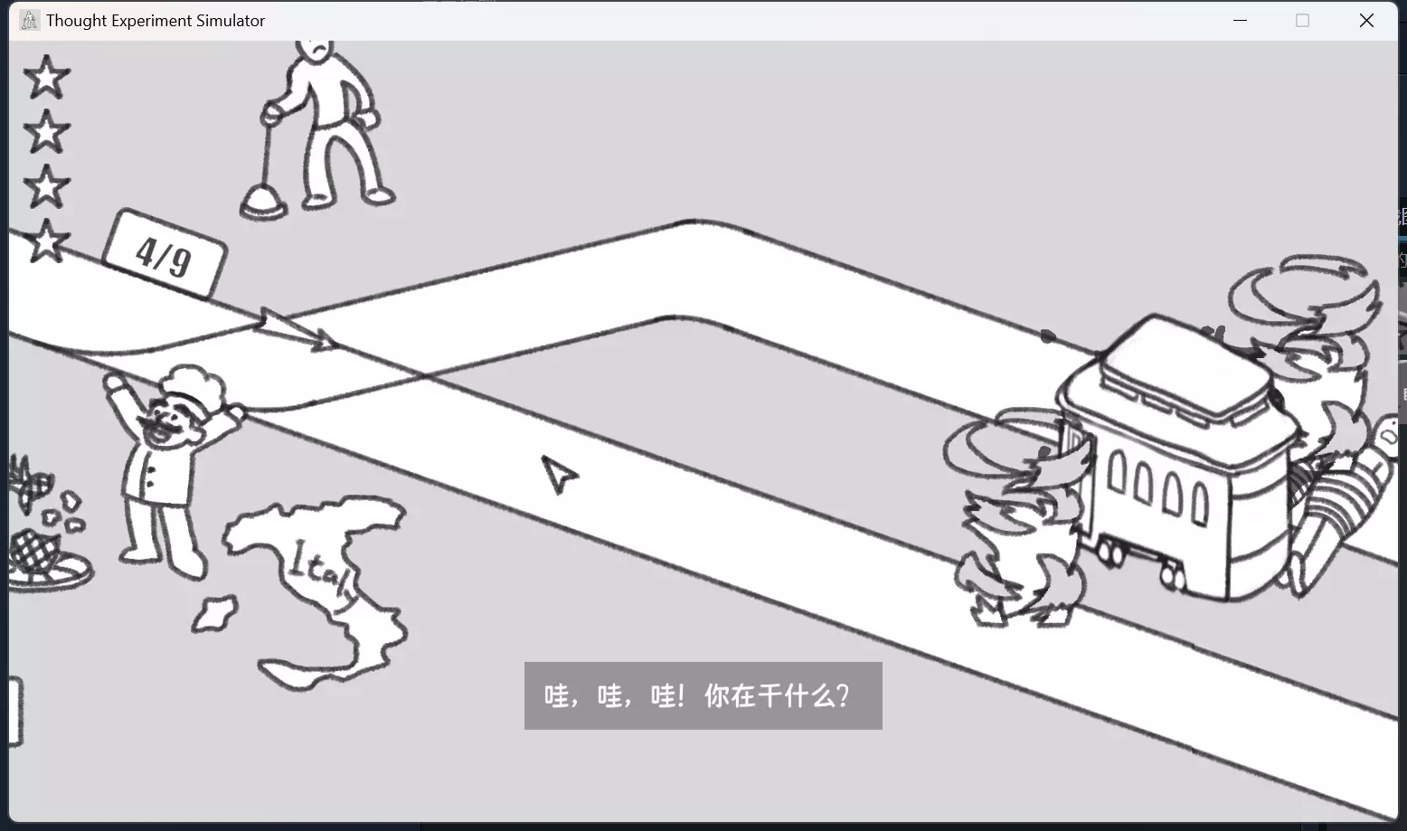 终于全成就了!个人记录贴,另外感觉作者的哲学故事还挺有意思的,跨越古今中外哲学家们的对话好喜欢。 电车难题 无为而治:正常驶入,不操作拉杆; 自由意志?:操作一次拉杆; 暴风吸入:在电车问题第六关,也就是外星人和恐龙问题上,选择撞外星人; 漂移!!!:需要卡一下位置,首先需要把箭头调到右侧车道,然后在电车刚驶入右侧车道时,立刻调整车道方向。大概是这样,车头拐了,但车身还没驶入。