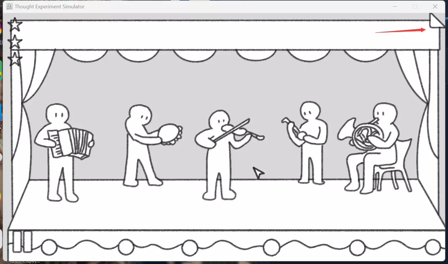 多试几次就好了,可能需要再早一点↑?反正就是刚拐弯,就立刻拉拉杆 布里丹之驴 死亡:鼠标拖动驴到干草/水桶撑死。或者等时间结束自然死亡 奇幻的死亡:第一次死亡后会解锁道具,随便用一个就好 (可恶打分只能10分!!!!!) 各种奇幻的死亡:如名字所示,把所有道具用一遍 缸中之脑 逃脱了?左边的箭头点开后,点击屏幕右下角的【锁】图标,消消乐结束获得成就【找到大脑了】;右边的箭头打开,蓝色+蓝色,获得成就(感觉药水调配很有意思)。 意大利攻击:人物左下角有个拉链点击即可。 西西弗斯 周而复始:成功上山1次 周——而复始:上山5次(成就图标就是五个球) 周————而复始:上山10次(十个球) 掘地求升(隐藏成就):从第二次起,西西弗斯就会带个帽子出现,旁白也会特地提起这个帽子,点击会让帽子掉落,应该是连续掉落四次会跳成就。(小游戏很好玩!推荐逆时针挥舞锤子) 囚徒困境 应该是随机的,因为不能控制对方的选择。随即点几下就都跳了 (这是我最喜欢的一个了!赌徒超爱!) 无知之幕 分配公平:一开始15枚金币。每个人给3枚 穷困潦倒:自己1枚金币也拿不到(推荐一开始就把15枚一直给一个人) 非常规之幕:攒够10金币,点击小猪存钱罐,开启你的非常规之幕旅途吧! 赢者通吃(隐藏成就):自己获得15枚金币(大概率穷困潦倒) 连锁悖论 不是一堆:直接收集至少1颗等死结算就好 一堆:多跑跑,我大概收集了5个轮回(?)很简单的小游戏多玩会然后结算就有了 秘密房间:开始就按A或者鼠标左键。就会获得小彩蛋!可爱的作者 无限猴子 好猴子:一直按按钮,直到屏幕随机打出MONKEY来。再来一次:持续按键,直到随机出现屏幕要求的字母/图案。 超级大香蕉:在右侧界面找到刻有香蕉图案的光盘,将其拖到主机的读卡器(即竖着的长条状接口),随后开启【无限模式】,等待合成大香蕉,最大尺寸为XXXXL。 小淘气:点击拔掉主机USB接口上的数据线。 知名小提琴家 慈悲:点击乐器,通过玩接水管小游戏救活音乐家。 我们热爱音乐:参与问答环节,第一个问题必须选择【√】。 多彩的旅程:参与问答环节,第一个问题必须选择【×】。 幕后(隐藏成就):在【热爱音乐】的感谢表演过程中,可点击右上角的折页区域。