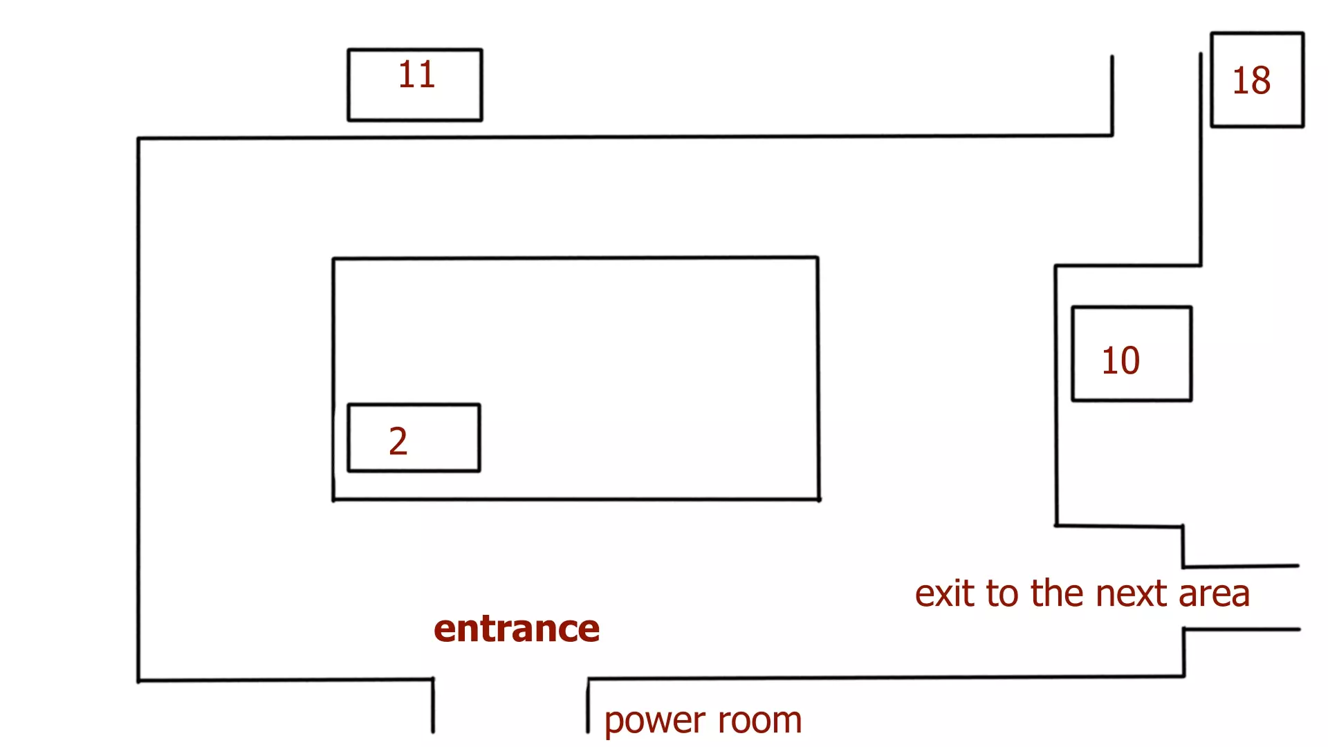 在该区域,你需要执行以下操作: 1. 前往11号房间:从床上拿起18号房钥匙卡,从桌上拿起写有“Gyro”字样的纸片,并拿起2号房钥匙卡。 2. 前往2号房间,将你的妹妹放在那里的暂停按钮上。 3. 前往18号房间,与那里的暂停按钮互动。 4. 前往10号房间。 参考这张画得不太好的地图。