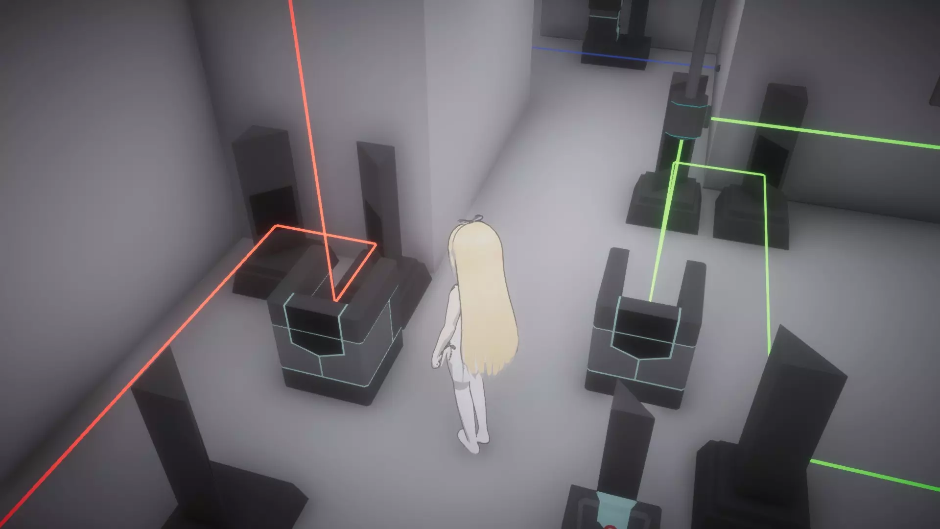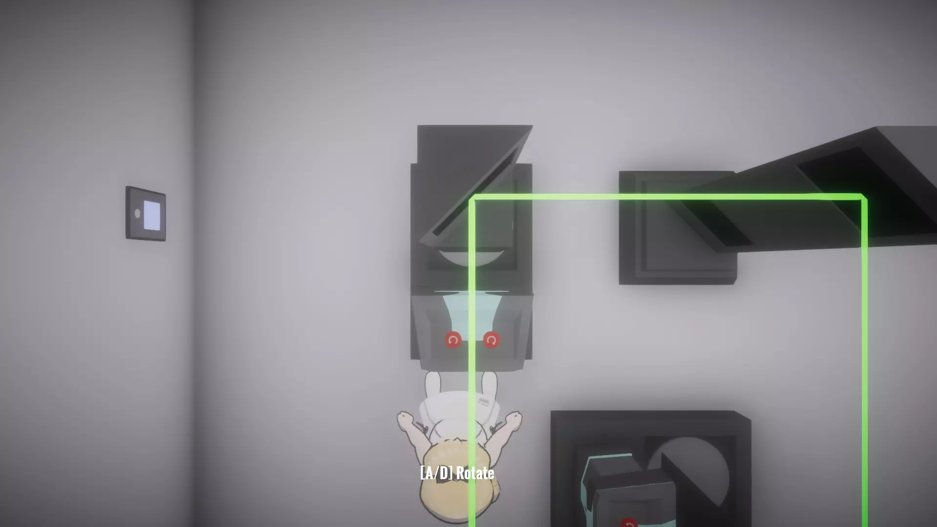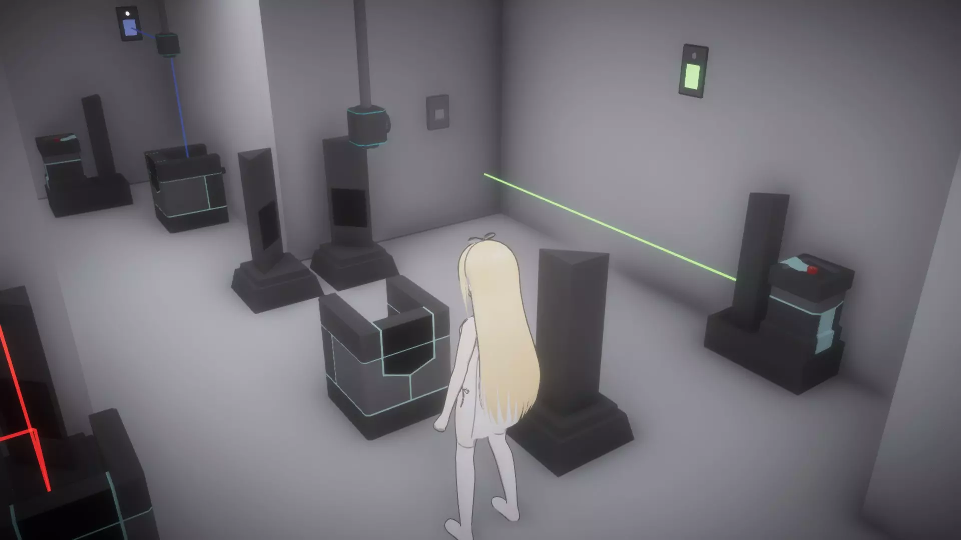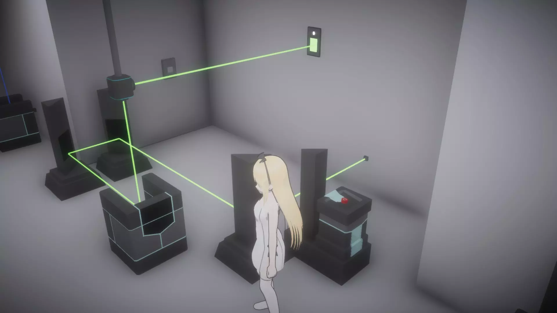 在恢复所有物品前按住按钮房间,让你的另一个姐妹进入下一个谜题,就像最后一张截图那样。这里需要同时解开蓝色和绿色激光才能打开出口。 大厅房间4谜题的解法: