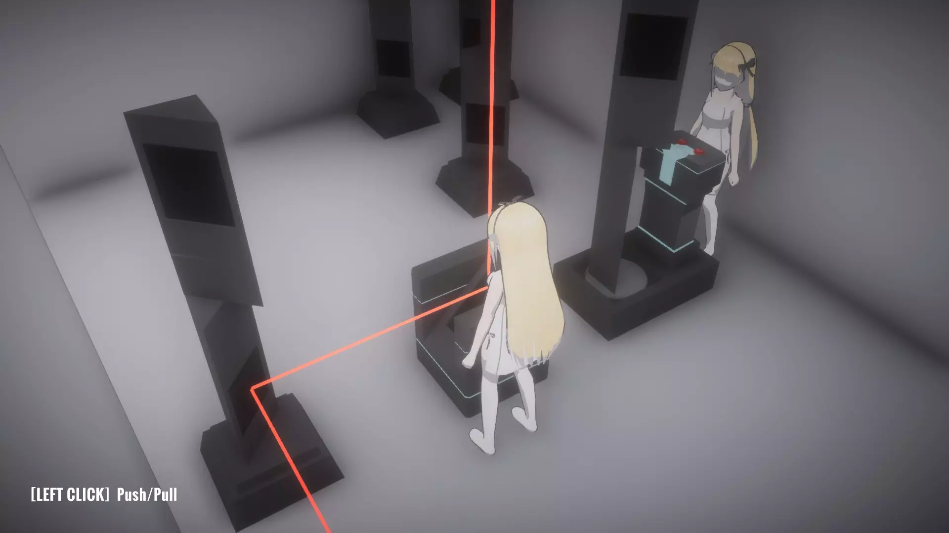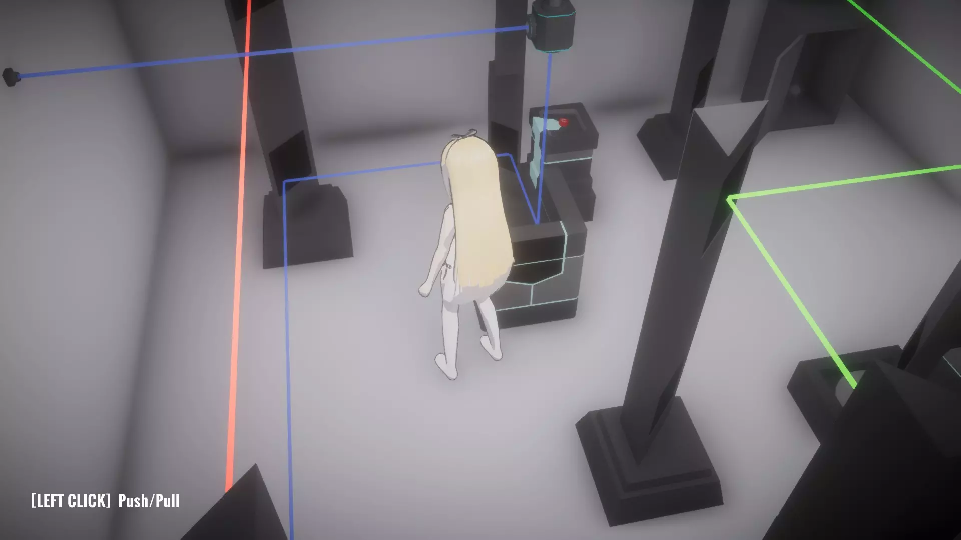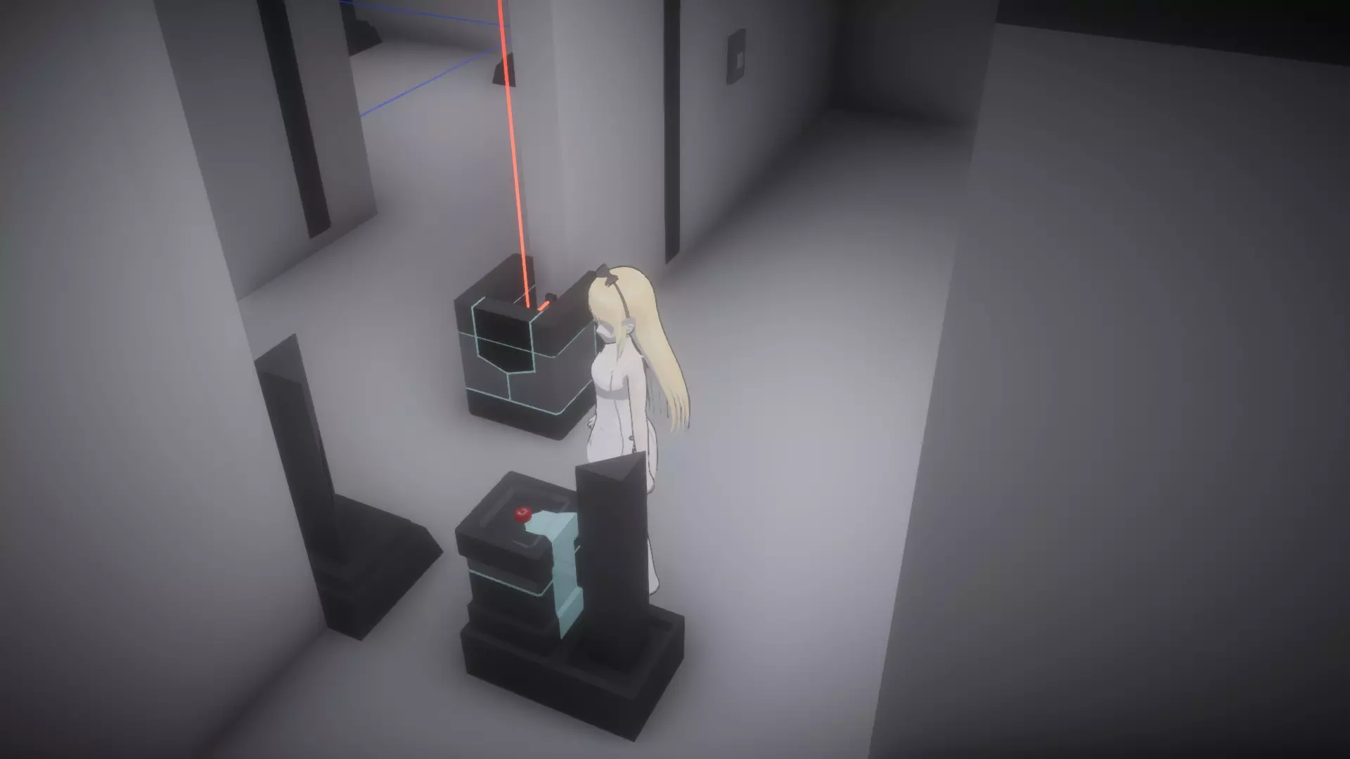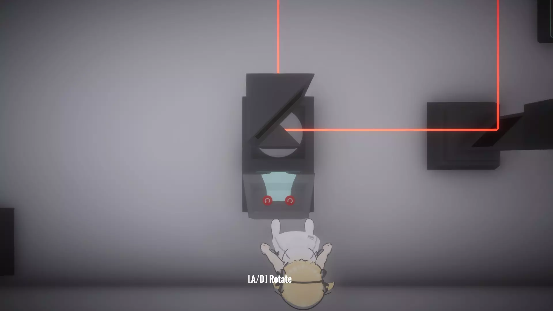 在恢复所有物品前按住按钮房间,让你的另一个姐妹进入下一个谜题,就像最后一张截图那样。这里需要同时解开蓝色和绿色激光才能打开出口。 大厅房间4谜题的解法: