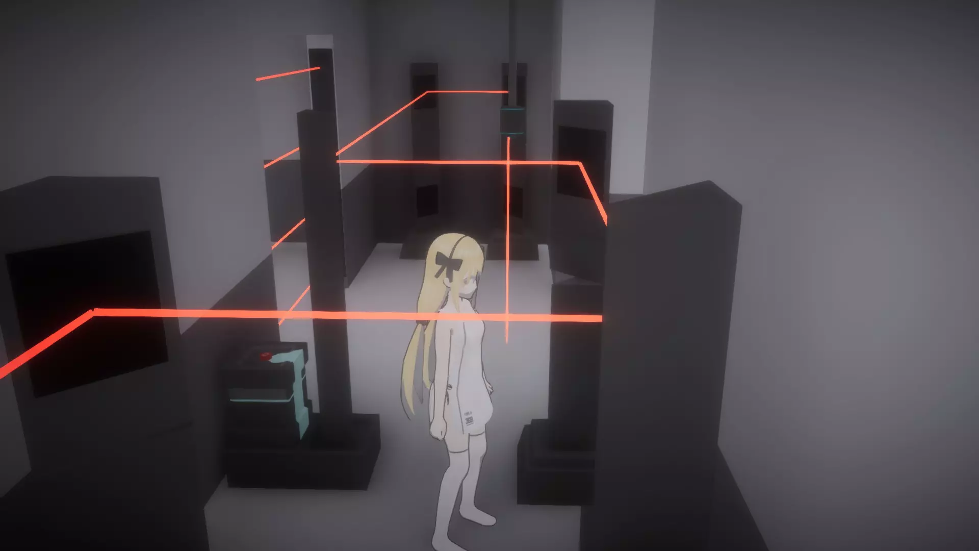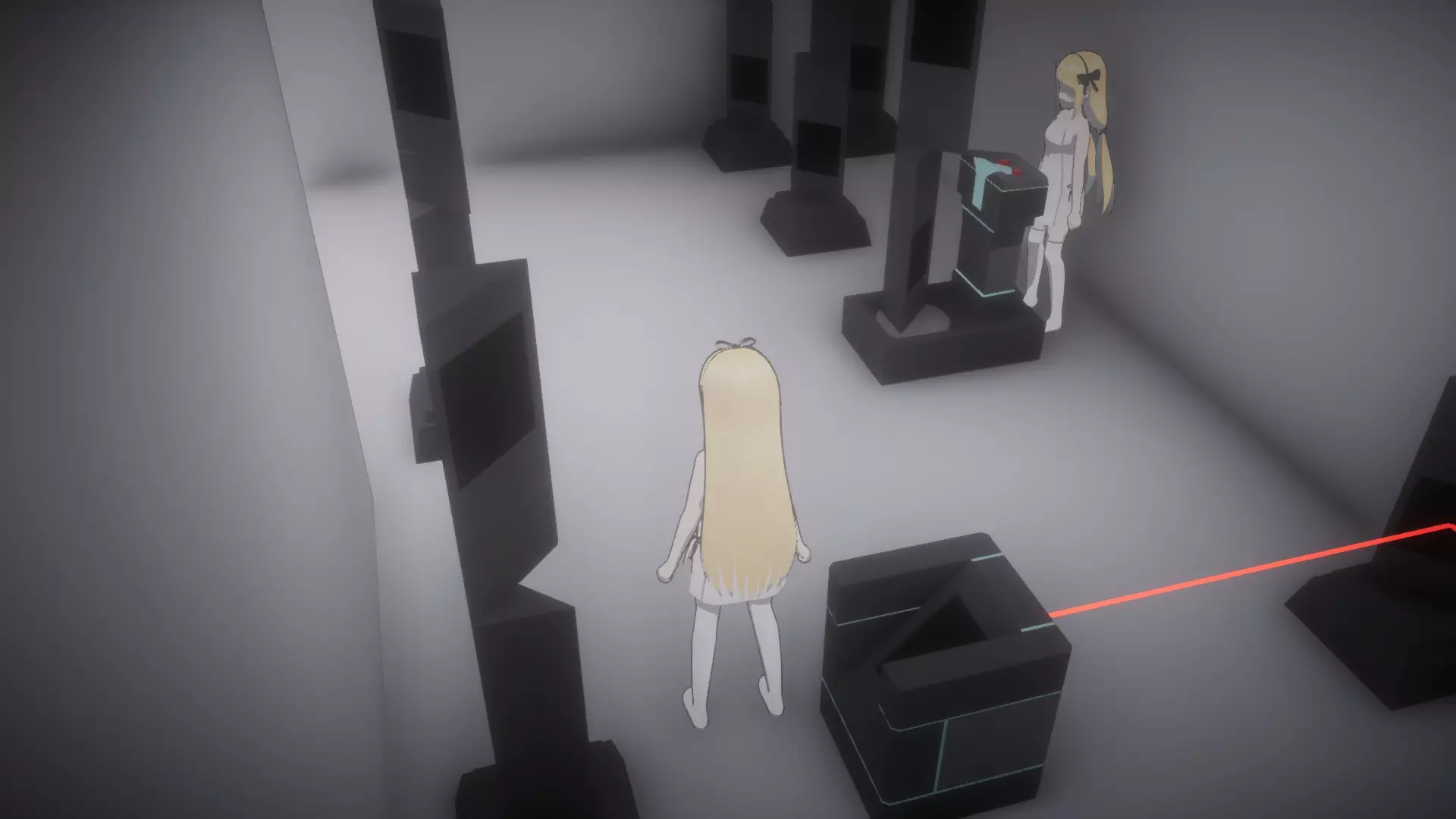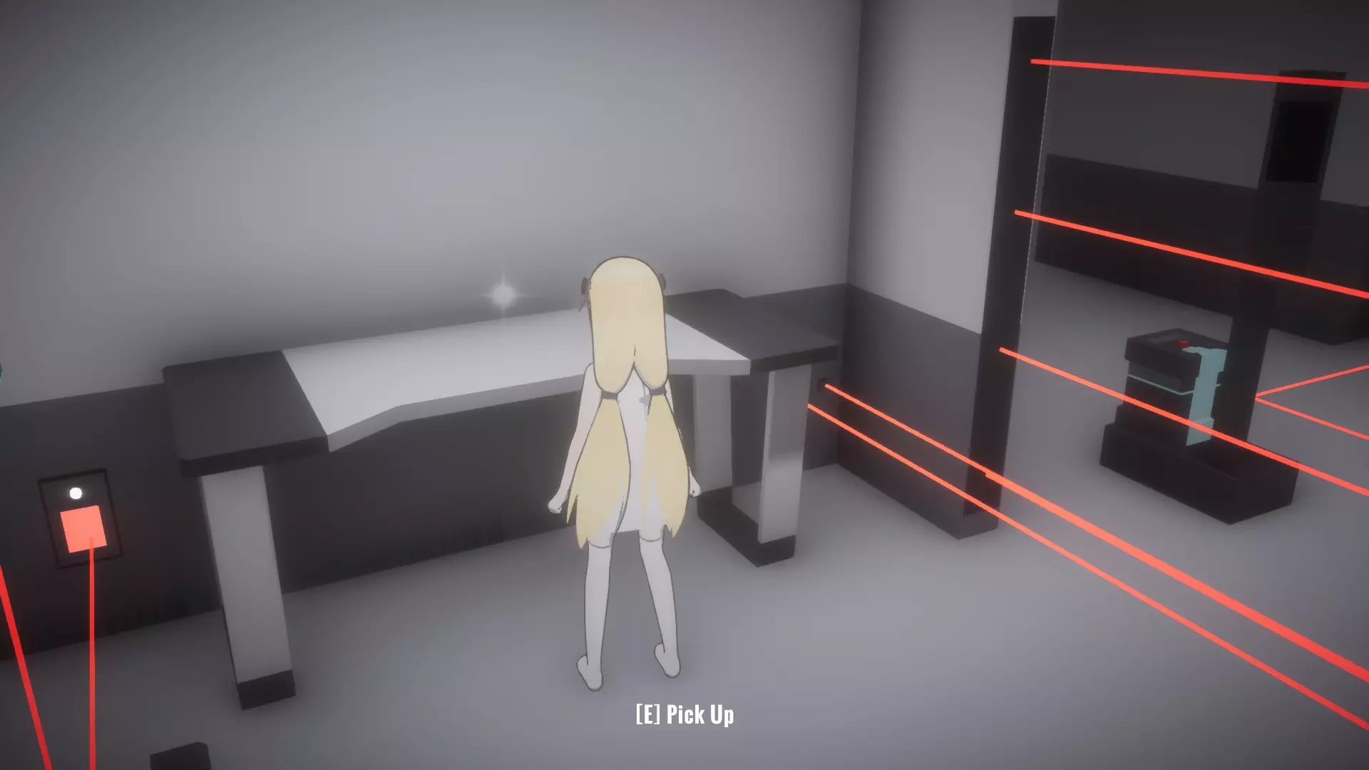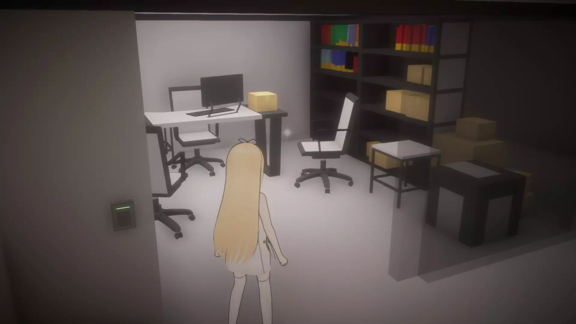 与密室中的电脑互动,输入密码:39785(可通过与同一房间内的书架互动获得)。 从刚刚移动过的其中一个书架旁的角落拿起【受限区域门禁卡2】。离开房间回到走廊(别忘了带上按住按钮的妹妹,因为她可能没有离开简报室的门禁卡),然后向前跑过3号安保摄像头,直到抵达监控室门口。