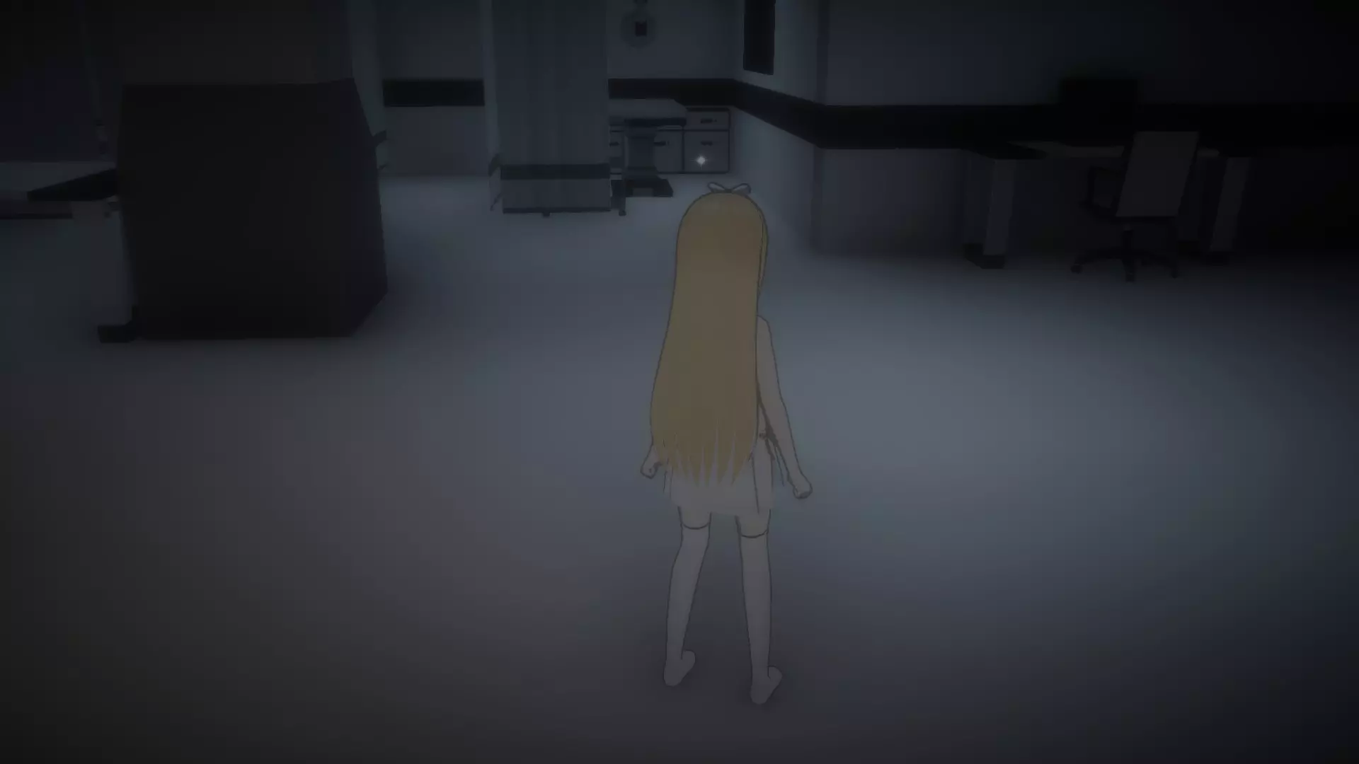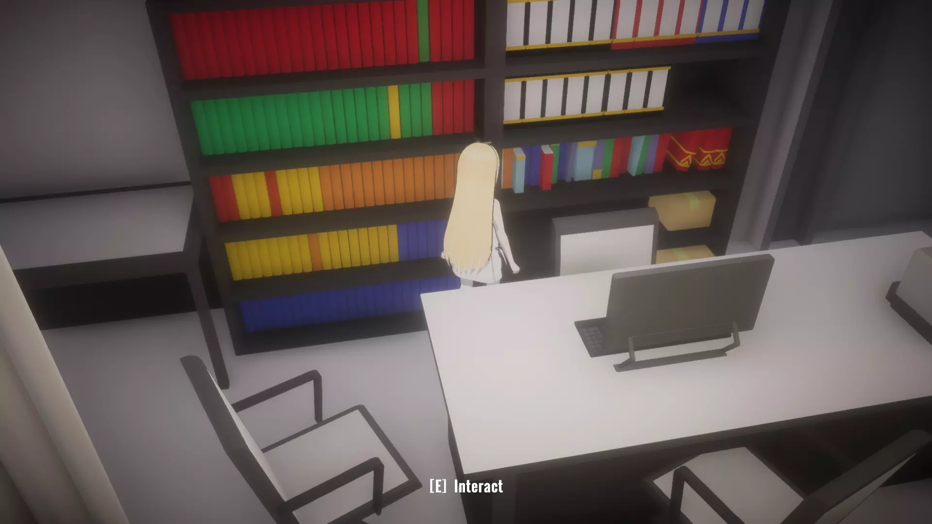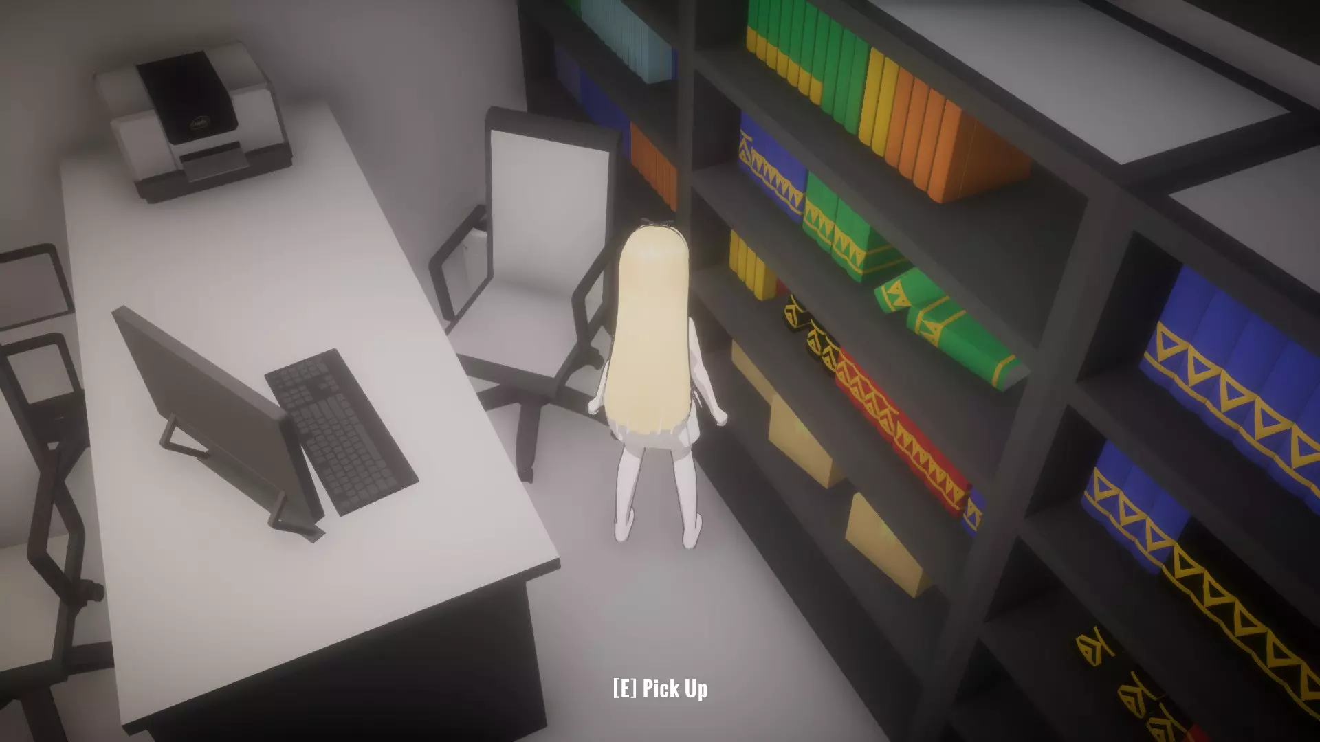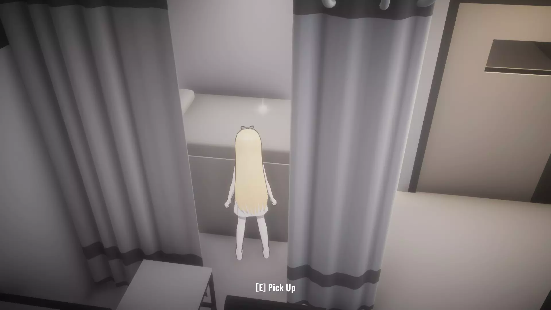 然后走到书桌椅子旁边,拿起未知钥匙。它不像其他物品那样有闪光高亮,但当你靠近时,应该会看到【E】拾取的提示。