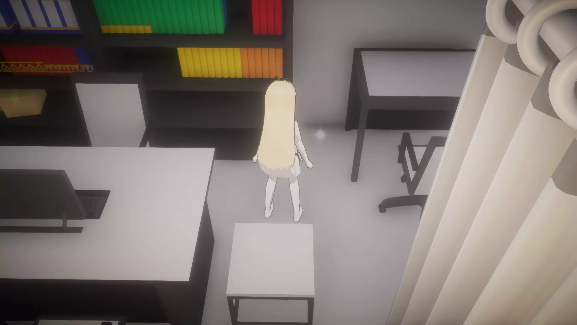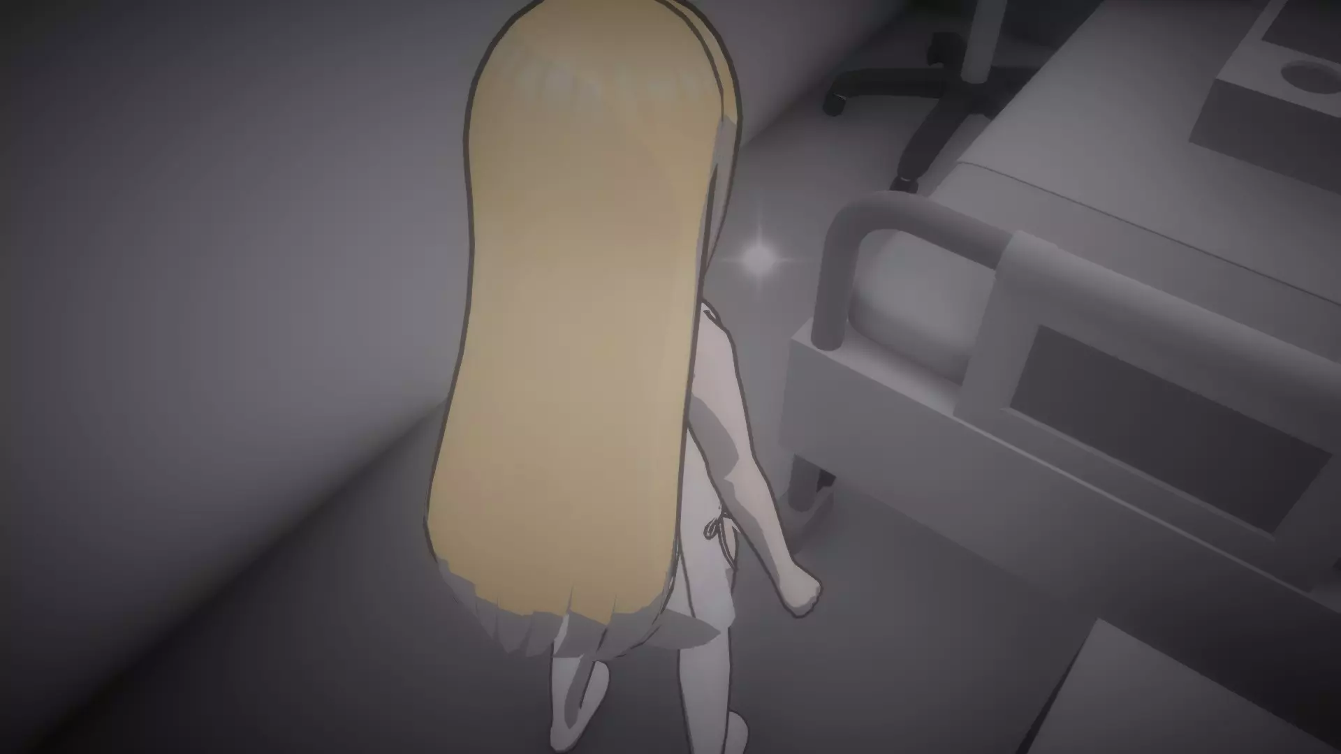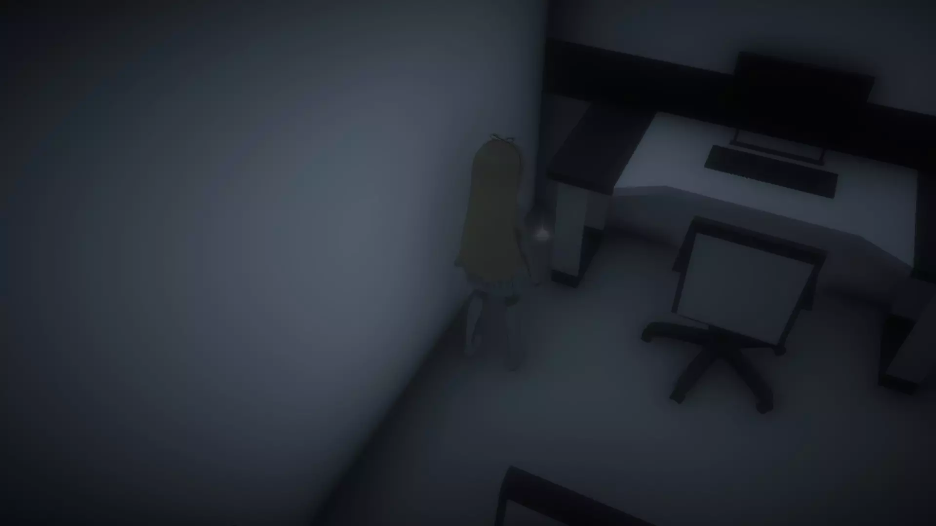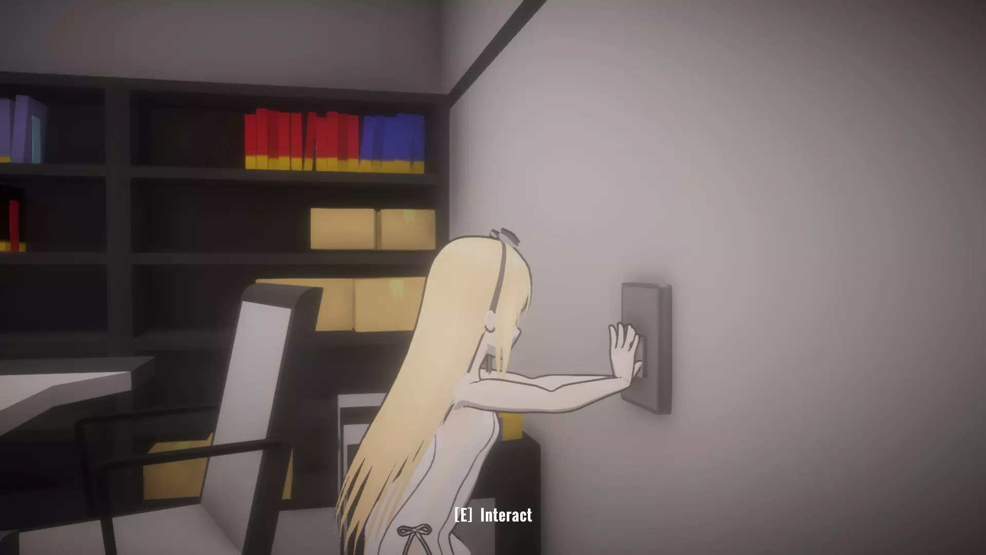 然后走到书桌椅子旁边,拿起未知钥匙。它不像其他物品那样有闪光高亮,但当你靠近时,应该会看到【E】拾取的提示。