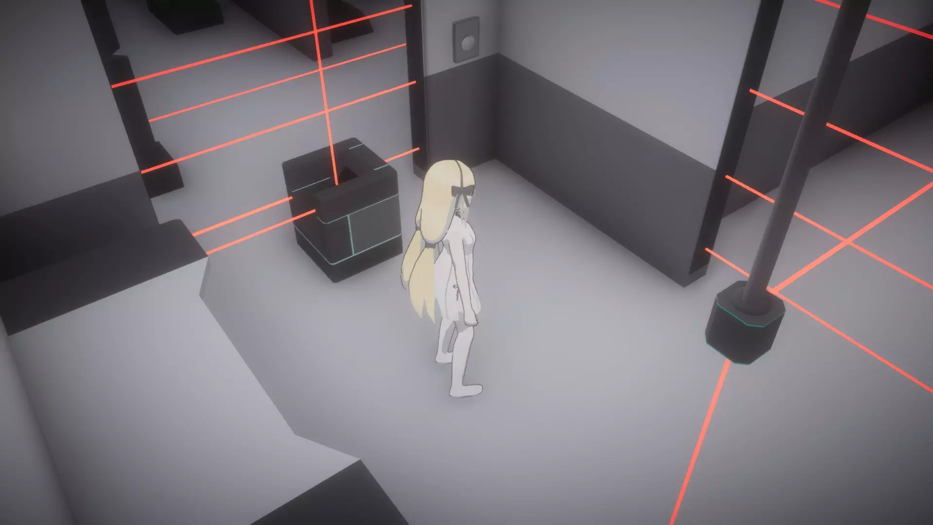 走出卫生间,继续往前走:你的左侧会看到激光,现在唯一的路是向右转,进入那里,但要小心不要进入安全摄像头的视野范围。继续前进,你会进入另一个有房间的区域。