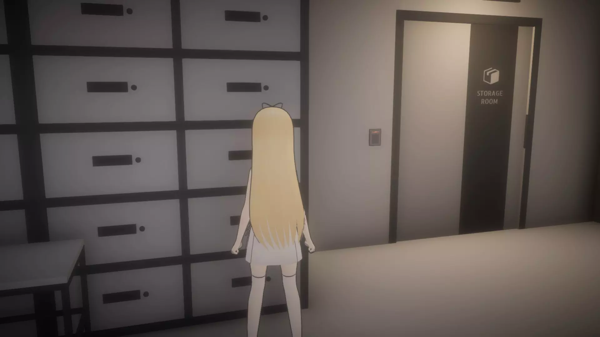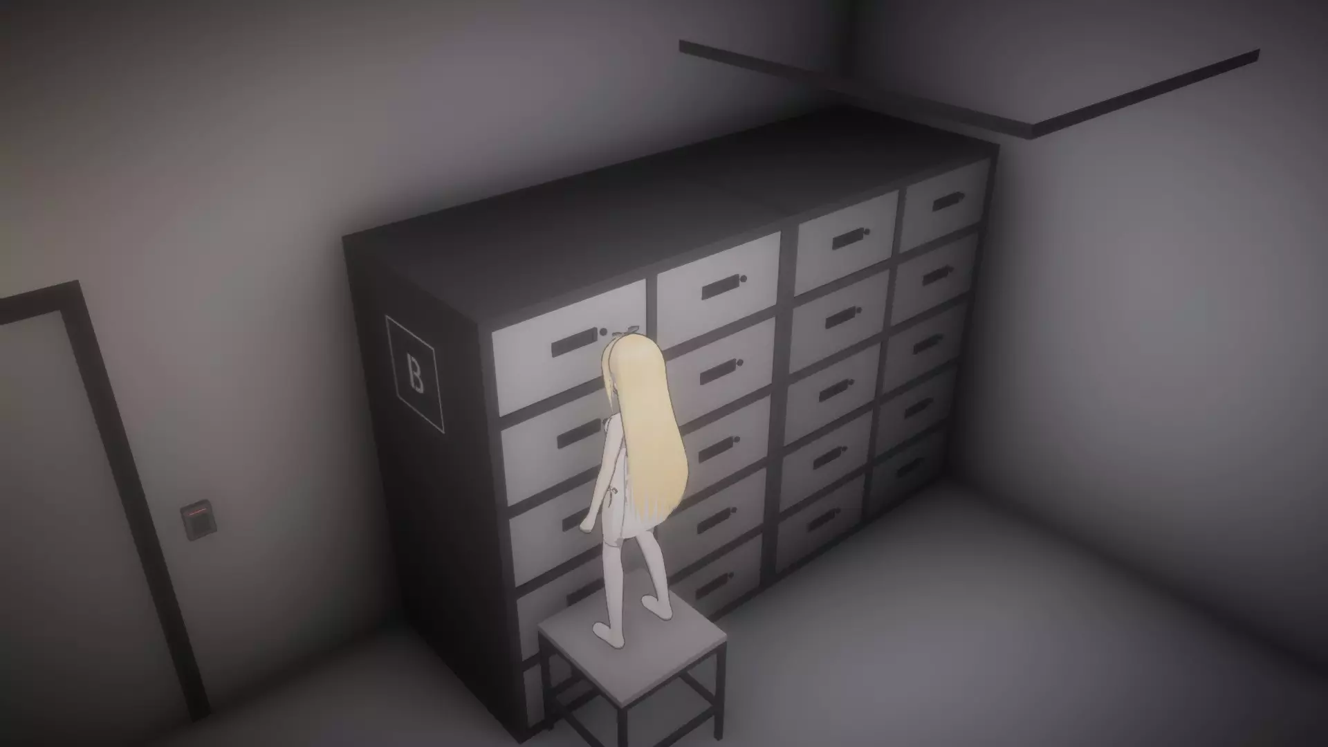 回到走廊,向左走,前往右侧的第二扇门(储藏室)。 进入储藏室后,将椅子拉到大型B储物柜的左侧,站到椅子上,与储物柜互动以获取生物员工门禁卡。