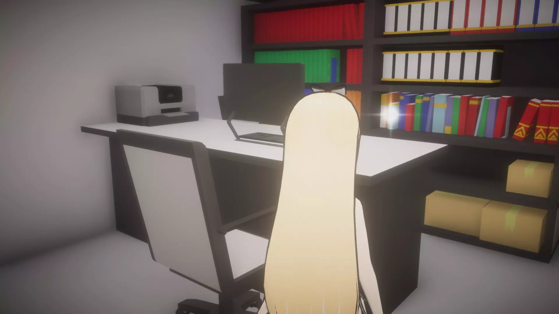 向左走进入档案室1,在这个房间里,从你左边的桌子上拿起【书本2】。转身进入有电脑的房间,在这个房间里,从左侧第一张桌子上拿起【书本1】。然后走到电脑房的尽头,在书桌后面的右角落拿起【书本5】。