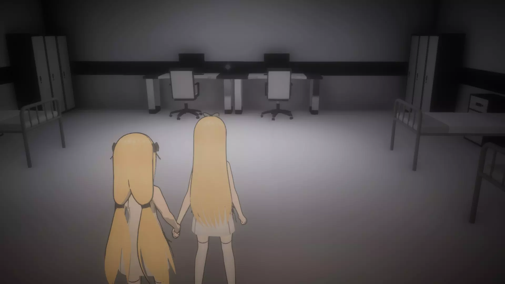 进入你旁边已开启的密室,并输入密码:211869。这将开启两个新密室:一个在安保摄像头前的大厅,另一个在08号房间对面。 接下来的谜题,你需要在每个谜题房间各安排一名姐妹。你将在每个房间解谜,以便另一名姐妹能进一步进入她们的房间。大厅1号房间谜题的解法: