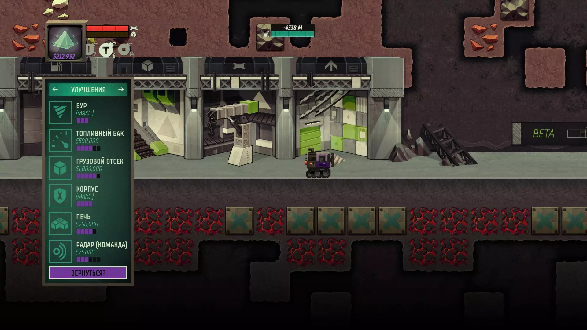 《超级钻探机》文本俄化补丁 描述: 翻译与制作:Creeper0k 翻译类型:文本 发布类型:非官方 所需游戏版本:Steam,1.04.01 安装方法:详见下节 安装: 1. 下载俄化补丁 2. 使用任意压缩软件(例如WinRaR、7-Zip)打开文件,将内容复制到游戏目录,路径为:Steam steamapps common Super Motherload assets swf 3. 确认替换文件俄语化补丁安装完成,您可以启动游戏了。 翻译文本示例: