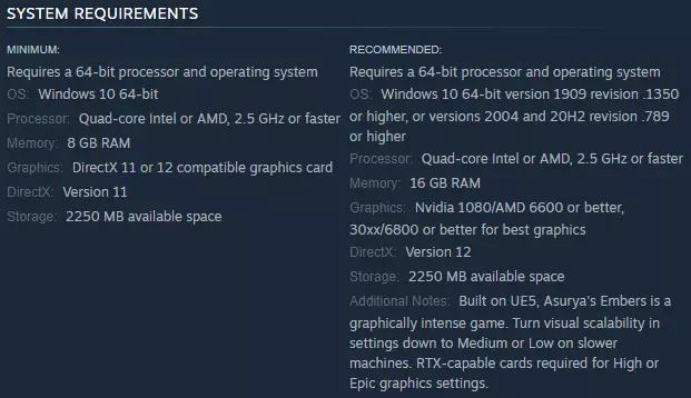 建议进行评分! 蓝屏死机 安装《Asurya's Embers》后不久,我点击开始游戏,弹出了一个显示英伟达官网驱动页面的标签页。这提示我,游戏可能无法在我的系统上运行,至少在不更新驱动的情况下是这样。无论你是否使用英伟达显卡,在加载游戏时都可能遇到所谓的“蓝屏死机”,即游戏无任何反应。我至少在出现蓝屏前看到了部分开发商标志。简而言之,如果你遇到的只是黑屏,试试更新驱动看是否能解决问题。 免责声明:如果你不知道如何在系统上安装驱动,请寻求技术帮助。我不对系统损坏负责。系统需求 请参考以下系统需求,了解运行游戏的最低配置要求。