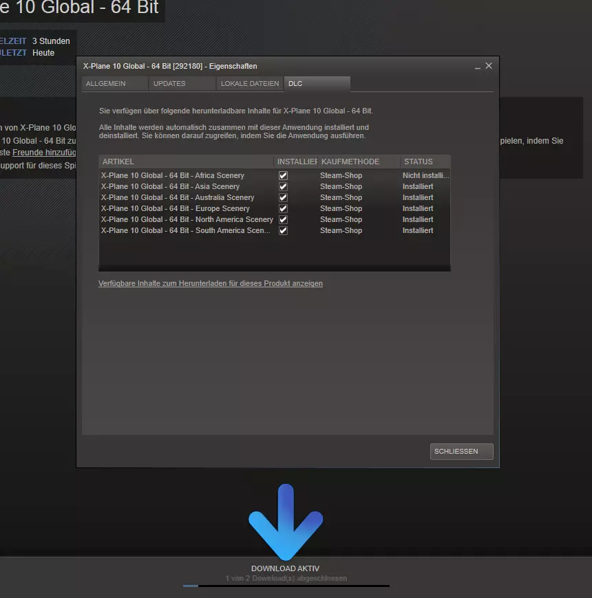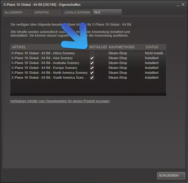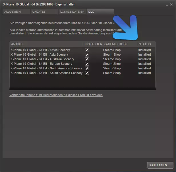 切换到您的Steam库,右键点击【X-Plane 10 Global - 64 Bit】,然后点击【查看可下载内容】