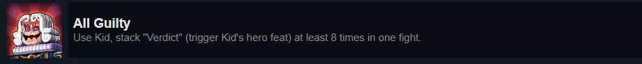 这里存在很多混淆,在我看来,这是一个严重的翻译错误。 我在游戏进程早期就获得了这个成就,但甚至没意识到为什么会得到它。当时我不明白这个成就的要求是什么,尽管我已经知道基德的机制。 我对这个成就的理解是,必须在同一场战斗中触发8次审判之眼效果。基德在战斗开始时会对一名敌人施加此效果,并且只会攻击该敌人直至其死亡,之后效果会转移到下一个敌人身上。当带有该效果的敌人攻击他人时,效果就会被触发,这会导致基德攻击带有效果的敌人。如果在同一场战斗中发生8次这种情况,成就就会解锁。考虑到Kid是一名后期英雄,而且已经是我最喜欢的五杀英雄之一,你很可能会通过和我一样的方式解锁成就:在后期战斗中使用Kid。