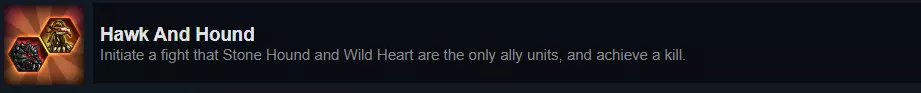 另一个相对容易达成的成就,完成率却更低(仅1.6%!!!)。不过我猜这是因为完成这个挑战必须要有2名英雄才能尝试。 石爪是卡卡的宠物,而野性之心是奥马哈的宠物。你需要做的是,首先将石爪放在有【血腥味(2)】卡牌的格子里,然后使用【鹰翔(6)】卡牌让野性之心加入石爪,并与附近的敌人战斗。说实话,这两只宠物都很厉害,而且成长性相当不错。我的策略是让石爪在 bot lane 附近生成,一旦 bot lane 的敌人被削弱,我就在那里使用鹰翔并发起攻击。我在同一场战斗中尝试了这个策略,最终在同一局比赛中又获得了2次击杀,这让我意识到这个挑战其实比看起来要简单得多。