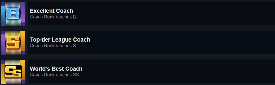 这些成就除了【英超联赛】外,不需要你赢得任何特定联赛,所以你无需在任何阶段都表现得毫无瑕疵。 正如简介中所说明的,我专门在这个难度下进行游戏,并且建议你也这样做——信不信由你——这能加快整个流程。 例如,我在第一次尝试时就晋级了所有联赛,在测试不同技能和英雄组合的同时获得了第一名。到我在【英超联赛】的第三年,我已经能在资格赛中取得12胜0负的成绩,并在第60回合前赢得比赛。我的意思是:利用早期年份来提升你的运动员并强化你的关键策略。经过2-3个赛季后,你将拥有一支完全符合你游戏风格的队伍。尽管对手也会随着时间推移变强,但他们仍会持有相对较弱的卡牌,而且即便是在最高难度下,AI依旧会做出不合理的禁用/选取决策以及愚蠢操作。因此,游戏实际上会随着时间变得越来越简单,而非越来越难。 教练等级
