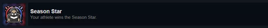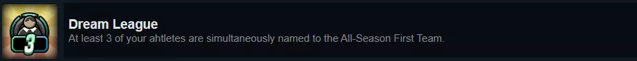 每个资格赛阶段结束时(即季后赛前),会有赛季总结、运动员奖项以及各类排名。其中包括梦之队奖项,会评选出本赛季最佳的3支梦之队。 该成就要求至少有3名你的运动员入选赛季最佳梦之队。换句话说,你需要有一名运动员在同一赛季中3次成为其位置上的最佳球员。这个成就在第一年就很容易获得,但如果你像我一样更专注于某些运动员而忽略其他人,可能需要更长时间:我直到第三年在超级联赛时才获得该成就。