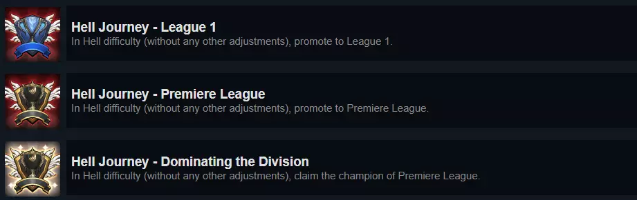 作为教练,你的最终目标就是沿着从挑战者系列赛→二级联赛→一级联赛→超级联赛的路径,成为游戏中最高级别联赛的冠军。 你从挑战者系列赛开始,在6场比赛后,如果表现足够出色,就能晋级到二级联赛。二级联赛和一级联赛的赛制相同:各有13支队伍,每支队伍都要与其他队伍进行一次对决。排名前8的队伍进入季后赛,最终的2名决赛选手将晋级到下一个级别。相反,在一级联赛和超级联赛中,13支队伍中排名最后的2支将降级到更低的级别。 需要注意的是,除超级联赛外,输掉季后赛决赛并不会有问题——你仍然会晋级到下一个级别。如果你未能晋级或惨遭降级,这或许会“拖延”你迈向荣耀的步伐,但你肯定能比其他许多人更早解锁所有这些成就,所以慢慢来。 地狱之旅