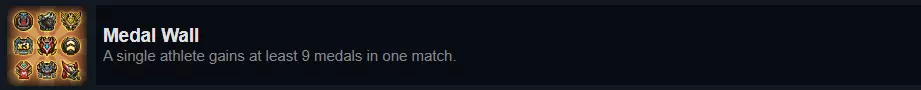 另一个耗时而非考验技巧的成就。在比赛开始前,你会看到两种类型的奖牌:固有奖牌,这类奖牌始终可用;以及特定奖牌,你需要从已有的奖牌中选择几个。这些奖牌就像是比赛目标,当完成目标后,达成目标的运动员将获得一枚奖牌。这个成就之所以耗时,仅仅是因为起初你的奖牌槽位有限,所以即便在一场完美的比赛中,也无法获得9枚奖牌。随着时间推移,你会获得更多奖牌,其中许多都很容易达成,这使得这个成就变得简单。 比赛特定成就 现在我们终于要谈到真正具有挑战性的成就了。有些仍然相对容易,但即使赢得了英超联赛,所有这些成就也可能被忽略而从未解锁。本节涵盖与比赛相关的成就,不一定涉及特定英雄(不过部分成就使用特定英雄会更容易达成)。