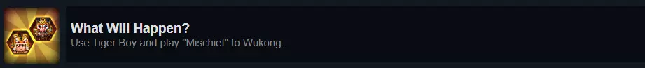 这是一个完成率极低(3.4%)但相对简单的成就。 挑战很简单:对【悟空】使用【虎子】的【恶作剧(2)】卡牌。使用后会发生什么我就不解释了——那样会破坏这个梗(如果你了解这张卡牌和这两个角色,那这个梗对你来说可能已经不新鲜了)。 “困难”的部分在于,要让敌方AI在你选择【虎子】的同一条分路选出【悟空】。方法是让你的选手在顶路使用【虎子】,因为【悟空】只会在顶路出场。一旦完成这一步,并且敌方在顶路选出了【悟空】,剩下的就简单了:持续禁用顶路英雄,这样AI会更倾向于选择【悟空】。如果出了问题,退出游戏再重新进入,游戏会直接从禁选阶段开始,你可以再次尝试。很简单。