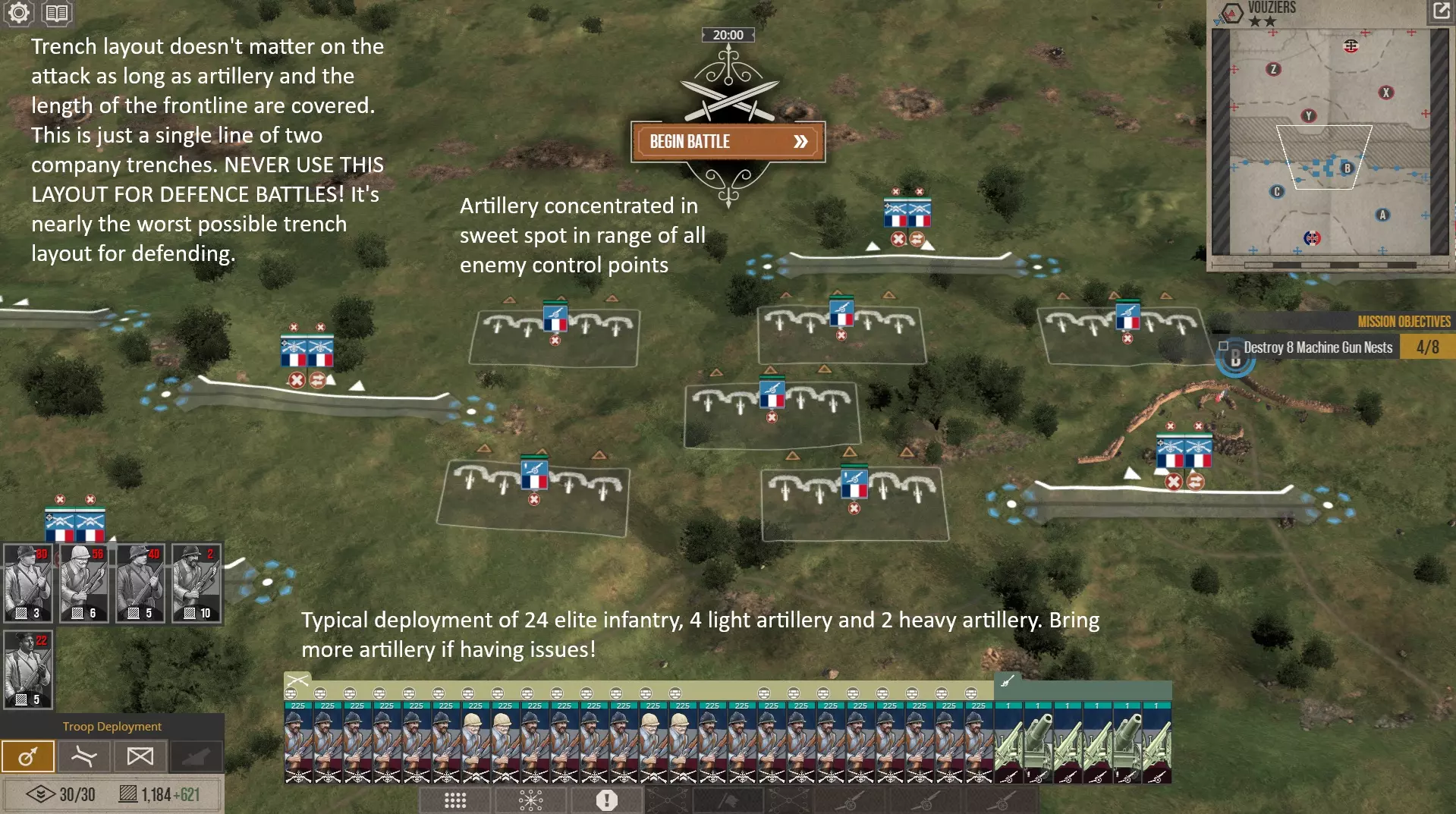 2)我应该如何建造战壕? 在进攻时,战壕布局并不太重要。敌人通常会先发动小规模试探性攻击,派出少量步兵连,你可以轻松消灭他们。我通常会把所有战壕都部署在前线,单排或双排,每个战壕部署两个连。 注意,这并不是良好的防御方式!请参考本指南的防御部分,了解如何构建有效的防御网络。 3)我的炮兵应该部署在哪里?