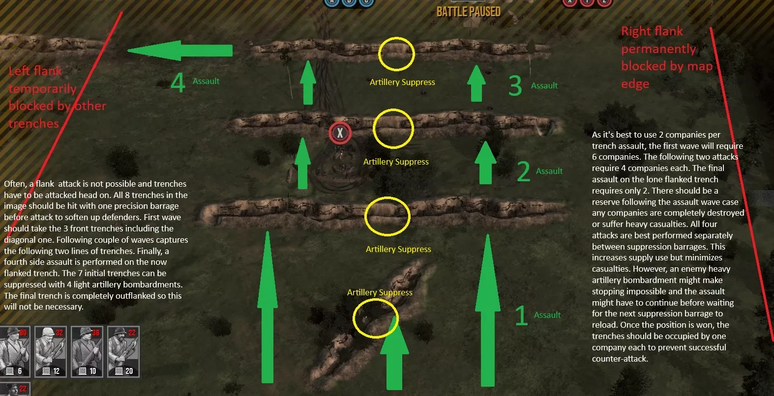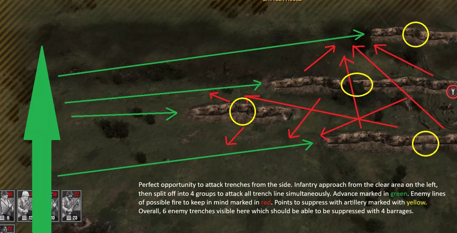 AI几乎总会将其战壕连接起来,这对你而言是个巨大优势。你还记得在防御部分我曾说过永远不要连接你的战壕吗?这是因为连接战壕存在诸多弱点,其中之一便是它们距离过近,一发弹幕就能将其全部压制。务必瞄准战壕的连接点,这样就能以一发的代价压制两、三甚至四个战壕。 3) 如果我的火炮不足以压制所有目标该怎么办? 这种情况下,可以忽略机枪(在这款游戏中,机枪的杀伤力不如步枪火力)。 要是这样仍不够,那就忽略你步兵即将发起攻击的战壕,转而集中火力攻击那些你暂时无法抵达的远处战壕。 4) 我的重型火炮应该做什么?如前所述,它们也可用于压制,但主要任务是造成伤亡。我建议用精确弹幕至少轰击每个敌军占领的战壕一次。这会消灭部分步兵,使进攻更容易。两次或更多次弹幕通常会造成重大伤亡,甚至可以摧毁驻守战壕的连队。 但要记住,只要有时间,AI会替换被摧毁的连队并重新占领战壕。在较高难度下,AI还会撤退并替换伤亡惨重的连队。因此,削弱驻守战壕的敌军连队实际上比几乎或完全摧毁它们更好。 5) 攻城炮呢? 攻城炮的补给成本很高,你可以在战斗前发射,有一定百分比的几率摧毁敌军战壕。如果条件允许,我强烈建议你一直使用这个。 如何发起攻击?——步兵(战术战斗) 攻击在很大程度上取决于炮兵,因此请查看指南中的相关部分。本部分重点介绍步兵移动。 1) 尽可能进行侧翼包抄 战壕无法向侧面射击。始终寻找能让你从侧面攻击战壕的接近路线。这样你可以减少用轻型火炮压制战壕的补给消耗。要记住,虽然战壕无法以90度角射击,但它们的射击角度范围相当广。为安全起见,你必须以接近直角的角度接近战壕。