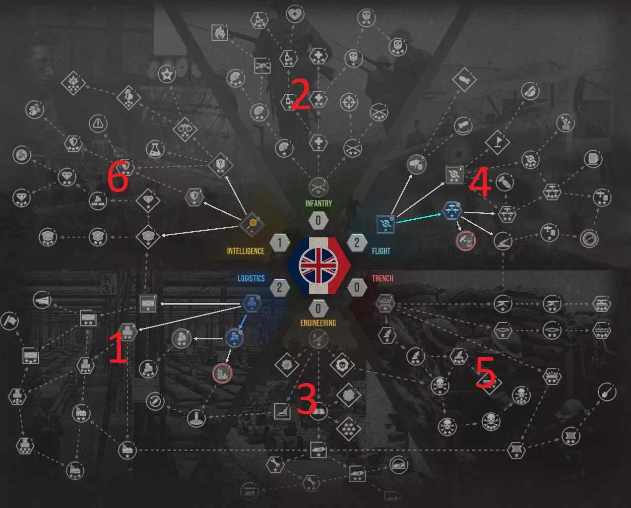 研究什么? 如果你的战役进展顺利,你将主要采取进攻策略。当然,一旦你获得国民意志优势,你可以选择在战役剩余时间里仅进行防御,并等待1918年……但这可能会很无聊。此外,进攻当然比防御更困难。 因此,优先研究有助于进攻的项目是明智的。 1. 后勤科技树非常重要,你想从这里获得的是每回合更多的收入、更多的步兵军、补给站以及更便宜的补给转换。这是必不可少的!尽快获取。 2. 步兵科技树也很出色,可能是第二优先项——手榴弹、生命值、数量和速度的升级都值得获取。3) 工程科技树在游戏初期不太重要,但其中有些内容最终是你会需要的——在这里你可以升级火炮,最终获得坦克。首先要获取的是攻城炮。它能彻底摧毁敌方战壕(要注意有一定概率且会消耗大量补给),这会让战斗变得更轻松。 4) 空军科技树——在我的战役中,飞机从未发挥过巨大作用,但它们还是有一定用处的。空中侦察和更先进的观测气球是不错的配置,能让战斗轻松一些。只需获取基础飞机来进行侦察,科技树的其他部分可以留到后期再研究。 5) 战壕科技树——没那么有用。一场成功的战役中90%的时间都在进攻,要让敌人遭受足够的损失,使其几乎无法发起反击。此外,游戏本身就严重倾向于防守方,而且即便是在较高难度下,AI的进攻能力也确实很差。因此,将此作为你最次要的任务。 6) 情报树——我发现这一技能树相当无用,除了在早期战役中做过一些实验外,我从未使用过间谍活动。在我看来,你真的不需要这部分内容。 重要提示:如果你有研究某事物的次要目标,那么完成它几乎总是个好主意,因为你将获得金币、补给甚至免费单位作为奖励。所以努力去完成吧。 购买什么——或者更确切地说,何时购买?