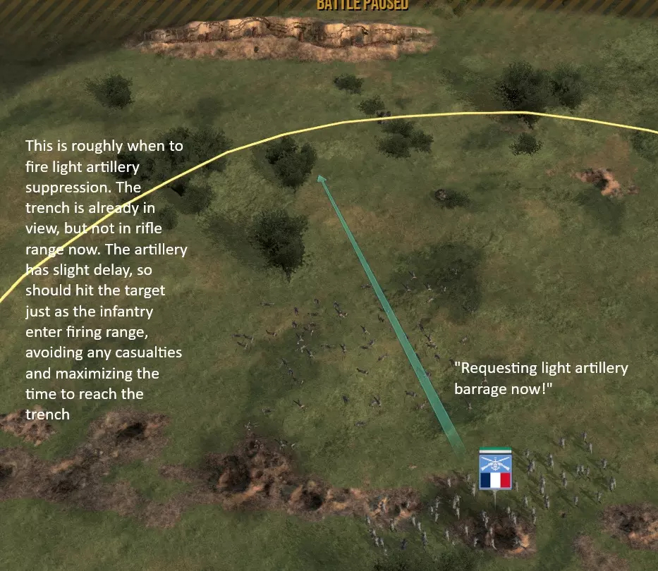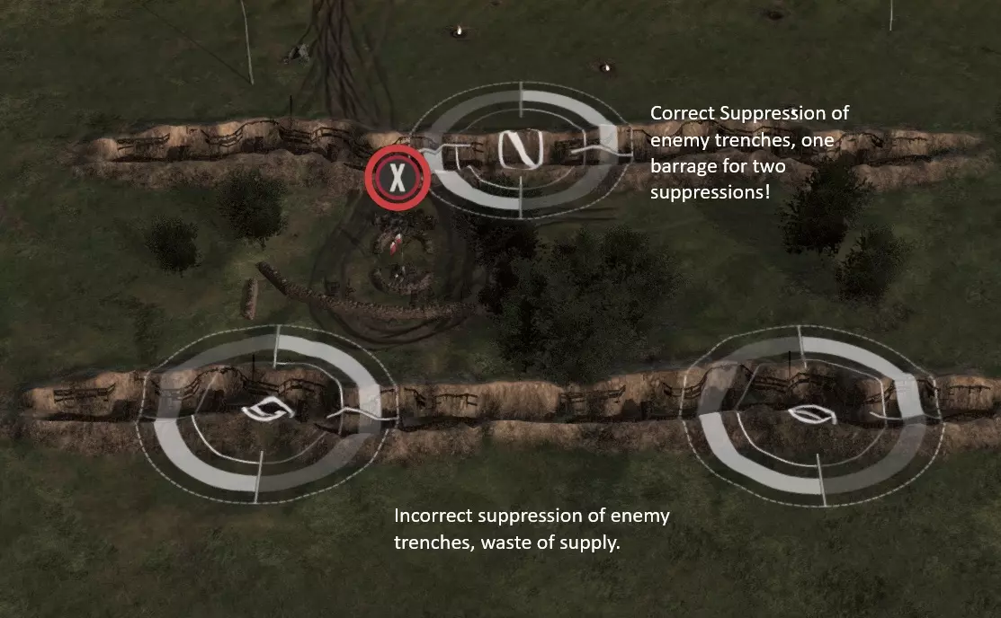 压制!本游戏中的轻武器火力十分致命,能在数秒内击溃步兵连。当你的步兵距离敌方战壕还有大约2-3秒就能进入步枪射程时,除非你百分百确定战壕为空,否则就用轻型火炮轰击它。这里的时机把握至关重要,你最终会找到感觉的。太早开火,敌人会在你抵达战壕前开火;太晚开火,他们会在被压制前进行几轮射击。 你也可以用重型火炮进行压制,但它的装填速度慢得多,炮弹落地也需要更长时间,而且在这方面效果不如轻型火炮。 2) 轻型火炮应该如何瞄准?
