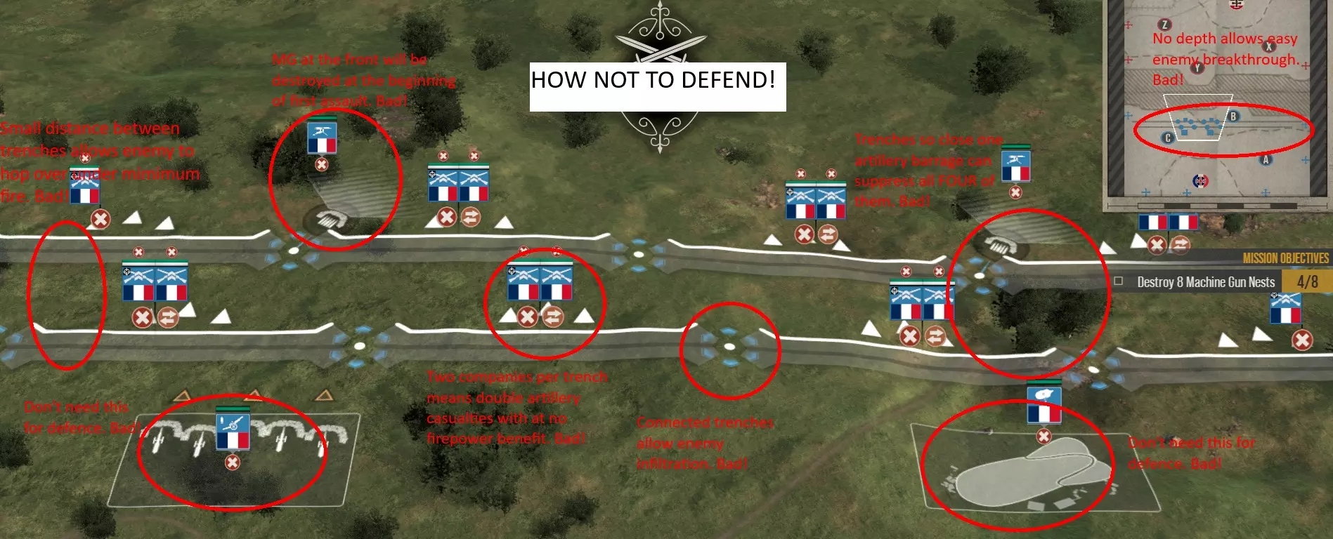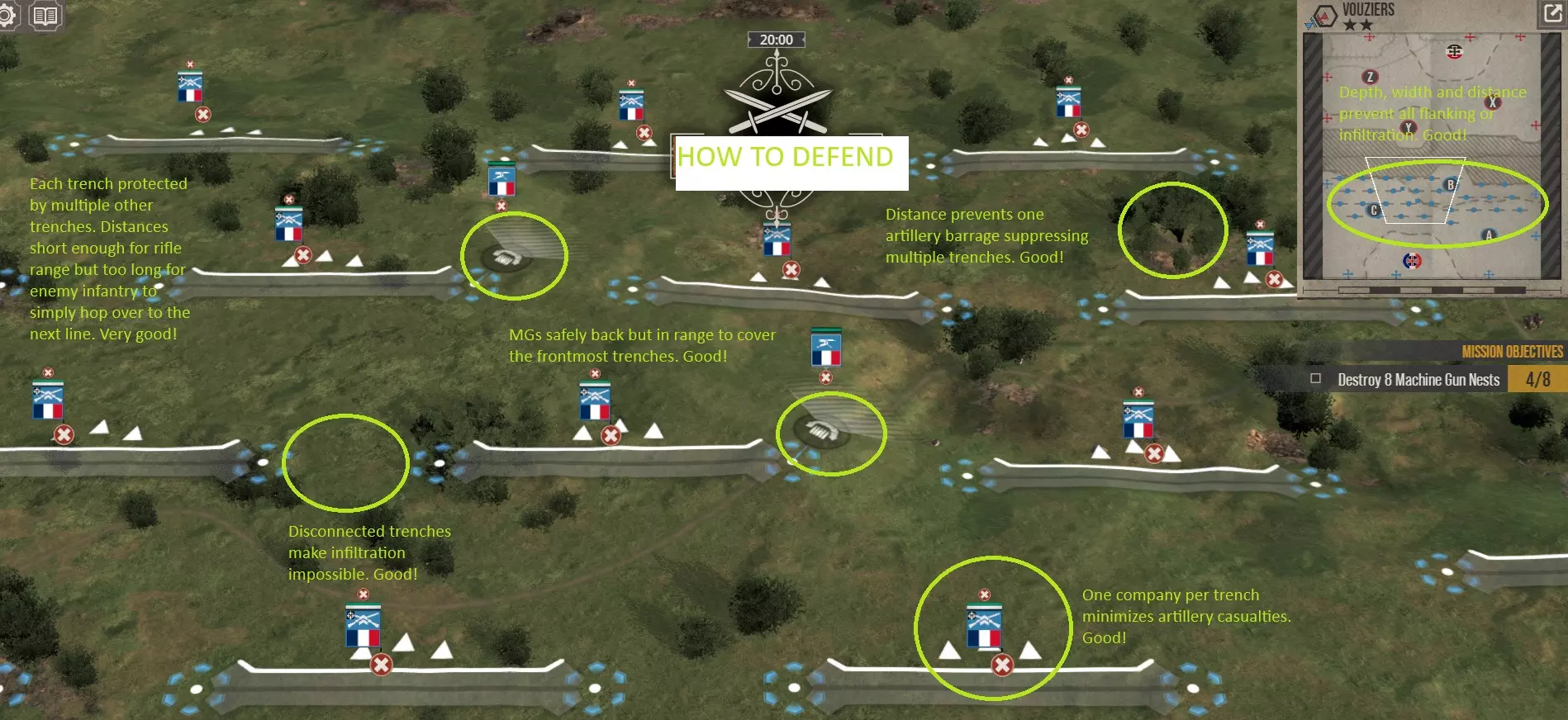 一份希望能涵盖你在这款游戏中取得成功所需一切的指南。 我包含了图片,尤其是在讨论战壕布局和进攻时。 本指南假设你正在以任意阵营、任意难度与AI进行战役,并且了解基本机制,例如如何移动和购买单位、国家意志机制、战壕有助于减少伤亡等。 我应该用多少个军来防守和进攻(战略地图)?