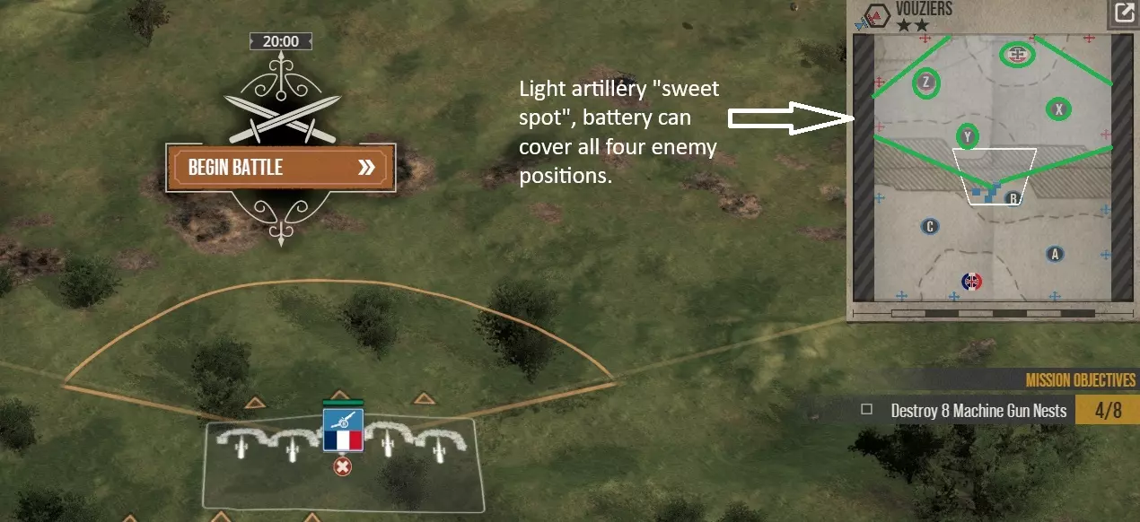 先部署轻型火炮,因其射程较短。大多数地图都有一个理想位置,在那里你可以部署4个炮兵连,并且这4个连都能完全覆盖所有敌方控制点。但要注意,有些地图无法实现这一点,这时你就不得不分散部署火炮。遗憾的是,这意味着你可能需要携带更多火炮。例如,你可能需要两组各3个连的火炮,而非一组4个连的。 第二步部署重型火炮,其射程远得多,因此通常很容易找到能覆盖整个地图的位置。 4)我需要机枪或观测气球这类额外装备吗? 机枪绝对不需要,观测气球则视情况而定。它们相当昂贵,即使有2个,你也可能无法看到敌方的全部部署。如果补给充足,完全可以这么做;否则,可以考虑使用成本低得多的空中侦察。 总的来说,我在大多数战斗中都没有使用空中侦察或气球,而是选择将补给花在更多的增援部队和炮击上。简单来说——如果有战壕且无法看到内部,就假设里面有敌人。AI很少会让战壕空着。 我该如何发起进攻?——火炮(战术战斗) 火炮至关重要。如果不使用火炮,你将遭受惨重伤亡,且无法夺取任何阵地。 1) 我的轻型火炮应该做什么?