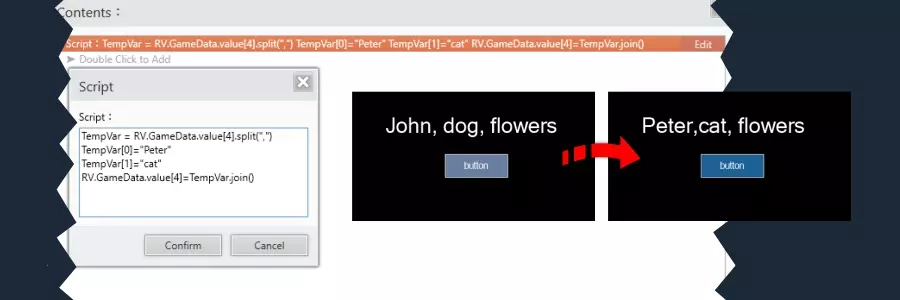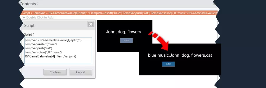 此外,还需要创建和使用临时数组(不会存储在变量中),正如我们接下来将看到的,它们将在脚本中为我们提供帮助。 修改数组变量 要修改包含数组的字符串变量,创建后必须将其拆分为各个部分,以便处理并访问每个单独的值,无论是字符串值还是数字。 修改包含字符串值的数组变量 我们使用一个任意名称的临时数组变量,在本例中为【TempVar】,此临时变量将帮助我们拆分字符串变量,并使用以下脚本将其转换为JavaScript数组变量: 【TempVar】= RV.GameData.value [4] .split (",") 注意:从脚本中可以看到,特殊字符是用引号指定的,这里的特殊字符是“,”。 通过这种方式,每个元素都能被JavaScript单独识别,现在我们得到了一个可以修改的临时数组: TempVar = ["John", "dog", "flowers"] 每个单独的元素表示如下: TempVar [0] = "John" TempVar [1] = "dog" TempVar [2] = "flowers" 要修改内容,我们需要指定要修改的元素并替换其值。 示例: TempVar [0] = "Peter" TempVar [1] = "cat" 最后,我们需要将临时数组变量的元素连接起来,并使用以下脚本将其存储到字符串变量中: RV.GameData.value [5] = TempVar以下是我们将要编写的完整脚本: TempVar = RV.GameData.value[4].split(",") TempVar[0] = "彼得" TempVar[1] = "猫" RV.GameData.value[4] = TempVar.join() 现在我们变量的值为: RV.GameData.value[5] = "彼得,猫,花朵"