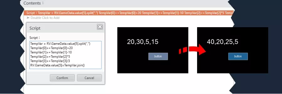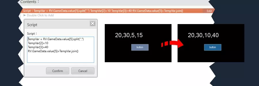 修改包含数值的数组变量 如果数组包含数值,操作方式类似,但需要通过对脚本进行一些修改来表明这是数字而非普通字符。 创建或定义字符串变量: 示例: RV.GameData.value[5] = "20,30,5,15" 使用临时数组变量进行分割: TempVar = RV.GameData.value[5].split(",") 结果如下: TempVar = [20,30,5,15] 各元素分别为: TempVar[0] = 20 TempVar[1] = 30 TempVar[2] = 5 TempVar[3] = 15 修改最后两个元素: 示例: TempVar[2] = 10 TempVar[3] = 40 合并数组: RV.GameData.value[5] = TempVar.join() 完整脚本如下: TempVar = RV.GameData.value[5].分割(",") 临时变量[2] = 10 临时变量[3] = 40 游戏数据值[5] = 临时变量合并 现在我们的变量值为: 游戏数据值[5] = "20,30,10,40"