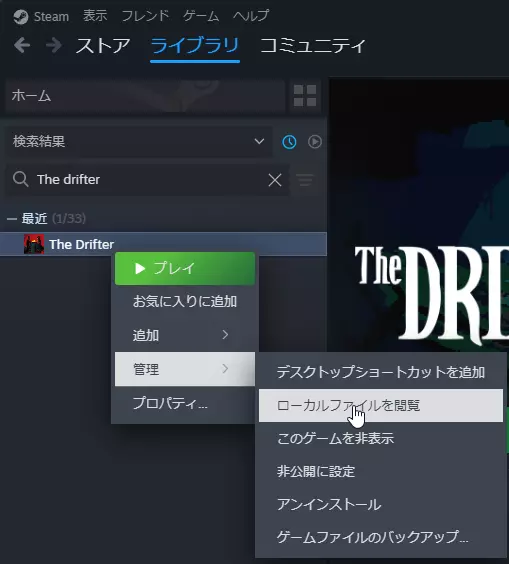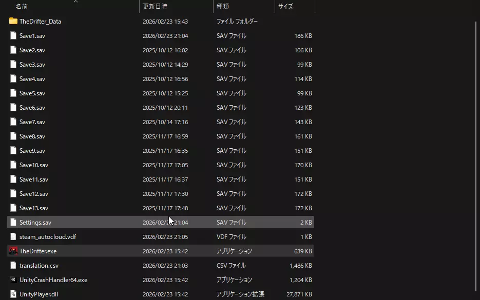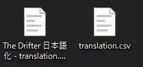 文件放置:请将创建好的translation.csv文件移动并保存到【The Drifter】的安装文件夹(与.sav格式的存档文件所在的层级相同)。 ※在Steam库中右键点击游戏>【管理】>【浏览本地文件】即可打开该文件夹。
