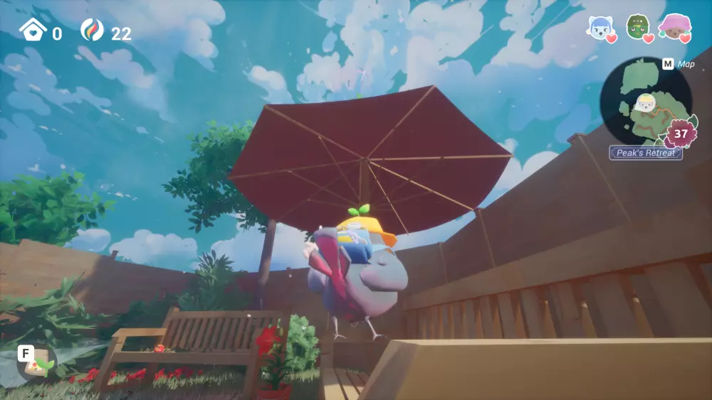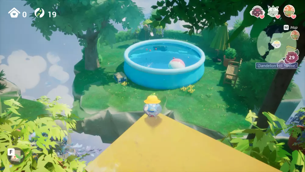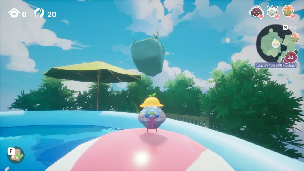 在充气泳池区域的一座小浮岛上,你可以通过使用黄色弹跳遮阳伞到达那里。