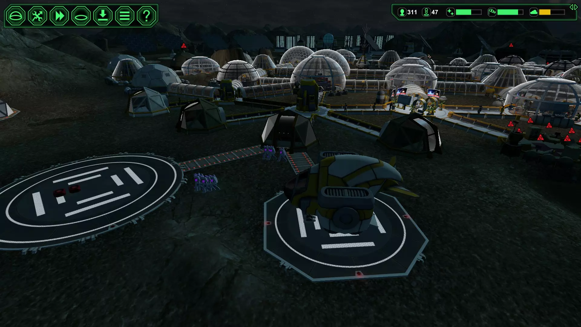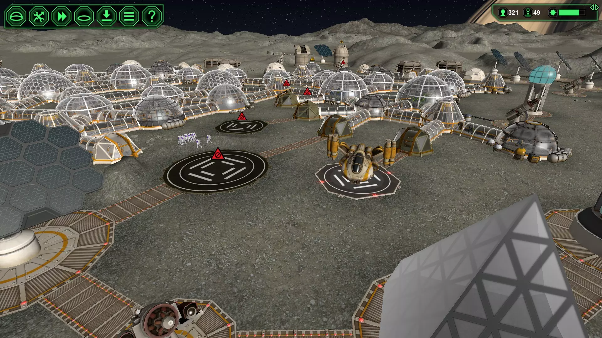 (图6)13株植物用于“储存”生物塑料,直至建筑需要时使用。 注意:如果食品产量严重超过消耗量,可暂时关闭生物穹顶的电源,或将部分植物种植垫拆除还原为生物塑料。 第五部分 - 登陆坪与星际港 我们都能认同这一点吧?星际港体型庞大!星际港外观酷炫!但天啊,它们简直是耗电黑洞。(10钢 vs 4钢,33千瓦 vs 5千瓦) 趣闻:一个24小时不间断运行的星际港,基本上需要配备专属的大型太阳能板和大型集热器——(在我看来,这简直是本末倒置,依我之见,这种方式行不通)。 如果是在时间和材料都不成问题的轻松场景中,我建议大胆尝试。尽情享受游戏。如果你喜欢,放置多个星际港也无妨。它们会吸引贸易商,其扩展的容量可应对有助于获取十项科技的大型交易。不过,在30天内达成100名殖民者、60天内250名殖民者或70天内300名殖民者的紧急挑战中,星际港可能过于奢侈,还会严重消耗资源。在这些紧急情况下,与其建造一个星际港,不如建造多个基础着陆坪,这样能更高效地获得同样数量的殖民者。我尝试过各种玩法,得出的结论是星际港只会带来更多的入侵者哈哈。