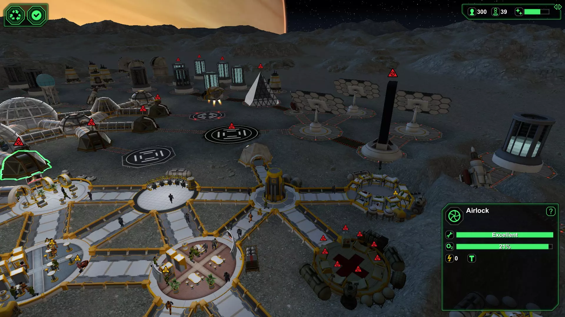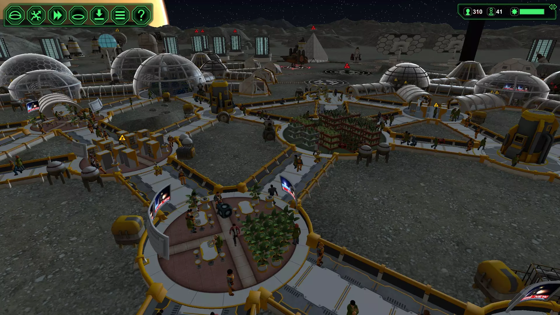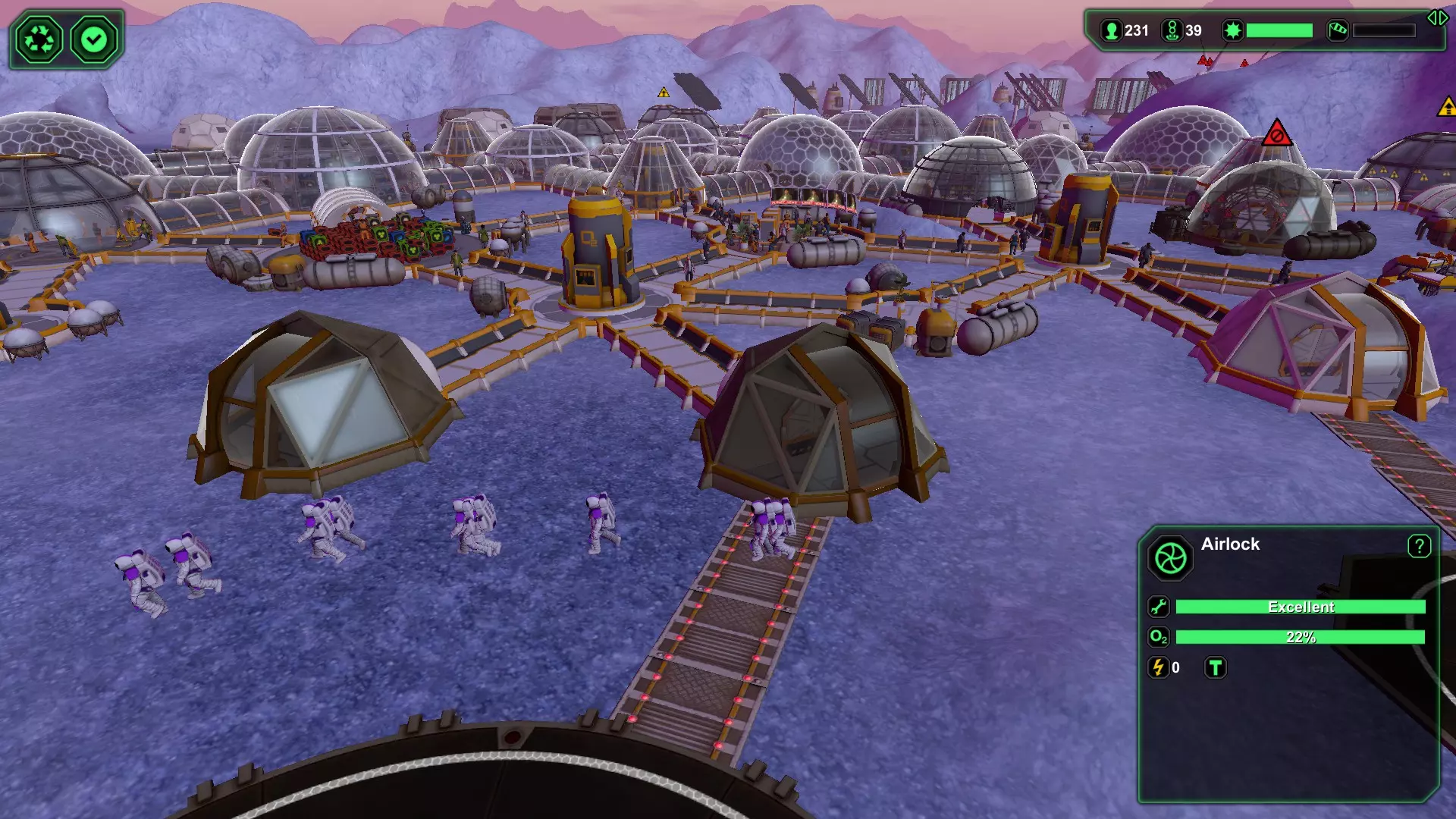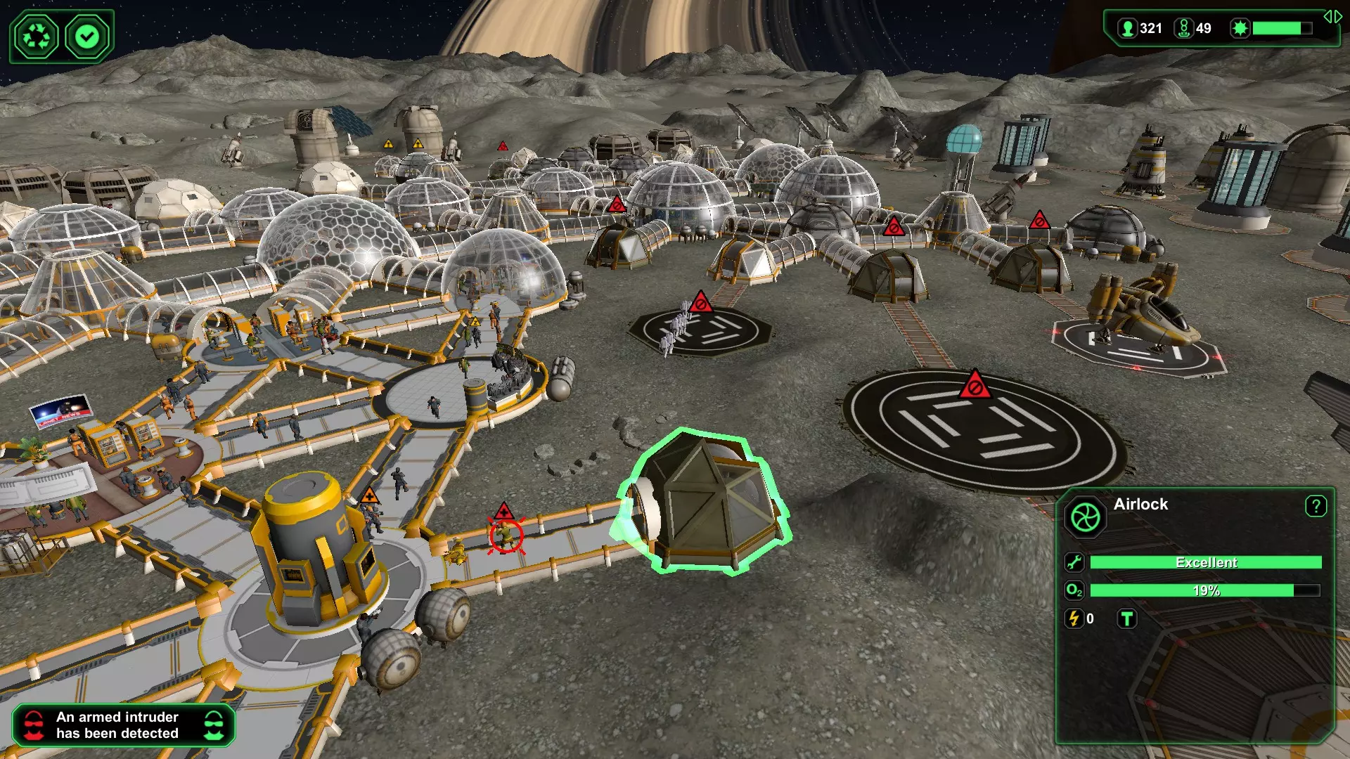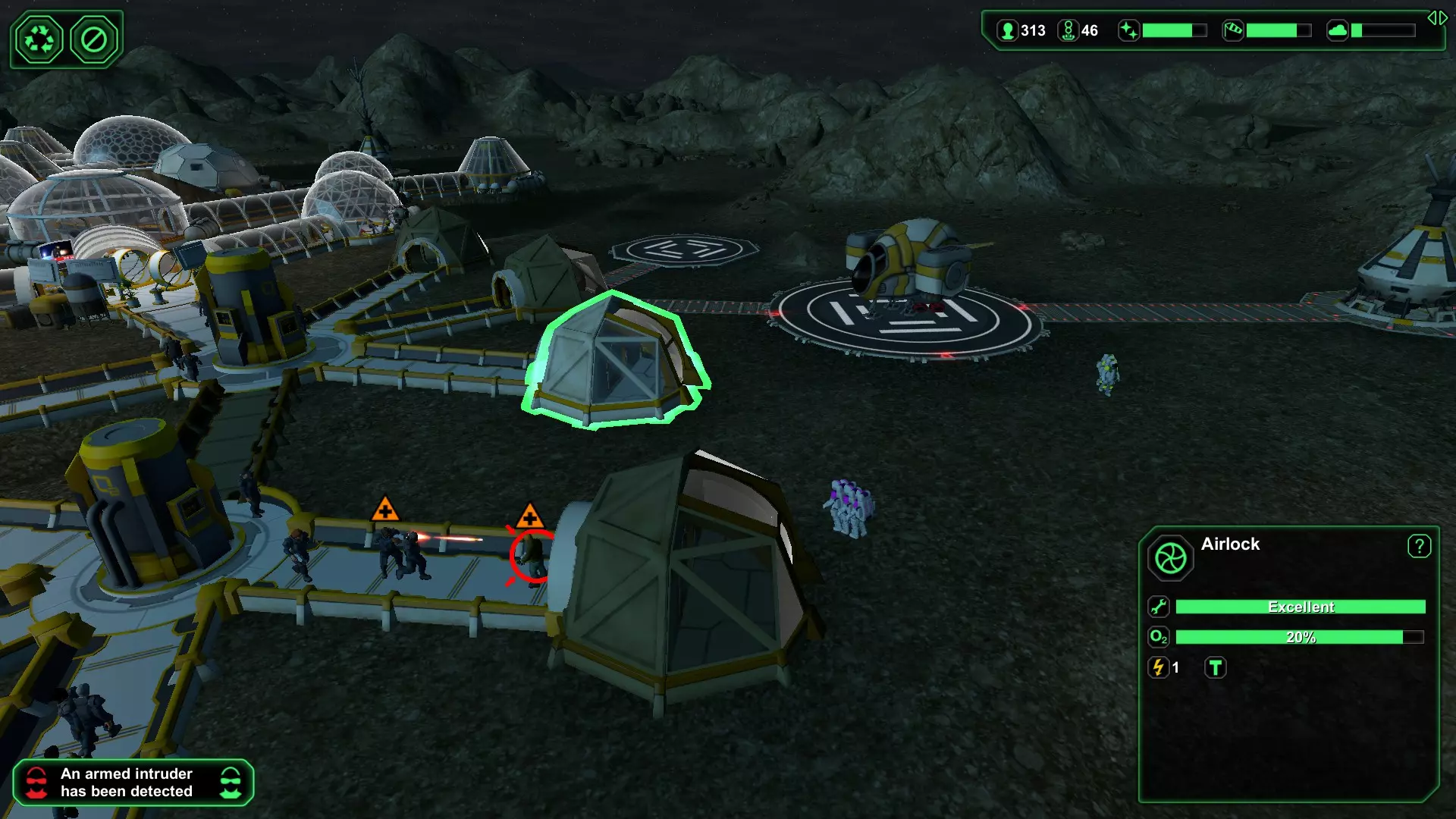 (图11)迎击入侵者1 - 同时让剩余入侵者来回移动 当入侵者抵达时,确保所有附近的贸易气闸已关闭,从而将入侵者引向唯一的安保气闸。我们的计划是用压倒性的火力,与入侵者逐个进行近距离的“单独会面”。无论是在游戏中,还是说实话在生活中,你最不想要的就是“公平战斗”。 现在,当入侵者前往安保气闸的途中,激活离安保气闸最近的诱饵贸易气闸,使其处于待命状态,以便让剩余的入侵者来回移动。这将是一场“单人派对”,所以不要让入侵者成群进入。让第一名入侵者进入警卫的“欢迎派对”,关闭安全气闸,将其余的坏人“乒乓”引向那个诱饵气闸。当他们都朝着诱饵气闸移动时,重新激活安全气闸并关闭诱饵气闸。与此同时,第一名入侵者正沐浴在柔和温暖的枪口闪光中(图11),很快就会成为历史。如果你有过“入侵者乒乓舞”的经验,就知道接下来该怎么做了!循环往复——一次一个地把入侵者送到警卫那里,直到派对结束。拥有足够数量的警卫(在大型基地中,我通常会部署30-50名),入侵者会被迅速消灭,以至于被他们盯上的那名警卫通常只会受些轻伤,一般不需要在医务室接受治疗,但治疗仍是一个选项。要确认的话,点击受伤的警卫并查看其生命值条。如果生命值条在缓慢恢复,那就没问题。如果生命值条在缓慢下降,就启用附近的医务室为他们治疗。 需要考虑的最后几点:将距离安保设施最近的气闸用作诱饵,可以让整个处理过程快速完成,从而使基地恢复正常秩序。 在首次检测到入侵者后,警卫会立即聚集到事发区域,并会严阵以待,为下一波“派对客人”(即入侵者)做好更充分的准备,依此类推。如果你使用距离较远的气闸花费太长时间,守卫可能会散开。这仍然能起作用,但多多益善。 考虑在坏人出现时停用登陆平台/星际港,以防止新来的殖民者陷入交火。(在上面的最后一张截图中,我没有这样做,现在我们把平民卷进来了——这在报告上可不好看)。 保存的游戏 有时候,存档是唯一能保护你的东西!你永远不会保存得太频繁。养成经常保存的习惯。我有没有提到——保存。 在我的快速黑暗殖民地(70天内300+人口)运行期间,游戏初期,一颗陨石摧毁了我的大型生物穹顶。那是在我有足够的电力和资源建造反陨石激光之前。我退出游戏并重新加载,结果同一颗陨石不断瞄准我的生物穹顶,每次都造成12到19名殖民者死亡,即便我切断了生物穹顶的电源。只有当我把所有植物都拆解回生物塑料,让生物穹顶完全空置时,生物学家们才会离开那里。最后一次陨石撞击时,我只损失了2到3名殖民者——这还能接受!“Express Dark Colony”成就的其他部分进行得相对顺利,大约在第60天完成——虽然绝不是什么记录,但能完成还是很令人满足的。 第二个重要注意事项与地形变化和存档有关。如果你花时间移除山丘和湖泊,开辟出一片适合建造基地的绝佳区域,要注意这些地形变化不会被包含在你的存档中。如果你退出并重新加载上次的存档,你的建筑和设施可能会被湖泊或高山环绕。虽然这不会影响正常运营,但肯定会对未来的扩张产生影响,因为在空间如此有限的情况下,移除山丘和湖泊会变得更加困难。 供你参考——关于地形变化不会被保存的第二点,当我冲击成就时,离开电脑时会让《星球基地》保持运行并暂停,这样当我回来继续游戏时,一切都会和我离开时一模一样。 结论 有一点是肯定的。无论你怎么玩,《星球基地》都很有趣。再说一遍——建设殖民地没有绝对的正确或错误方式。我们都有自己的风格。一天结束时,最重要的是你能停下来欣赏风景,并为自己所取得的成就感到满足。下面的截图是我和妻子(布鲁彻夫人)的合影。