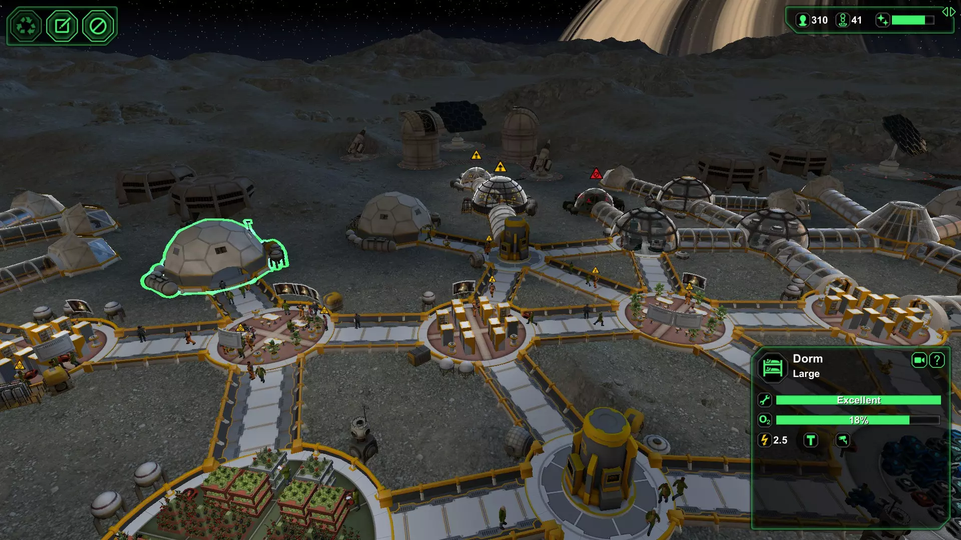 (图2)风暴星球 - 300+殖民者后的最终基地 - 开阔空间 如果起始区域是你可以利用的,那就加载你着陆后保存的早期存档。游戏内时间过得很快,在限时场景中,不应让侦察该区域花费的半天时间拖慢我们的进度。 第二部分(A和B)- 资源管理 新场景一开始,首先要做的就是立即回收宇宙飞船。之后,建筑物可以放置在离资源区域非常近的地方,有时连接通道甚至可以直接穿过资源区域的中心。不要忽视殖民者/机器人将资源运送到建筑工地所需的时间。如果将建筑直接建在资源堆正上方,能让他们的工作既快速又高效——这两个词可不常用来形容《星球基地》里的AI,哈哈。我说得对吗? 为了最大化第一个夜晚的电力储存,有几点需要考虑。首批可建造的设施包括太阳能电池板、资源收集器和水提取器。为了在第一个艰难的夜晚储存尽可能多的电力,水提取器一建成就要立即关闭,因为在拥有氧气发生器之前,它毫无用处。需要时再重新开启。每储存一千瓦电力都很重要! 接下来,我个人很讨厌看到回收飞船留下的未使用资源在室外环境中变质。理想情况下,一个超大的储存设施会非常棒,但还是想想就好。在限时场景中与时间赛跑时,几乎没有时间也没有必要建造储物仓。在第一个晚上,当建筑已建成且只有少数殖民者在休息,其余人基本处于闲置状态时,在食堂里大量种植植物,迫使殖民者将一些生物塑料搬到食堂内。这样做有两个好处:一是生物塑料会恢复到极佳状态,二是当你准备使用它时,它就在手边。可以考虑推迟建造食物制造机,迫使殖民者使用留在外面的食物。同时,新的食物会在生物穹顶中堆积,当食物制造机最终建成时就可以使用了。在游戏初期,资源短缺,对于快速扩张的基地和不断增长的人口来说,电力和水资源总是不足。我经常遇到的一个问题是生物穹顶缺水。不过这并非难题——可以循环使用氧气发生器:先将其关闭,直到收到低氧警告,然后重新开启,直到远处建筑的氧气水平恢复到可接受范围(20-21%氧气),之后在水资源生产稳定前,根据需要重复此过程。这样可以保证食物的持续供应,且不会对殖民者的幸福感产生负面影响。一旦建造了储水罐,这一步骤就不再需要了。 我们已经讨论过如何充分利用时间。现在,让我们确保充分利用初始资源。下一部分详细介绍了常规游戏中每个星球以及快速黑暗殖民地挑战的初始资源。 第二部分A - 各星球初始资源 了解每个挑战或成就场景的初始资源。根据不同地点,回收飞船后,你将获得不同的资源和殖民者。在开始游戏前,你应该能够准确计算出初始资源可以建造多少建筑和附属设施。表1:按星球位置划分的初始资源 星球类型 钢材 生物餐 备件 药品 工人 生物工程师 医生 搬运机器人 建筑机器人 沙漠星球 50 40 25 10 10 3 2 1 1 1 冰冻星球 45 35 20 10 5 2 2 2 1 1 1 M级月球 45 35 20 5 5 2 1 1 1 1 0 风暴星球 45 35 20 5 5 2 1 1 0 1 0 实验黑暗殖民地 45 35 20 5 5 2 1 1 1 1 0 第二部分B - 按类型划分的所需资源 - 公共设施-建筑-配件 目前,我们已经确定了每个场景的初始资源,但这些资源能支撑我们走多远呢?请注意连接器和走廊的额外材料需求(见重要说明)。 表2列出了游戏中每个建筑所需的材料。游戏内实际的尺寸描述并不完全一致,可能会有其他名称标识。(例如,《星球基地》里餐厅分为中型或大型,那么小型餐厅去哪了呢?哈哈。我觉得星巴克对Madruga的某些人影响太大了!重要提示:每个连接器和走廊都会消耗网络电力,连接越长耗电越多,连接越短耗电越少——只是顺便提一下,因为这些耗电会累积起来。要将水提取器、能量收集器等设备进行菊花链连接,因为多余的连接器只会浪费电力。(注:1-1-1格式代表所需的钢材-生物塑料-半导体,另请注意表2中的建筑尺寸分为小型-中型-大型-科技需求型。)建筑所需资源 小型 中型 大型 科技需求 公共设施 太阳能电池板 2-0-0 4-0-0 7-0-0 10-0-0 风力发电机 1-0-0 2-0-0 4-0-0 7-0-0 能量收集器 1-0-0 2-0-0 4-0-0 7-0-0 水提取器 1-0-0 2-0-0 4-0-0 避雷针 2-0-0 5-0-0 储水罐 1-0-0 2-0-0 建筑 矿场 2-0-0 气闸 1-1-0 氧气发生器 1-1-0 2-2-0 食堂 2-2-0 4-4-0 生物穹顶 2-2-0 5-5-0 7-7-0 10-10-0 加工厂 2-2-0 4-4-0 工厂 2-2-0 4-4-0 仓库 2-2-0 4-4-0 7-7-0 10-10-0 宿舍 2-2-0 4-4-0 小屋 1-1-0 2-2-0 控制中心 2-2-0 4-4-0 实验室 1-1-0 2-2-0 医务室 1-1-0 2-2-0 复合穹顶 1-1-0 2-2-0 4-4-0 酒吧 2-2-0 4-4-0 望远镜 2-0-0 4-0-0 无线电天线 2-0-0 4-0-0 反流星激光 5-2-2 路标 1-0-0 2-0-0 金字塔 10-20-0 巨石 30-10-10 附属设施 床铺 0-1-0 桌子 0-1-0 0-2-0 植物 0-1-0 电视0-1-0 水 0-1-0 矿石处理器 1-0-0 生物处理器 1-0-0 备件 1-0-0 半导体 1-1-0 机械臂 1-0-0 机器人工坊 2-2-0 机器人维修站 1-0-2 医疗柜 0-1-0 安全控制台 1-1-0 无线电控制台 1-1-0 望远镜控制台 1-1-0 武器库 1-0-0(表2)注:1-1-1格式代表所需钢材-生物塑料-半导体 第三部分 - 基地布局 从一开始,基地布局就应着眼于未来,考虑你打算扩展基地的方向,同时注意障碍物和限制因素。我的偏好是将所有建筑以易于向一个方向扩展的方式放置,而我的公用设施(太阳能、涡轮机、收集器、水)则设置在地图中不太理想的区域,以便几乎无限扩展。以下截图仅为示例。