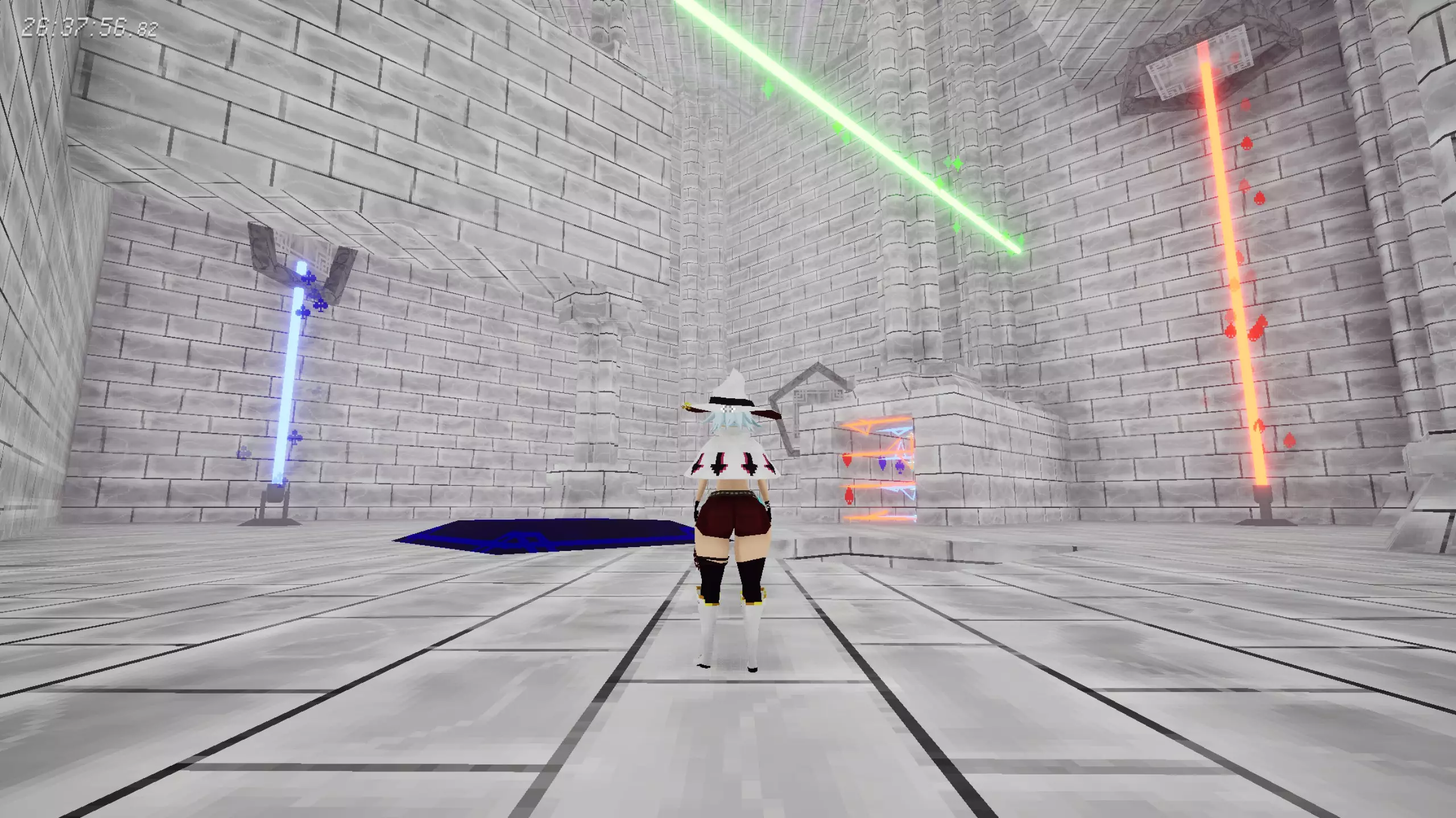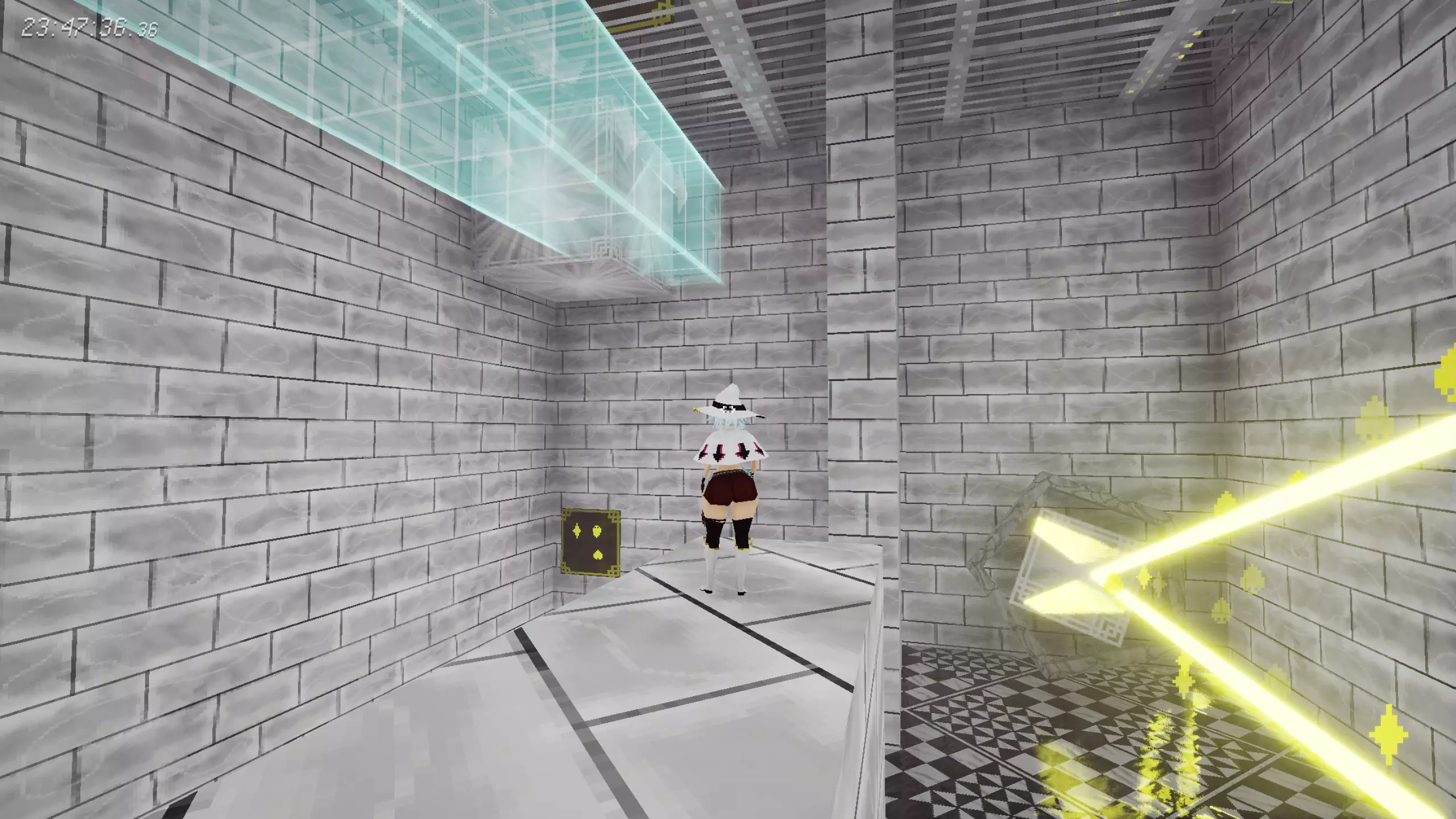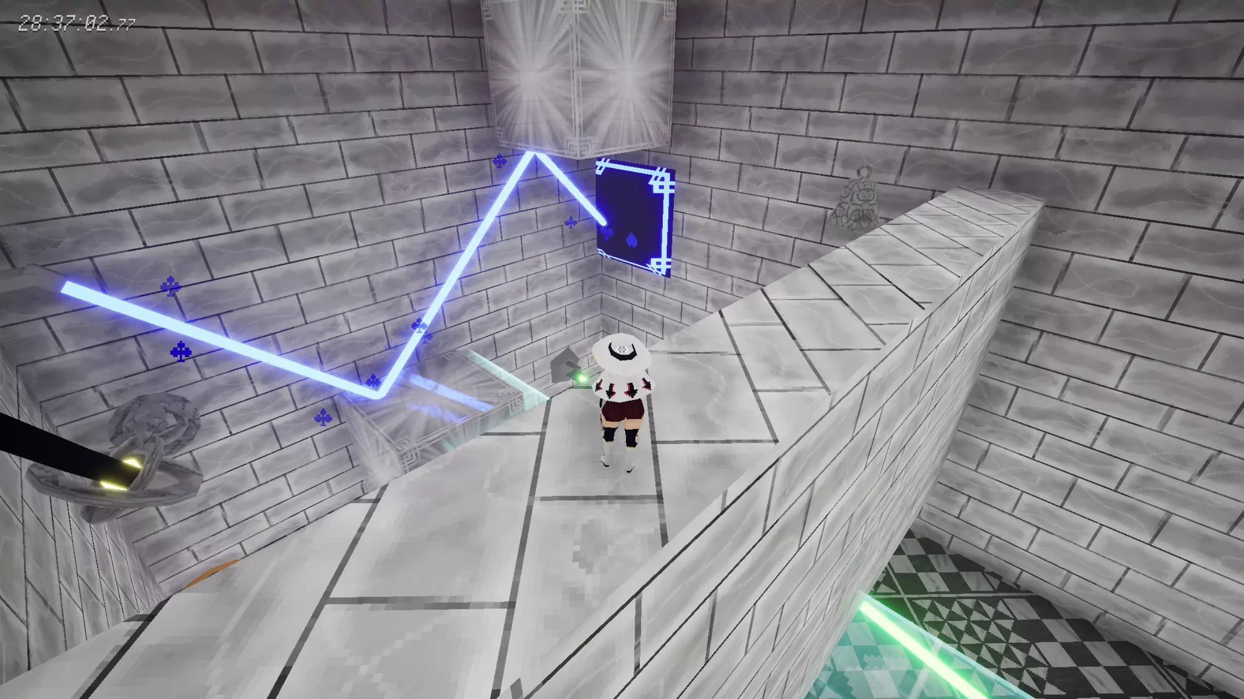 [21/22]赌徒宫殿-1 在获得【钻石卡牌组】的谜题房间内,天花板有另一个激光机关。 谜题提示:查看隐藏的第三、四张图。首先利用铁栅栏将玻璃方块弹到天花板;然后改变重力,将玻璃方块移动到对面中央,将激光反射到机关上