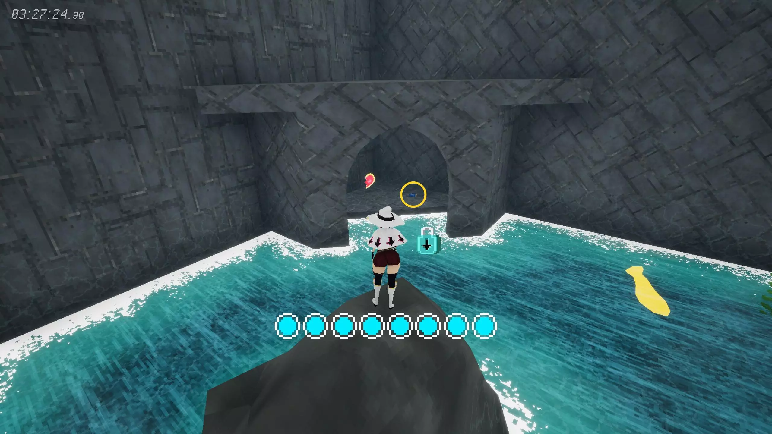 [5/22]水道-2 在谜题房间中,解开后通过铁栅栏门获得。 谜题提示:招架节奏4-2-5;铁方块需要每次切换重力方向时,都保持在空中,重复八次