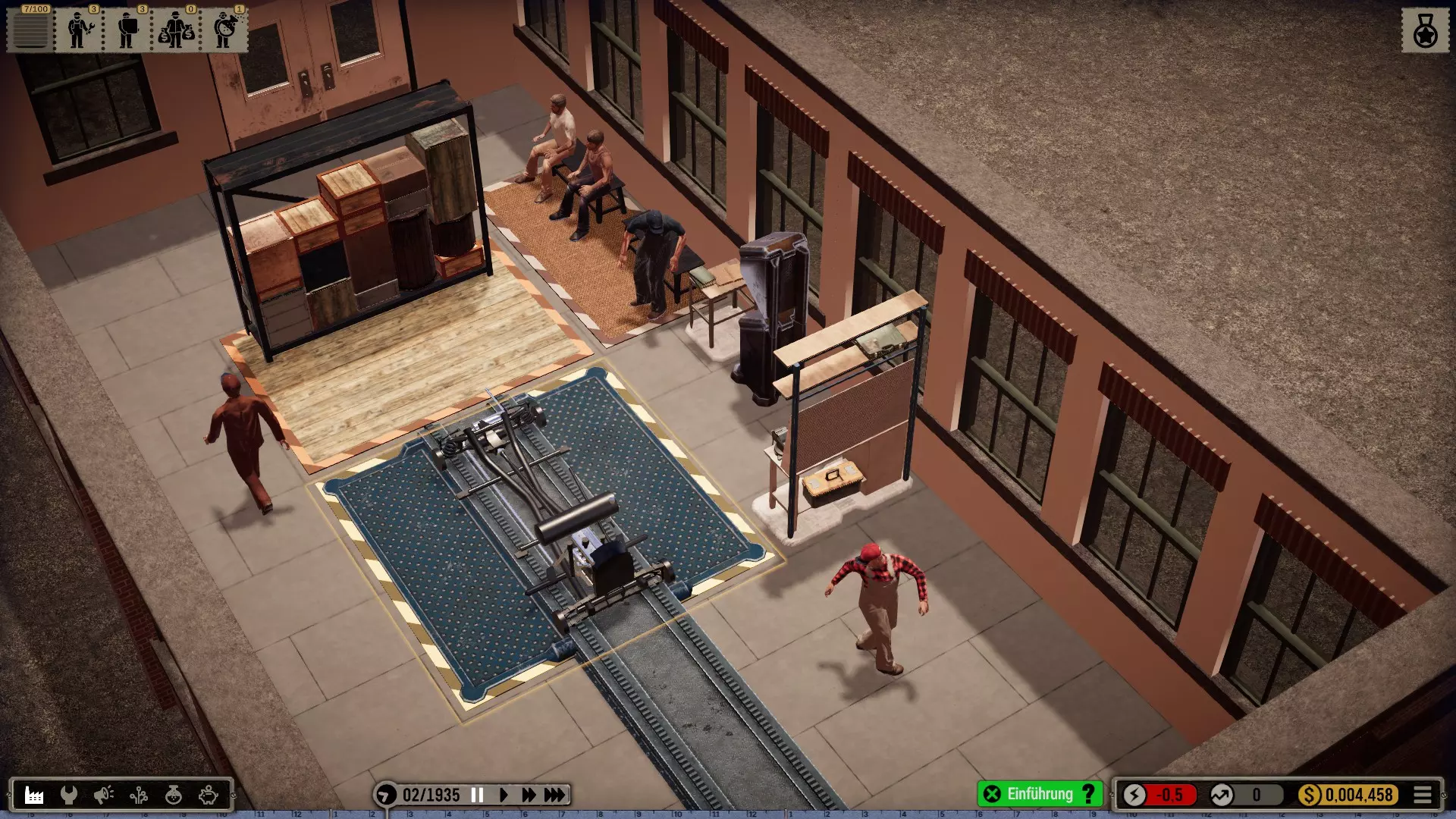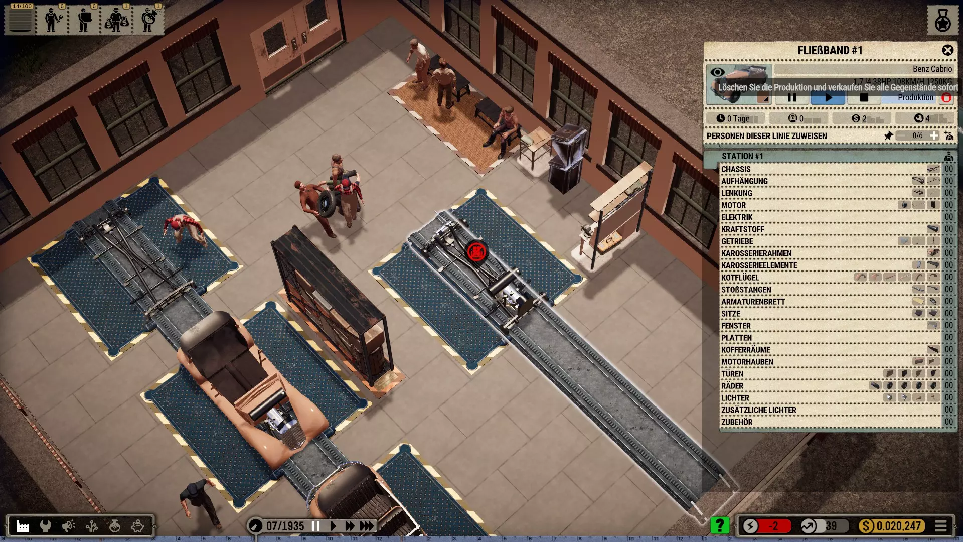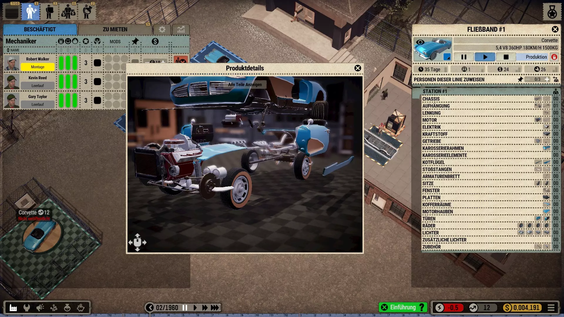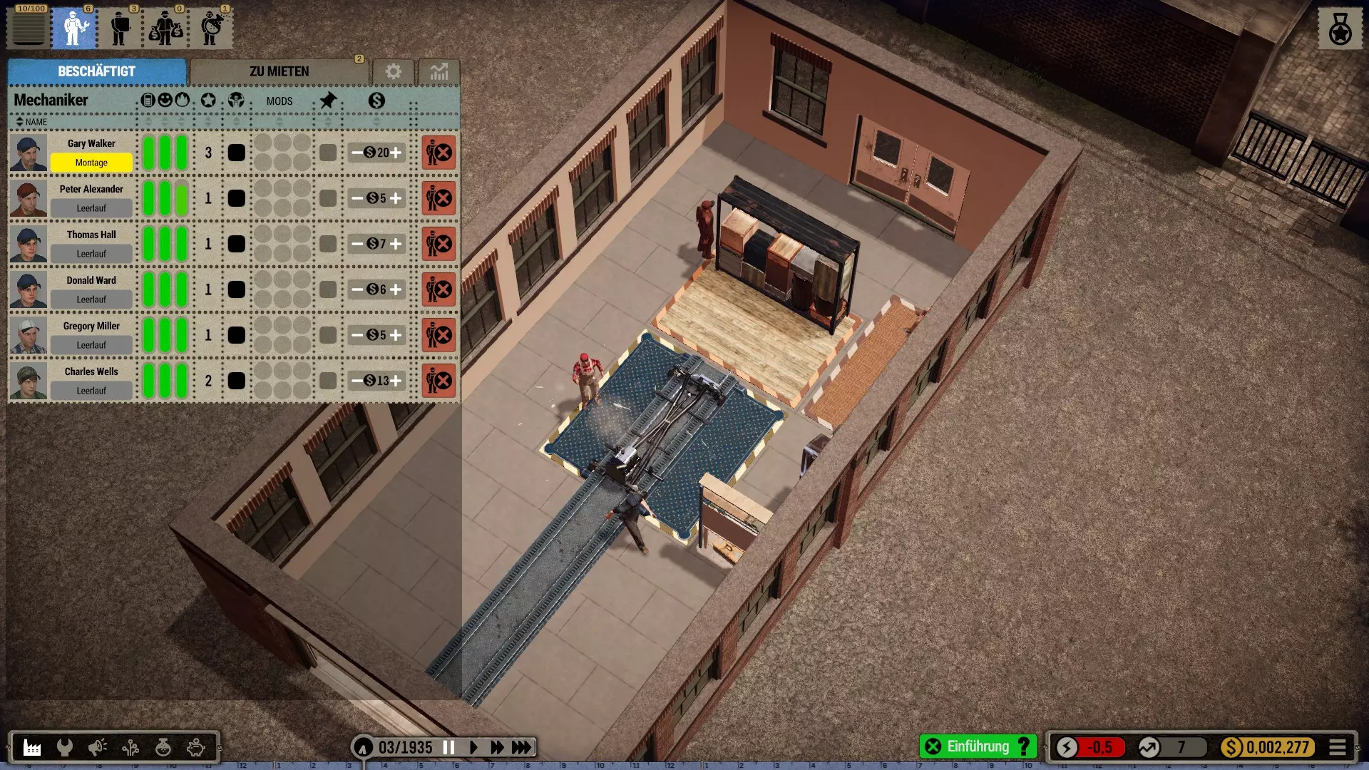 机器人:如果拆分相应订单,你可以在一个工位同时使用机械师和机器人。我喜欢让起重机安装大型和重型部件,即底盘、车轴、发动机、变速箱和车身框架。然后机械师只需添加小型部件。不过,这些简单的机器人比强壮的机械师稍慢一些。所以这其实并没有提高效率,但看起来更美观、更真实。(遗憾的是,机器人的库存非常少,必须不断补充*)。 注意:根据科技树中的描述,机器人会导致质量下降,尤其是较简单的型号!(这在机器人使用的最初几十年里可能符合历史事实)。 工位上的改进工具只对机械师有效,因为机器人本身就是工具!