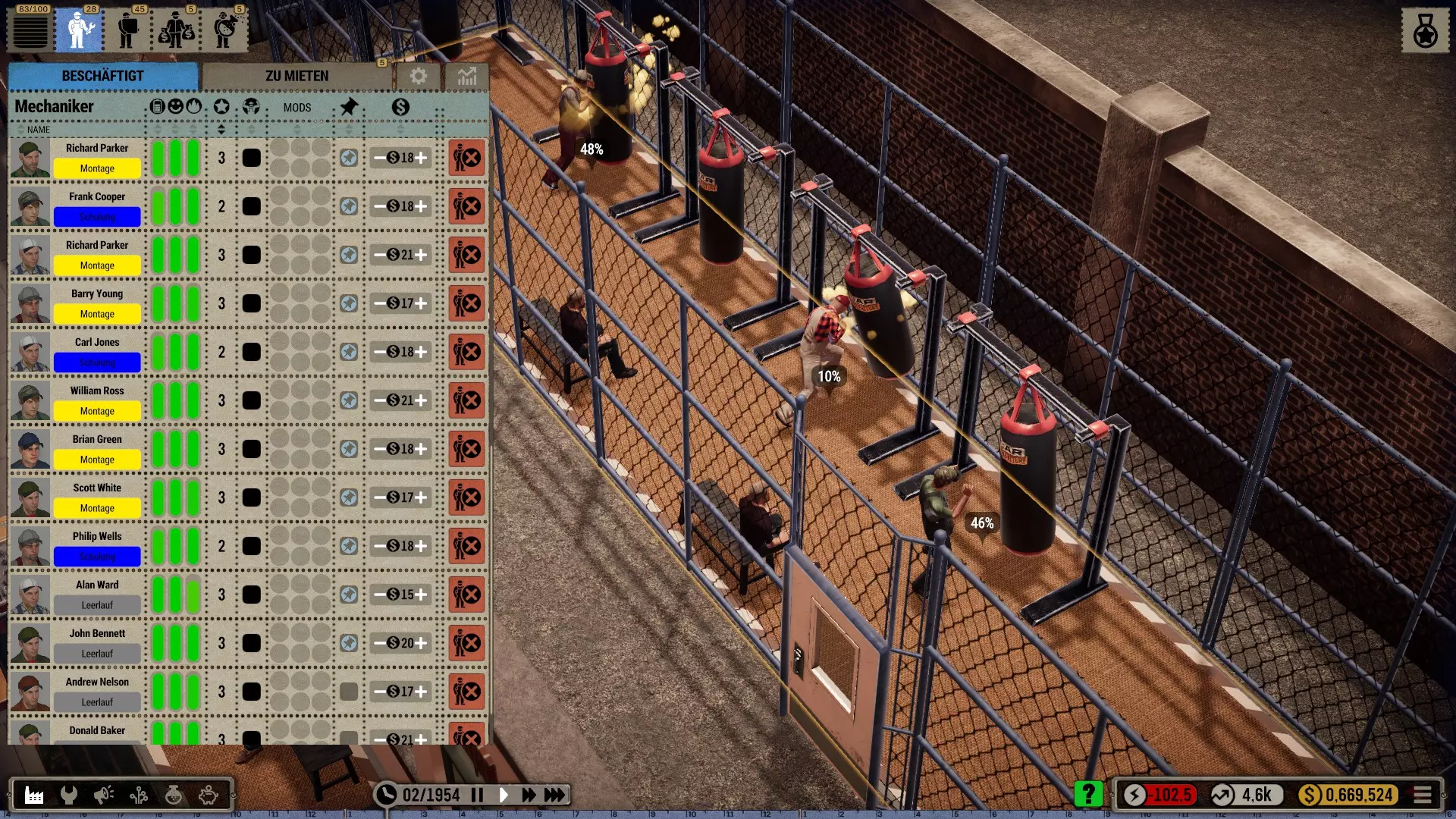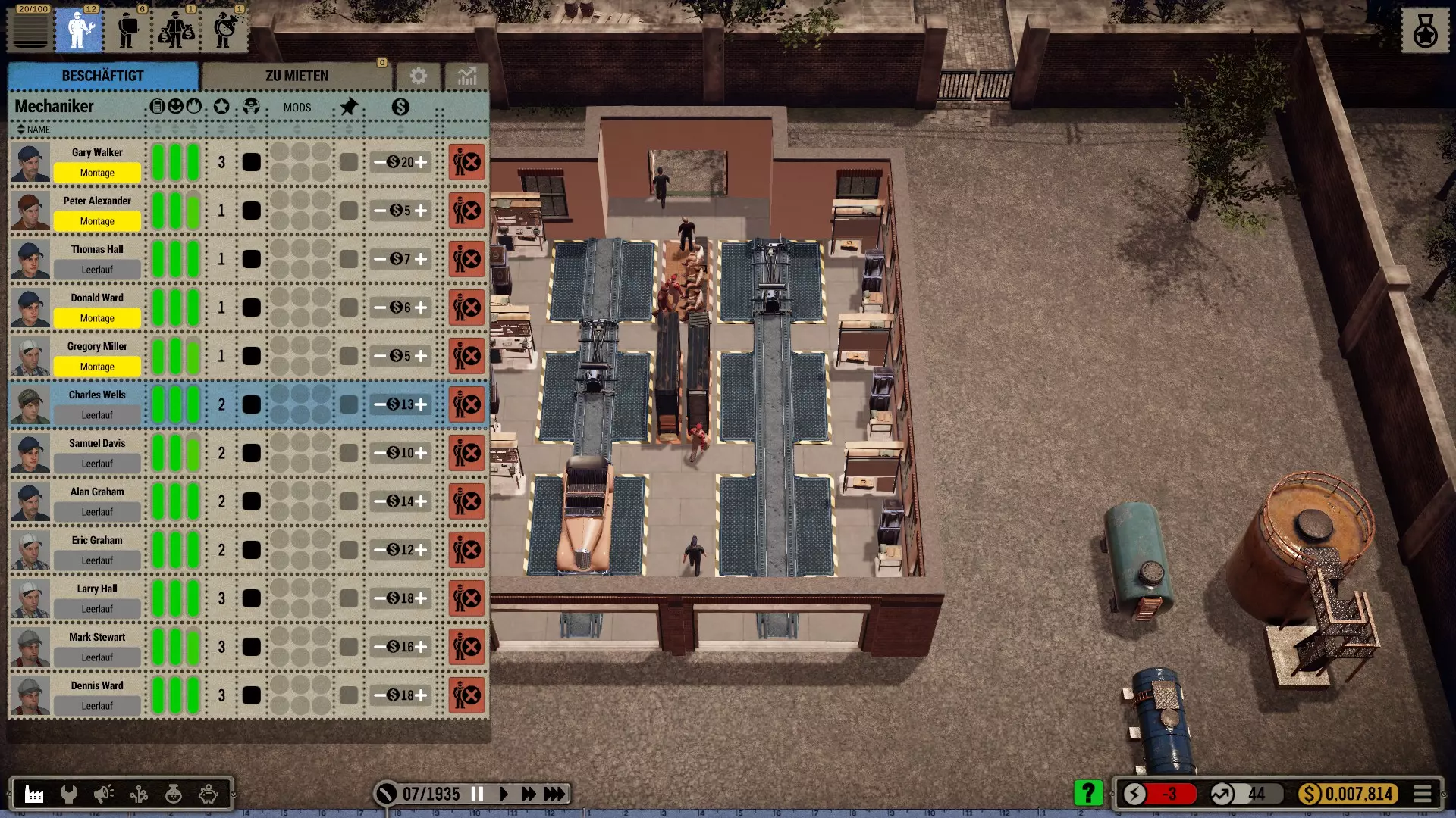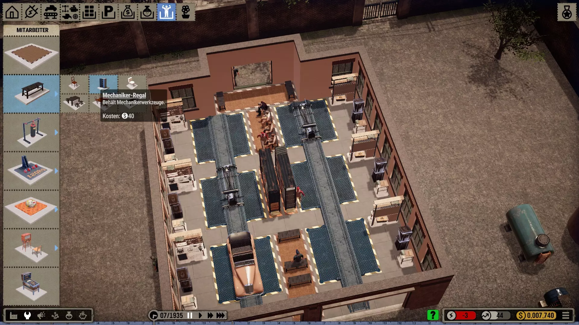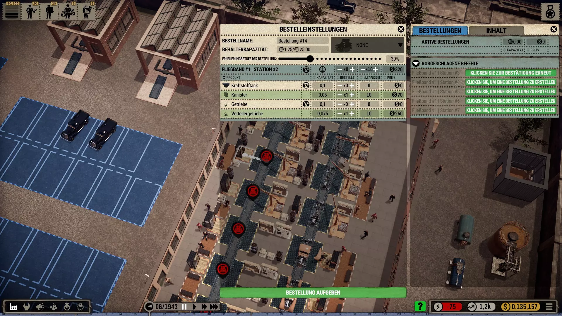 机器人:如果拆分相应订单,你可以在一个工位同时使用机械师和机器人。我喜欢让起重机安装大型和重型部件,即底盘、车轴、发动机、变速箱和车身框架。然后机械师只需添加小型部件。不过,这些简单的机器人比强壮的机械师稍慢一些。所以这其实并没有提高效率,但看起来更美观、更真实。(遗憾的是,机器人的库存非常少,必须不断补充*)。 注意:根据科技树中的描述,机器人会导致质量下降,尤其是较简单的型号!(这在机器人使用的最初几十年里可能符合历史事实)。 工位上的改进工具只对机械师有效,因为机器人本身就是工具!