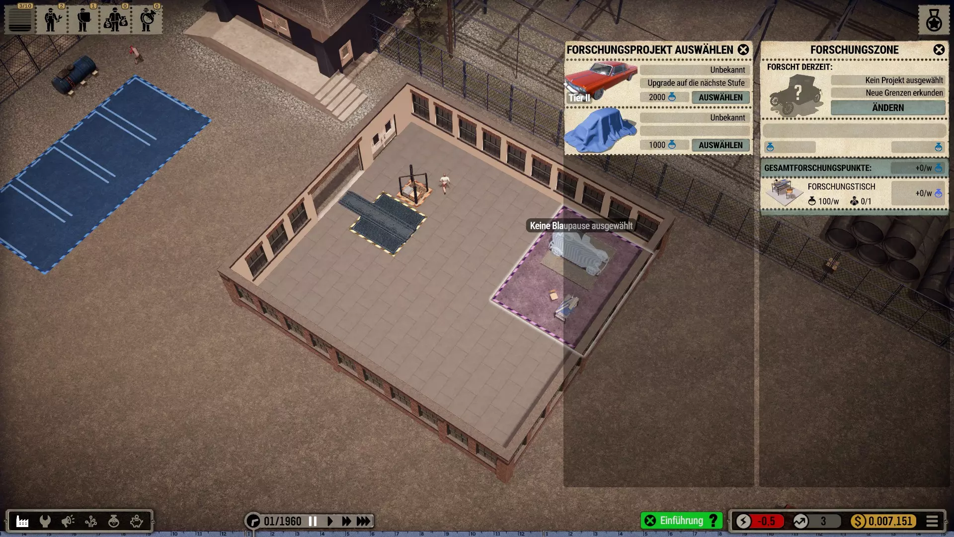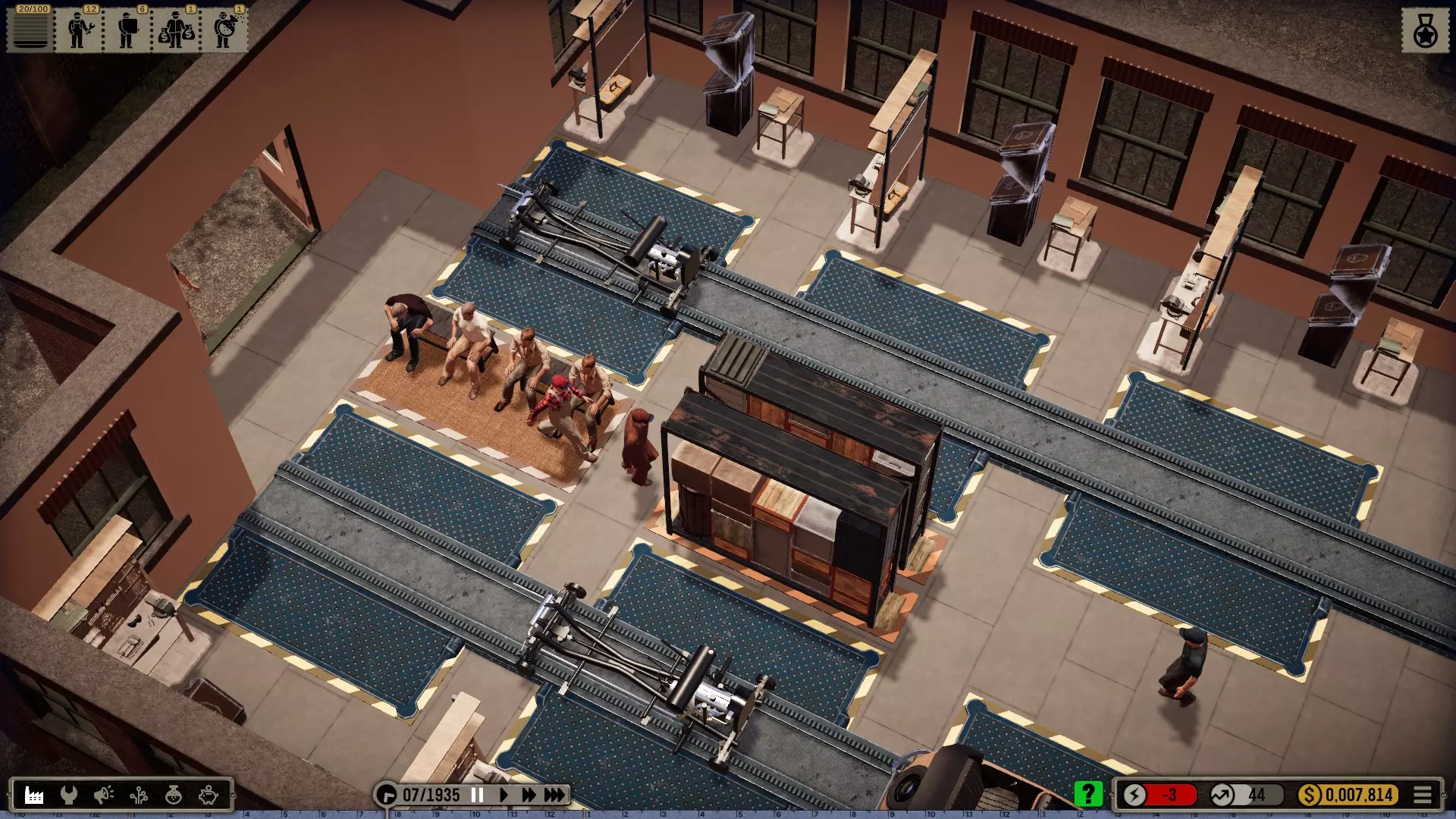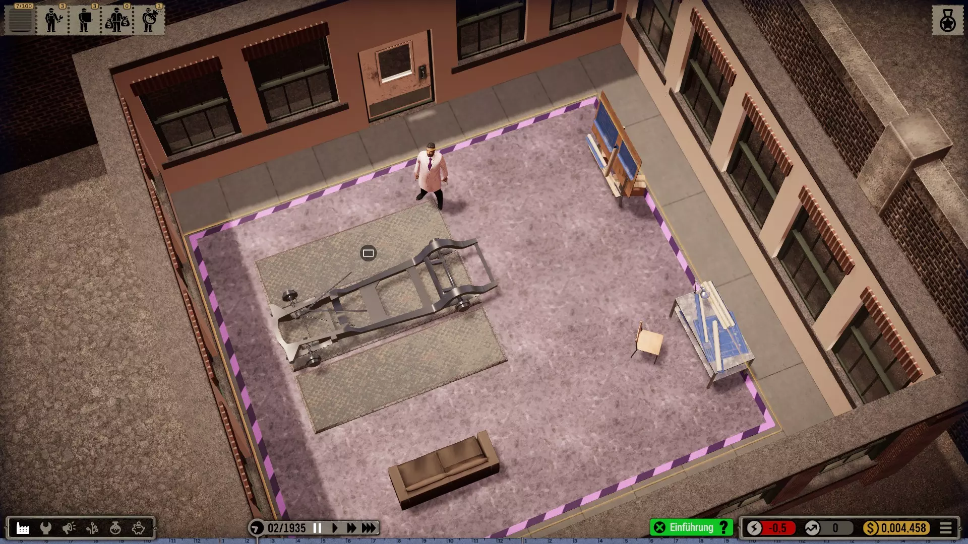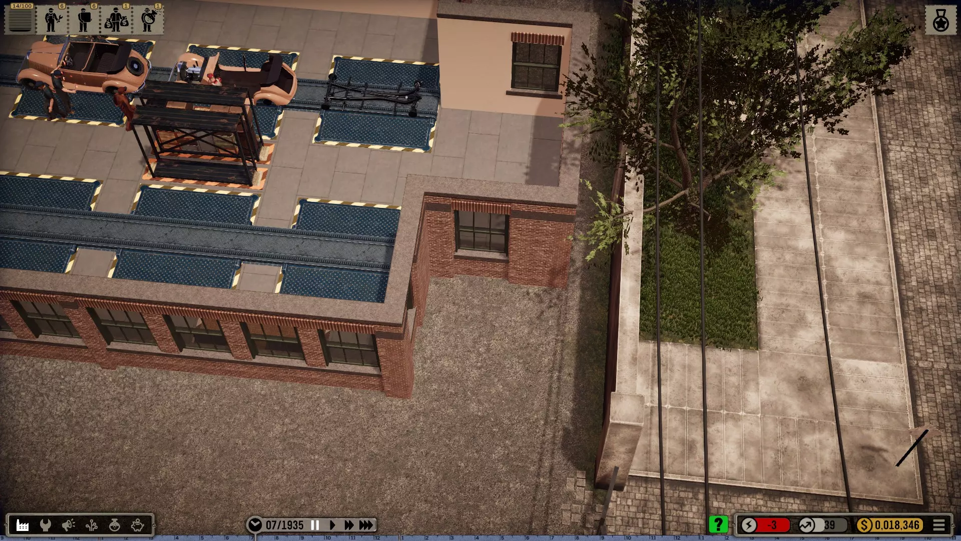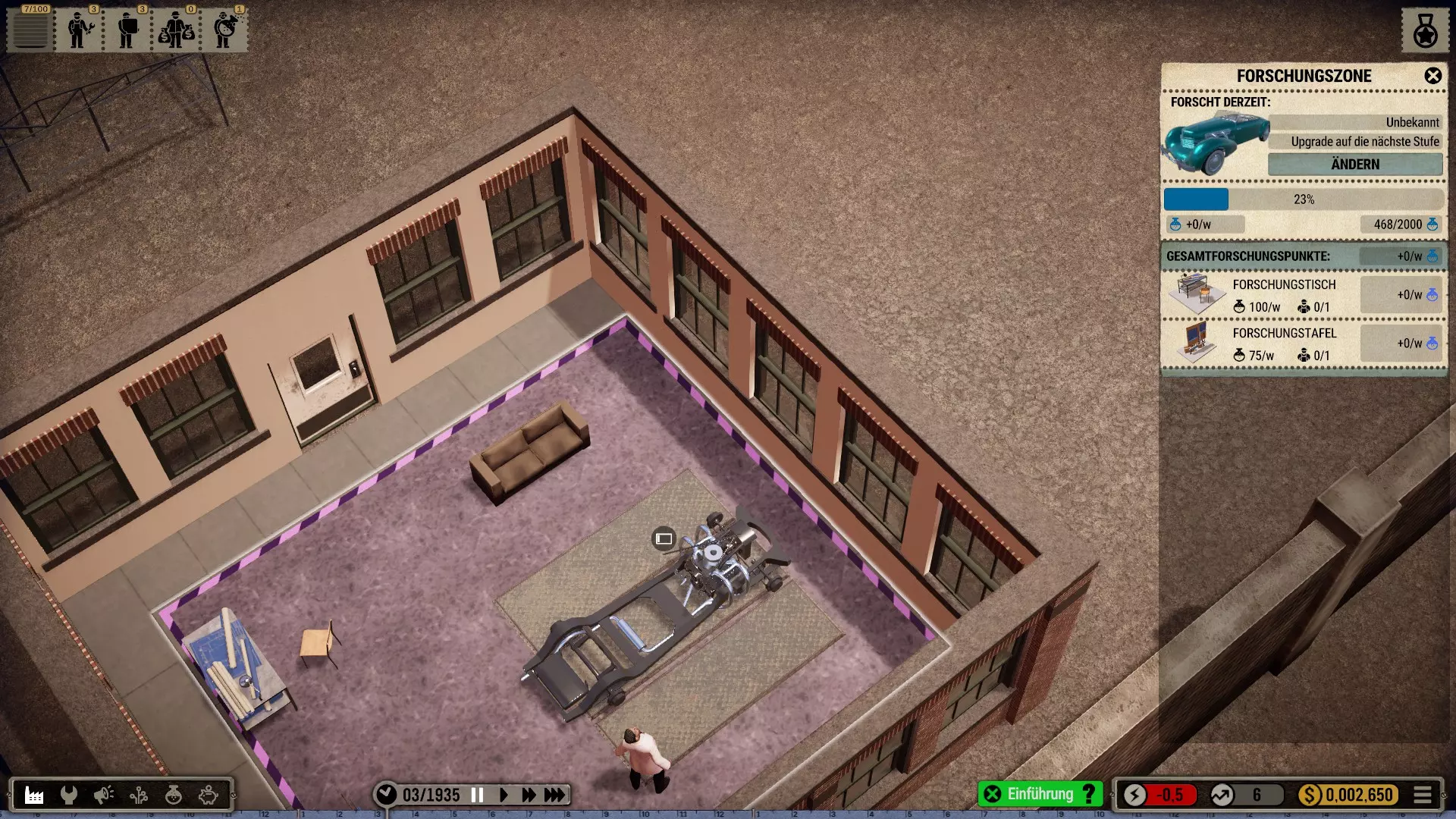 那么我选择在一个有足够空间建造大型厂房的城市开始,并将起始年份设定为1935年(因为这在历史角度来看相当准确)。 整个科技树在游戏开始时就会被解锁——这是个例外情况(主要是为了尝试一下,但也是因为从长远来看,连最简单的设备都要花钱解锁实在是既愚蠢又无聊。开发者或许可以在未来加入其他解决方案,比如让研究人员兼任其他工作,或者通过行政人员、部门主管等来实现)。 当然,我也有可能破产(不过应该不会发生,毕竟我已经有一些经验了)。我的规则——我个人的游戏难度设定 为了避免游戏过于简单或千篇一律: 发挥想象力的同时,尽量保持一定的历史准确性或至少符合现实逻辑 所有员工均严格按照申请顺序录用,不考虑其等级,且薪资按期望标准发放 员工不会升级,将始终保持录用时的状态,即使过程艰难也坚持如此 坦然接受一切,尽力做到最好(这方法很有效,一直都很管用) 允许一定的创作自由(也允许轻微违反规则) 不要急于求成,享受细节!中等游戏速度就足够了,除非我觉得太慢开始吧: 开端,第一部分 (使用游戏版本1.0.1c进行游玩)