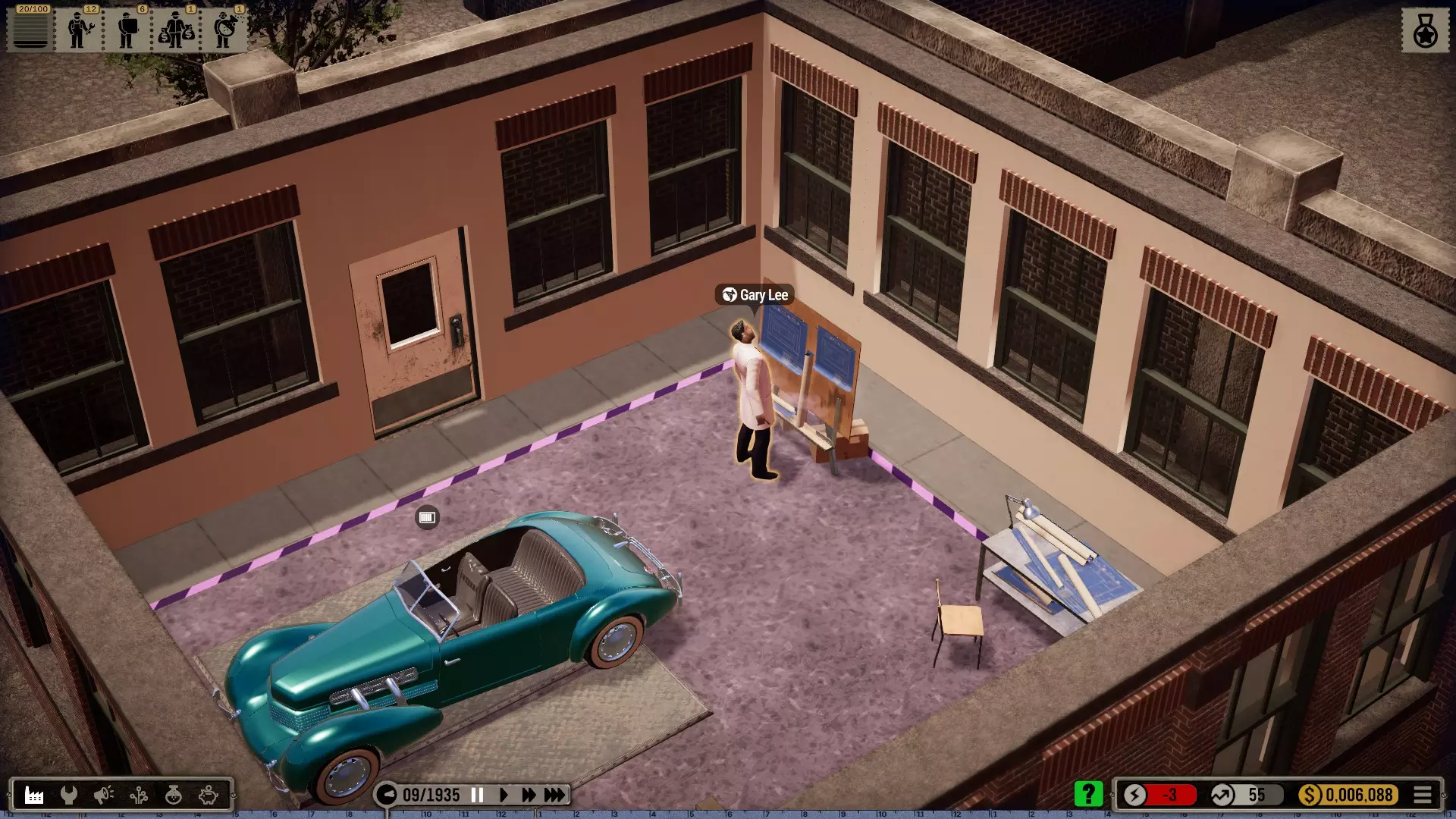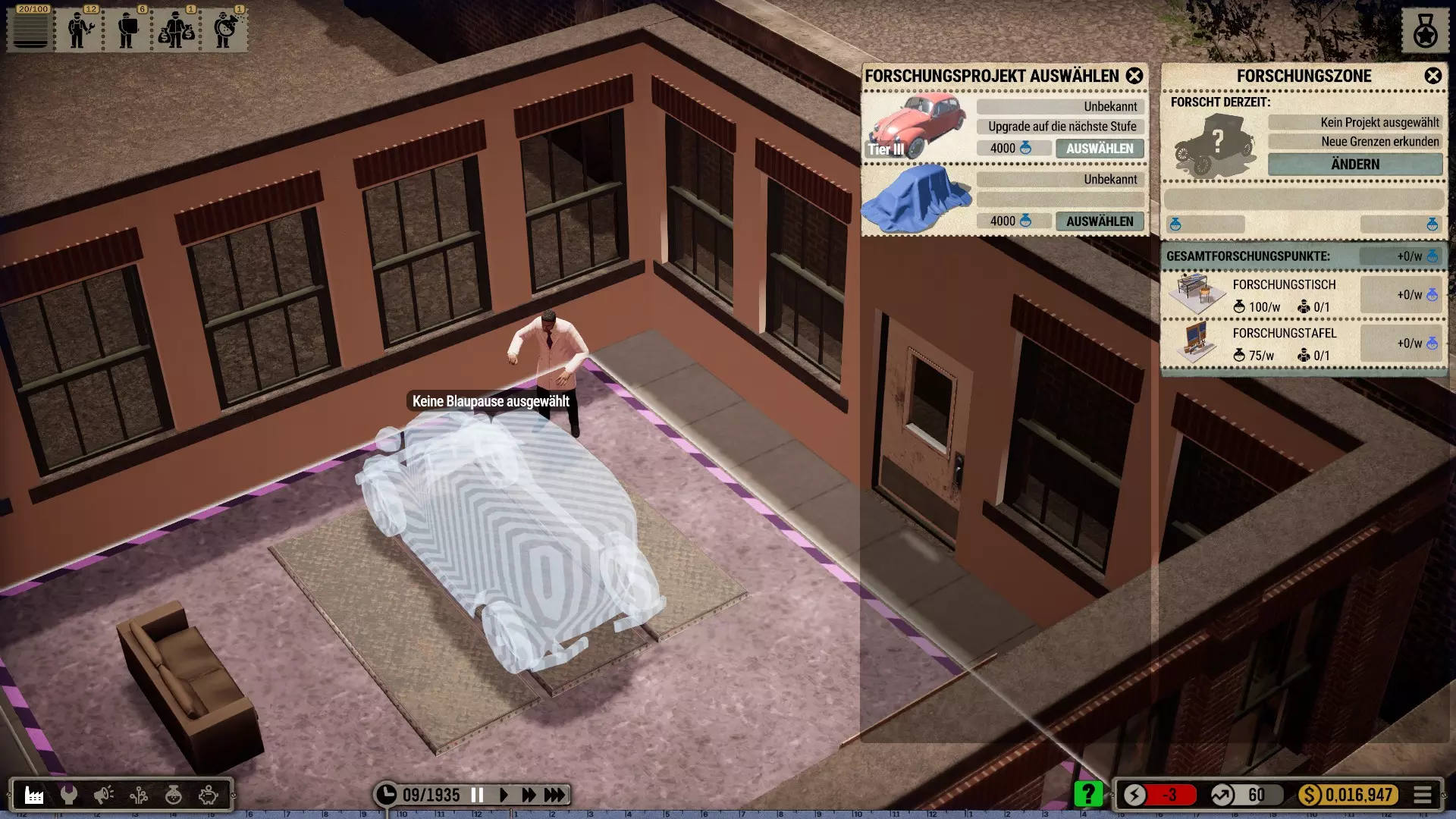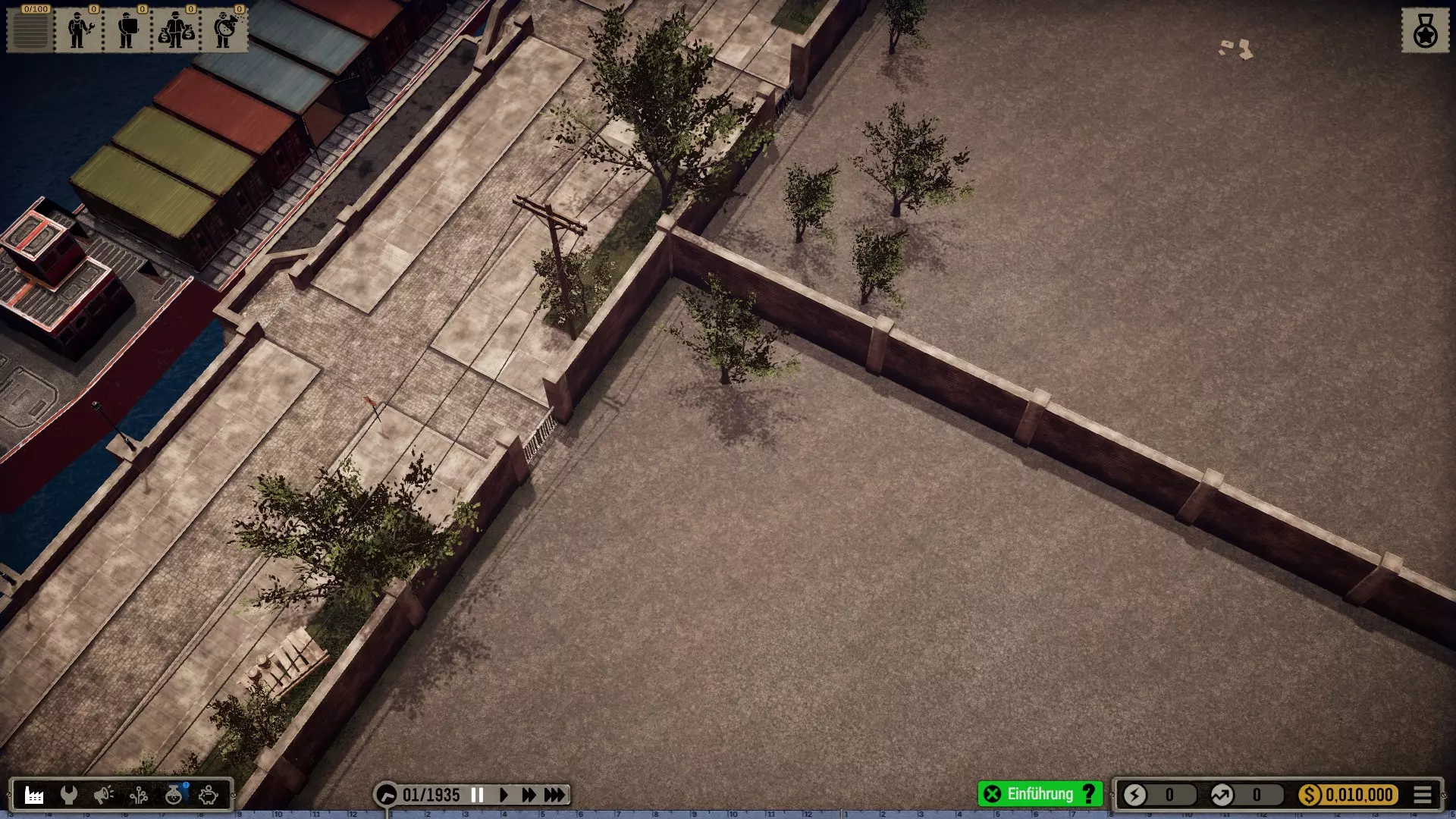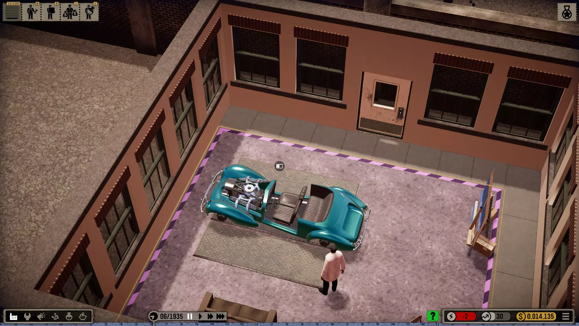 那么我选择在一个有足够空间建造大型厂房的城市开始,并将起始年份设定为1935年(因为这在历史角度来看相当准确)。 整个科技树在游戏开始时就会被解锁——这是个例外情况(主要是为了尝试一下,但也是因为从长远来看,连最简单的设备都要花钱解锁实在是既愚蠢又无聊。开发者或许可以在未来加入其他解决方案,比如让研究人员兼任其他工作,或者通过行政人员、部门主管等来实现)。 当然,我也有可能破产(不过应该不会发生,毕竟我已经有一些经验了)。我的规则——我个人的游戏难度设定 为了避免游戏过于简单或千篇一律: 发挥想象力的同时,尽量保持一定的历史准确性或至少符合现实逻辑 所有员工均严格按照申请顺序录用,不考虑其等级,且薪资按期望标准发放 员工不会升级,将始终保持录用时的状态,即使过程艰难也坚持如此 坦然接受一切,尽力做到最好(这方法很有效,一直都很管用) 允许一定的创作自由(也允许轻微违反规则) 不要急于求成,享受细节!中等游戏速度就足够了,除非我觉得太慢开始吧: 开端,第一部分 (使用游戏版本1.0.1c进行游玩)