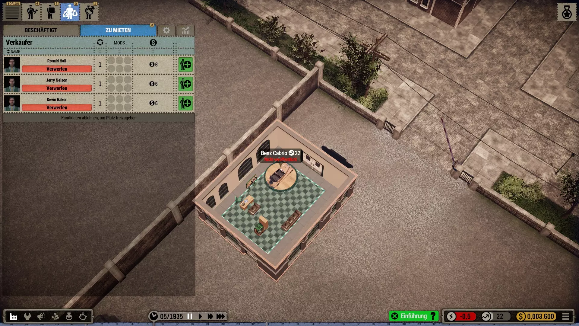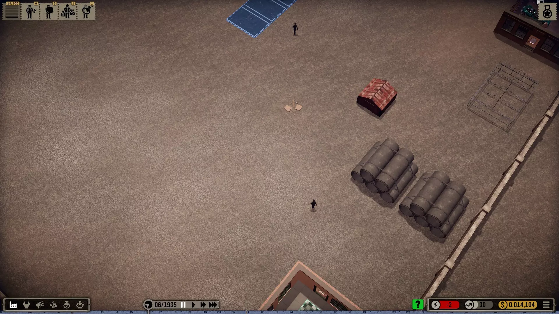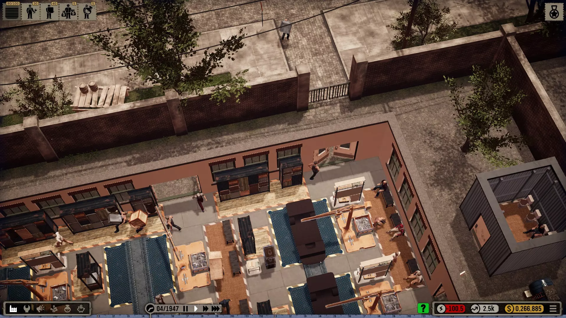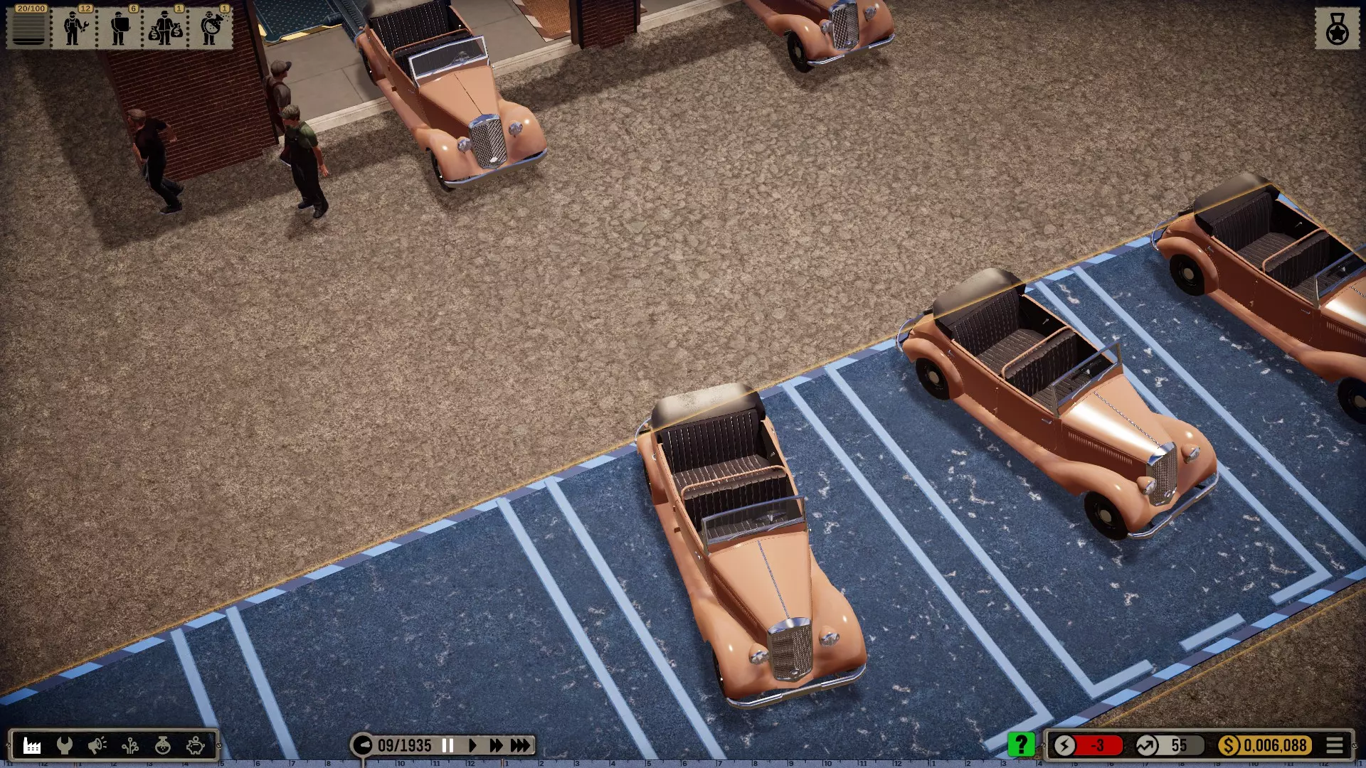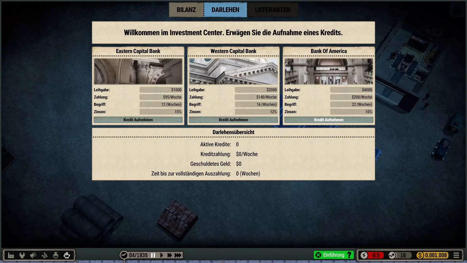 那么我选择在一个有足够空间建造大型厂房的城市开始,并将起始年份设定为1935年(因为这在历史角度来看相当准确)。 整个科技树在游戏开始时就会被解锁——这是个例外情况(主要是为了尝试一下,但也是因为从长远来看,连最简单的设备都要花钱解锁实在是既愚蠢又无聊。开发者或许可以在未来加入其他解决方案,比如让研究人员兼任其他工作,或者通过行政人员、部门主管等来实现)。 当然,我也有可能破产(不过应该不会发生,毕竟我已经有一些经验了)。我的规则——我个人的游戏难度设定 为了避免游戏过于简单或千篇一律: 发挥想象力的同时,尽量保持一定的历史准确性或至少符合现实逻辑 所有员工均严格按照申请顺序录用,不考虑其等级,且薪资按期望标准发放 员工不会升级,将始终保持录用时的状态,即使过程艰难也坚持如此 坦然接受一切,尽力做到最好(这方法很有效,一直都很管用) 允许一定的创作自由(也允许轻微违反规则) 不要急于求成,享受细节!中等游戏速度就足够了,除非我觉得太慢开始吧: 开端,第一部分 (使用游戏版本1.0.1c进行游玩)