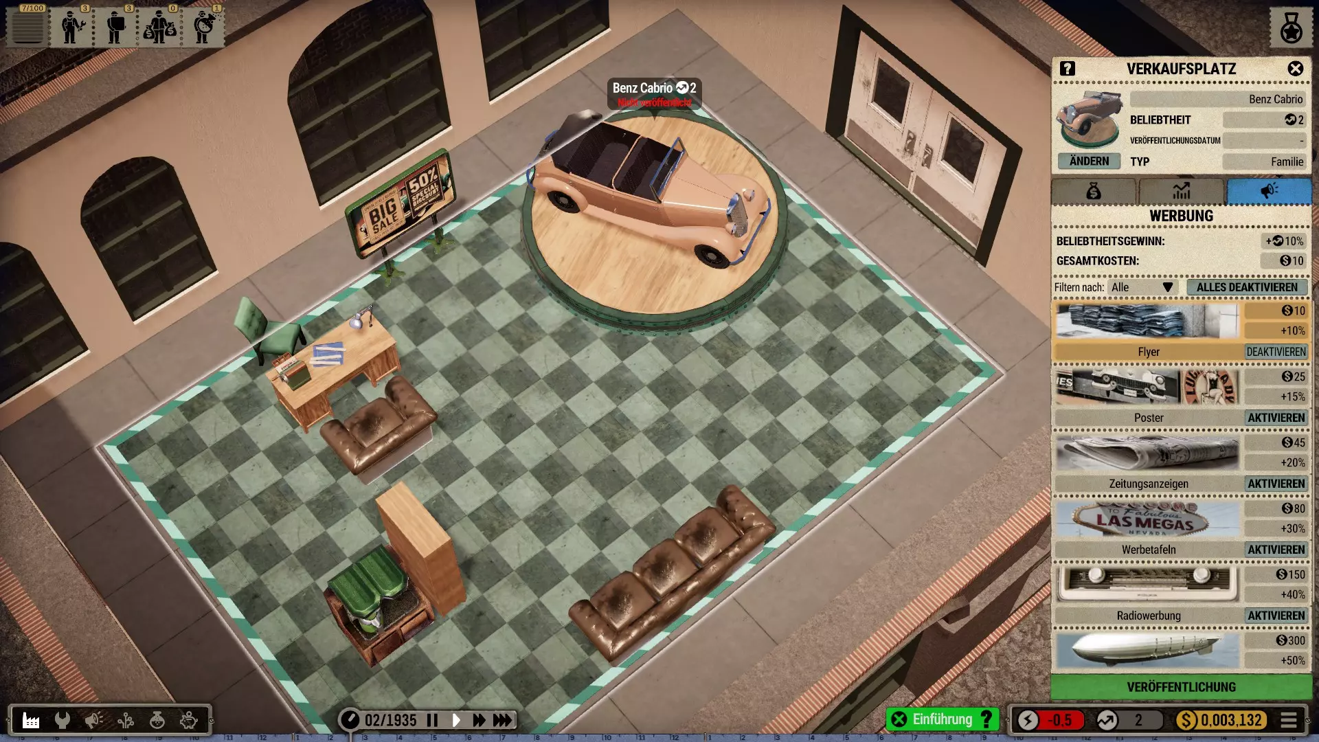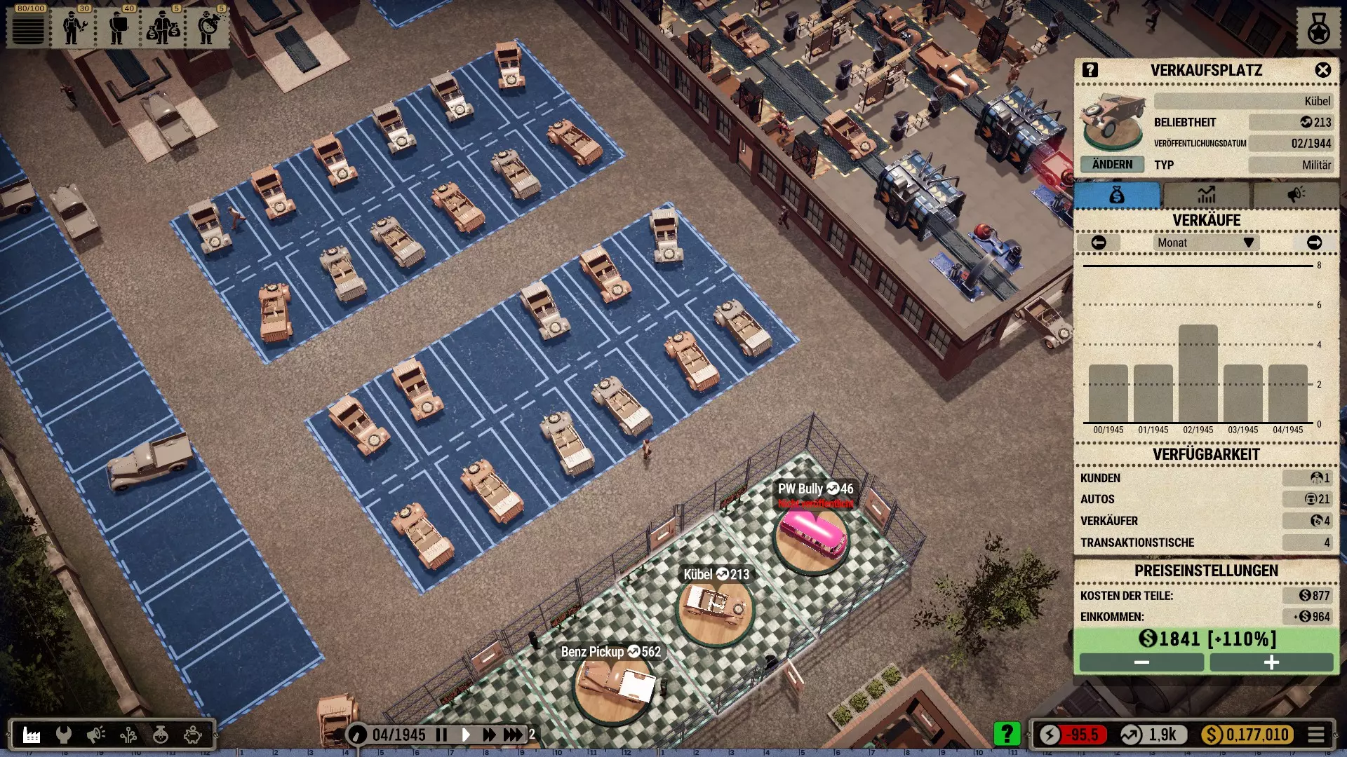 价格:游戏中同样适用供求原理:只有在停车场已满时才应降价。如果库存较少,即使需求(受欢迎度)下降,你也可以收取高价。停车位成本几乎为零,因此除非你打算淘汰该车型,否则不要过早出售停车位。