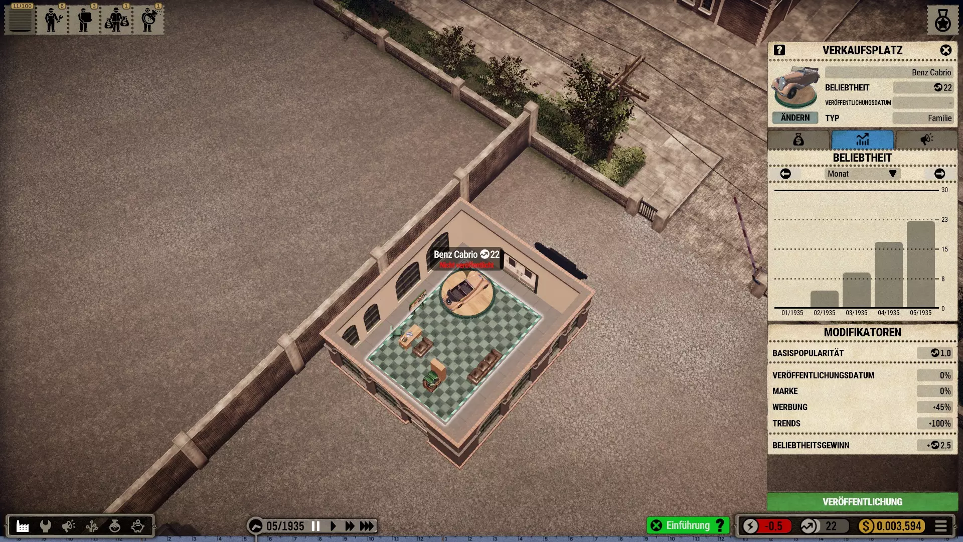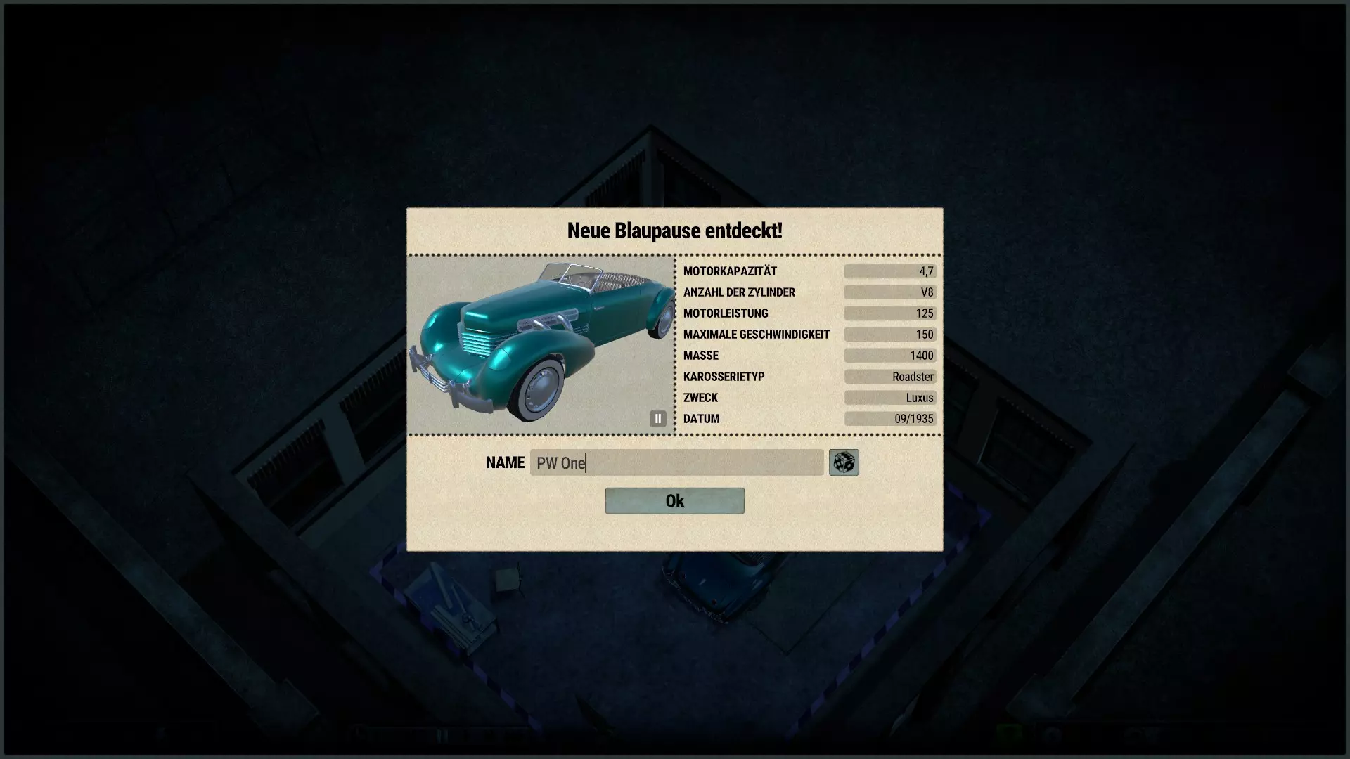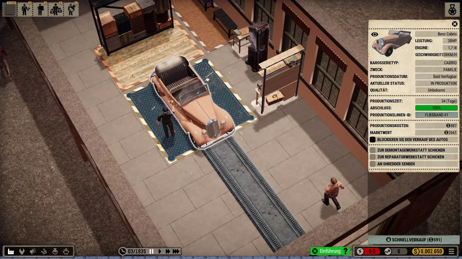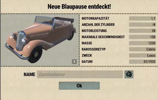 这真是第一个惊喜:通常(在游戏起始年份1885年时)第一辆汽车总是处于第XI级,我起初以为等级是和年份一一对应的。 但当然,同一时间总会存在多个不同的开发等级。 (顺便说一下,这是一辆梅赛德斯-奔驰170 V——一款畅销车型,生产于1936-1953年) 好吧,那他得先让工厂生产这款车。为此,他让人在港口入口处直接建造了一个小型但设备精良的厂房,并在主入口附近建了一个销售办事处。然后他开始凭记忆绘制一款面向大众的经济型汽车的设计图:
