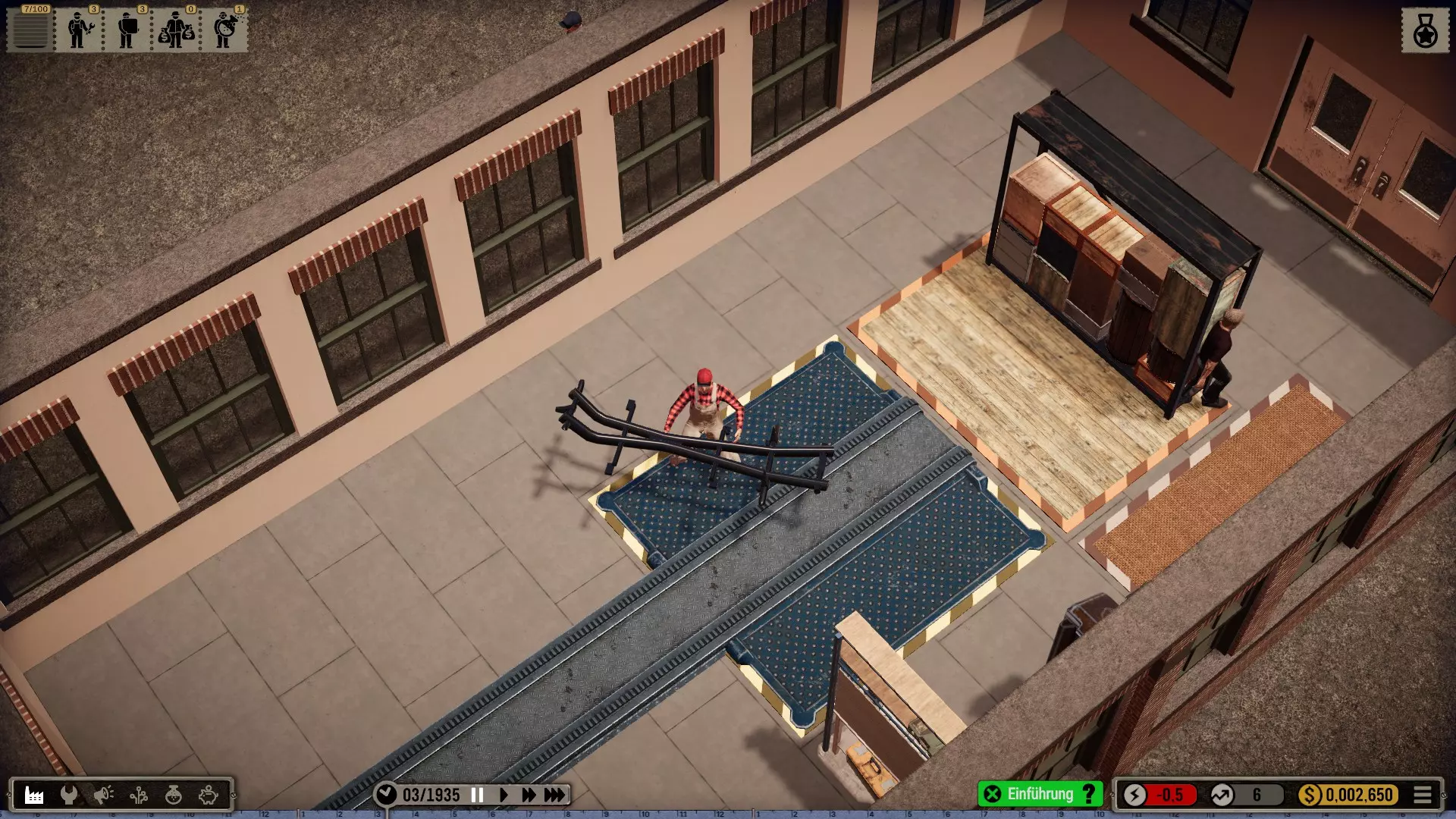 绕行问题:当机械师搬运零件时(仅在此时),他们会避开传送带或进入其他工作站。因此,他们有时会绕远路绕过整个生产线,以安全到达自己工作站的另一侧。这种情况下,唯一的解决办法是用某种物体阻挡这种绕行。从第一个工作站到旁边墙壁放置一段(无用的)传送带是最简单的解决方法。(之后,在紧凑的布局中,所有顶级工具都放在工作站上,且与相邻传送带之间没有间隙,通常无需此技巧就能自然阻挡绕行。) 物流建议:有时无法通过运输机避免长距离运输。所以不要让运输机过于频繁地运行:一旦有足够资金,就增加订单数量。但不要过度囤货,大量的零件库存会花费很多钱!